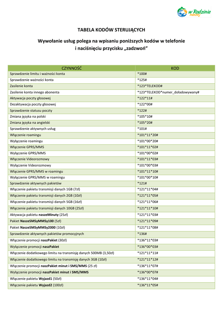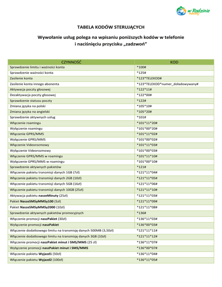 TABELA KODÓW STERUJĄCYCH Wywołanie usług polega na wpisaniu poniższych kodów w telefonie i naciśnięciu przycisku „zadzwoń” CZYNNOŚĆ KOD Sprawdzenie limitu i ważności konta *100# Sprawdzenie ważności konta *125# Zasilenie konta *123*TELEKOD# Zasilenie konta innego abonenta *123*TELEKOD*numer_doładowywany# Aktywacja poczty głosowej *122*11# Dezaktywacja poczty głosowej *122*00# Sprawdzenie statusu poczty *122# Zmiana języka na polski *105*10# Zmiana języka na angielski *105*20# Sprawdzenie aktywnych usług *101# Włączenie roamingu *101*11*20# Wyłączenie roamingu *101*00*20# Włączenie GPRS/MMS *101*11*02# Wyłączenie GPRS/MMS *101*00*02# Włączenie Videorozmowy *101*11*03# Wyłączenie Videorozmowy *101*00*03# Włączenie GPRS/MMS w roamingu *101*11*10# Wyłączenie GPRS/MMS w roamingu *101*00*10# Sprawdzenie aktywnych pakietów *121# Włączenie pakietu transmisji danych 1GB (7zł) *121*11*04# Włączenie pakietu transmisji danych 2GB (10zł) *121*11*05# Włączenie pakietu transmisji danych 5GB (16zł) *121*11*06# Włączenie pakietu transmisji danych 10GB (25zł) *121*11*10# Aktywacja pakietu naszeMinuty (25zł) *121*11*03# Pakiet NaszeSMSyMMSy100 (5zł) *121*11*09# Pakiet NaszeSMSyMMSy2000 (10zł) *121*11*08# Sprawdzenie aktywnych pakietów promocyjnych *136# Włączenie promocji naszPakiet (30zł) *136*11*03# Wyłączenie promocji naszPakiet *136*00*03# Włączenie dodatkowego limitu na transmisję danych 500MB (3,50zł) *121*11*11# Włączenie dodatkowego limitu na transmisję danych 3GB (10zł) *121*11*12# Włączenie promocji naszPakiet minut i SMS/MMS (25 zł) *136*11*07# Wyłączenie promocji naszPakiet minut i SMS/MMS *136*00*07# Włączenie pakietu Wyjazd1 (50zł) *136*11*04# Włączenie pakietu Wyjazd2 (100zł) *136*11*05#