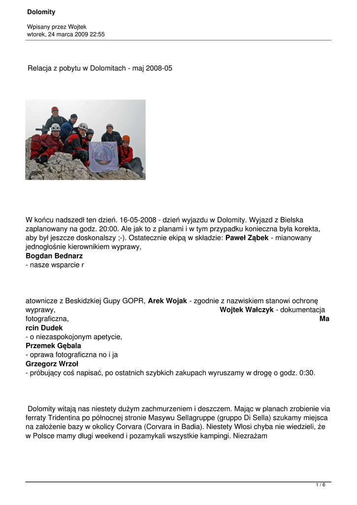 Dolomity Wpisany przez Wojtek wtorek, 24 marca 2009 22:55 Relacja z pobytu w Dolomitach - maj 2008-05 W końcu nadszedł ten dzień. 16-05-2008 - dzień wyjazdu w Dolomity. Wyjazd z Bielska zaplanowany na godz. 20:00. Ale jak to z planami i w tym przypadku konieczna była korekta, aby był jeszcze doskonalszy ;-). Ostatecznie ekipą w składzie: Paweł Ząbek - mianowany jednogłośnie kierownikiem wyprawy, Bogdan Bednarz - nasze wsparcie r atownicze z Beskidzkiej Gupy GOPR, Arek Wojak - zgodnie z nazwiskiem stanowi ochronę wyprawy, Wojtek Wałczyk - dokumentacja fotograficzna, Ma rcin Dudek - o niezaspokojonym apetycie, Przemek Gębala - oprawa fotograficzna no i ja Grzegorz Wrzoł - próbujący coś napisać, po ostatnich szybkich zakupach wyruszamy w drogę o godz. 0:30. Dolomity witają nas niestety dużym zachmurzeniem i deszczem. Mając w planach zrobienie via ferraty Tridentina po północnej stronie Masywu Sellagruppe (gruppo Di Sella) szukamy miejsca na założenie bazy w okolicy Corvara (Corvara in Badia). Niestety Włosi chyba nie wiedzieli, że w Polsce mamy długi weekend i pozamykali wszystkie kampingi. Niezrażam 1/6 Dolomity Wpisany przez Wojtek wtorek, 24 marca 2009 22:55 y się jednak tymi drobnymi trudnościami i postanawiając dobrze się bawić rozbijamy się pod sztuczną ścianką ćwicząc przed prawdziwym wspinaniem. Ponieważ pogoda trochę zaburzyła nasz skrupulatnie opracowany przez Bogdana harmonogram postanawiamy rozbić się bliżej Marmolady czekając na okno pogodowe umożliwiające podjęcie próbę zaatakowania szczytu, który był naszym głównym celem. Ostatecznie udaje nam się znaleźć czynny kamping Marmolada w miejscowości Canazei (Canacei). Następnego dnia nie zważając na pogodę, w ramach rozgrzewki i aklimatyzacji decydujemy się na mały spacer po sąsiednich górkach z nadzieją, że pogoda się poprawi i pozwoli zapoznać się z pierwszą via ferratą Ferrata dei Finanzieri prowadzącą na szczyt Colac (2715 mnpm). Pogoda jednak nie jest dla nas łaskawa. Idąc większość drogi w deszczu przemoczeni docieramy jedynie do górnej stacji kolejki gondolowej stacji narciarskiej nazwijmy ją Crepa Neigra Ciampac (ładnie brzmi) na wysokość 2170 mnpm. Dalsza wędrówka w górę przy takiej pogodzie nie miała sensu. Korzystając z chwilowych przejaśnień podsuszamy ciuchy, posilamy się i użyczywszy sobie pozostawione przy nieczynnej restauracji leżaki nabieramy sił obserwując spadające lawiny z góry na którą mieliśmy nadzieję wyjść. Po dłuższej przerwie wracamy tym samym szlakiem. Tak minął drugi dzień pobytu w Dolomitach. No może niezupełnie, ponieważ do wieczora pozostało trochę czasu do zagospodarowania, który wykorzystaliśmy na posmakowanie tutejszych win. Prognoza pogody na następny dzień zapowiadała, że rano powinno być w miarę ładnie. Pogorszenie pogody miało nastąpić dopiero po południu. Zamierzając wykorzystać chwilową dobrą pogodę szef zarządza wczesną pobudkę i wyruszenie na szlak o godz. 6:00. Straszył nawet, że osobiście wszystkich pobudzi, ale na straszeniu się skończyło. Na szczęście ekipa była bardzo zdyscyplinowana i aż rwała się w góry, tak że o 6:00 wszyscy byli gotowi do wymarszu, z jednym wyjątkiem. Mnie niestety wczorajszy dzień trochę zaszkodził i zdecydowałem się na kurację aby nabrać sił na kolejne dni. Jak się później okazało ominęła mnie jedna z ciekawszych wypraw tego wyjazdu. Prognoza pogody nie kłamała. Zazdrościłem reszcie wspaniałych widoków. Na ten dzień zaplanowaliśmy dwie alternatywne trasy: Via Ferrata delle Trincee - szczyt La Mesola (2727 mnpm) - przejście do Biwaku Bontadini (2552 mnpm) i zejście do parkingu przy jeziorze Lago di Fedaia. Via Ferrata Santner - obejście masywu Rosengartenspitze Cima Catiraccio (2981 mnpm) powrót przez przełęcz P.so delle Coronelle dalej Tschager Joch do punktu wyjścia. Ostatecznie już w drodze wybrali wariant 1. Po powrocie opowieściom nie było końca. Zdania czy udało się przejść całą via ferratę były podzielone. Ostatecznie po zebraniu wszystkich dowodów ustalono, że wg mapy ferrata oparła się zdobywcom, natomiast wg przewodnika ferrata została zaliczona. Podczas wyprawy nie obyło się bez przygód. Pobłądziwszy nieco na szczycie La Mesola, o mały włos nie tracąc liny, nie mogąc odnaleźć w śniegu szlaku i zabezpieczeń na własnej asekuracji musieli ewakuować się ze szczytu i skrótami na około dotarli do zupełnie innego szlaku. Wszystko zakończyło się jednak szczęśliwie i wykończeni lecz zadowoleni wrócili do bazy. Prognoza pogody na następny dzień (to już wtorek) mówiła o deszczu przez cały dzień. 2/6 Dolomity Wpisany przez Wojtek wtorek, 24 marca 2009 22:55 Dlatego też na ten dzień zaplanowaliśmy przerwę na suszenie ciuchów i lizanie ran z poprzedniego dnia. Przez całą noc padało i nic nie wskazywało, że wciągu dnia będzie inaczej. Kiedy się obudziliśmy ku naszemu zdziwieniu przywitało nas jednak słoneczko. Niestety nie świeciło zbyt długo. O 12:00 znowu zaczęło padać. Czyli do wieczorka wino, k...(ar)ty i śpiew J. Wino smakowało coraz bardziej, było coraz weselej, ale szef zarządził marsz do łóżek. Jutro pobudka o godz. 1:00 i wymarsz z zamiarem zdobycia Marmolady. O dziwo pomimo udanej imprezy poprzedniego dnia wszyscy o 1:00 byli na nogach. Po szybkim śniadaniu o 2:20 byliśmy już na szlaku. Wyjście z miejscowości Penia. Początkowo ostro pod górę pokonując ok. 250 m przewyższenia, później już spokojnie doliną Val Di Contrin w kierunku schroniska Rif. Contrin. Od schroniska do przełęczy Forc. La dell Marmolada znowu ostro pod górę. Po 4 godzinach marszu przy świetle czołówek dotarliśmy do przełęczy gdzie jak się nam wydawało powinna zaczynać się Via Rerrata Marmolada prowadząca na szczyt Punta di Penia (3343 mnpm). Niestety z powodu niskiego pułapu chmur i zalegającego o