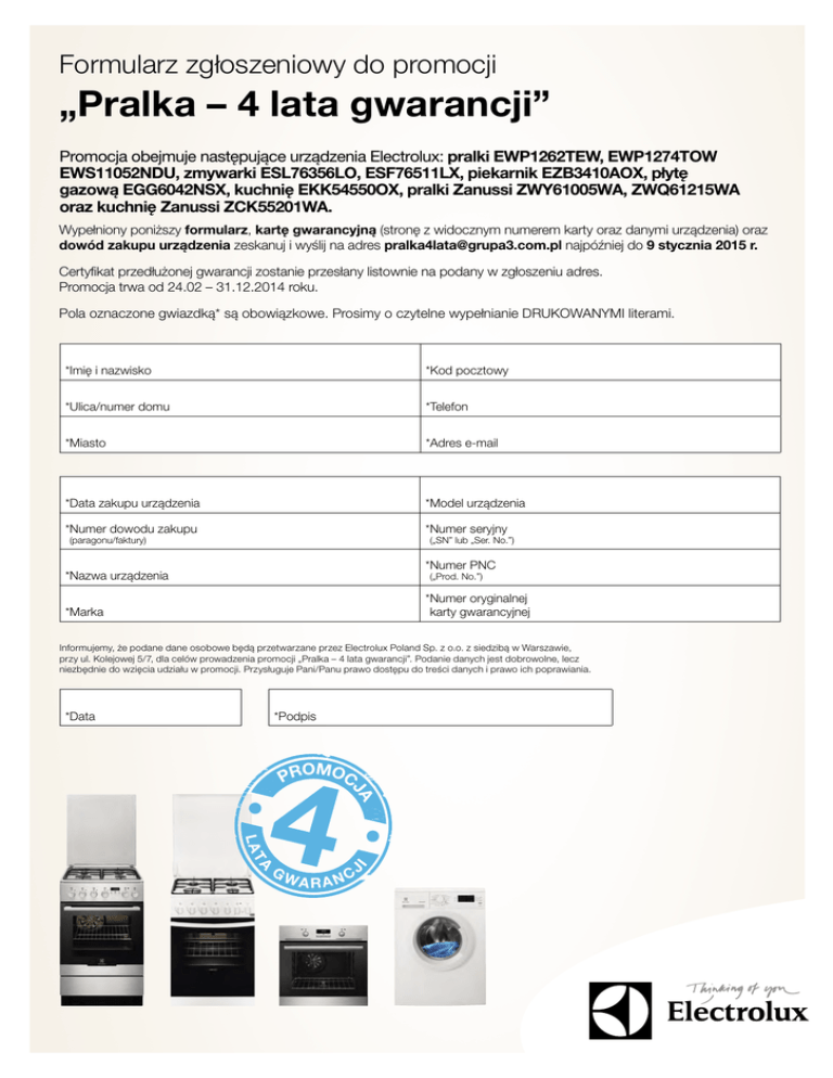 Formularz zgłoszeniowy do promocji „Pralka – 4 lata gwarancji” Promocja obejmuje następujące urządzenia Electrolux: pralki EWP1262TEW, EWP1274TOW EWS11052NDU, zmywarki ESL76356LO, ESF76511LX, piekarnik EZB3410AOX, płytę gazową EGG6042NSX, kuchnię EKK54550OX, pralki Zanussi ZWY61005WA, ZWQ61215WA oraz kuchnię Zanussi ZCK55201WA. Wypełniony poniższy formularz, kartę gwarancyjną (stronę z widocznym numerem karty oraz danymi urządzenia) oraz dowód zakupu urządzenia zeskanuj i wyślij na adres [email protected] najpóźniej do 9 stycznia 2015 r. Certyfikat przedłużonej gwarancji zostanie przesłany listownie na podany w zgłoszeniu adres. Promocja trwa od 24.02 – 31.12.2014 roku. Pola oznaczone gwiazdką* są obowiązkowe. Prosimy o czytelne wypełnianie DRUKOWANYMI literami. *Imię i nazwisko *Kod pocztowy *Ulica/numer domu *Telefon *Miasto *Adres e-mail *Data zakupu urządzenia *Model urządzenia *Numer dowodu zakupu *Numer seryjny (paragonu/faktury) („SN” lub „Ser. No.”) *Numer PNC *Nazwa urządzenia („Prod. No.”) *Numer oryginalnej karty gwarancyjnej *Marka Informujemy, że podane dane osobowe będą przetwarzane przez Electrolux Poland Sp. z o.o. z siedzibą w Warszawie, przy ul. Kolejowej 5/7, dla celów prowadzenia promocji „Pralka – 4 lata gwarancji”. Podanie danych jest dobrowolne, lecz niezbędnie do wzięcia udziału w promocji. Przysługuje Pani/Panu prawo dostępu do treści danych i prawo ich poprawiania. *Data *Podpis OMOC PR JA A J I LAT GW ARANC
