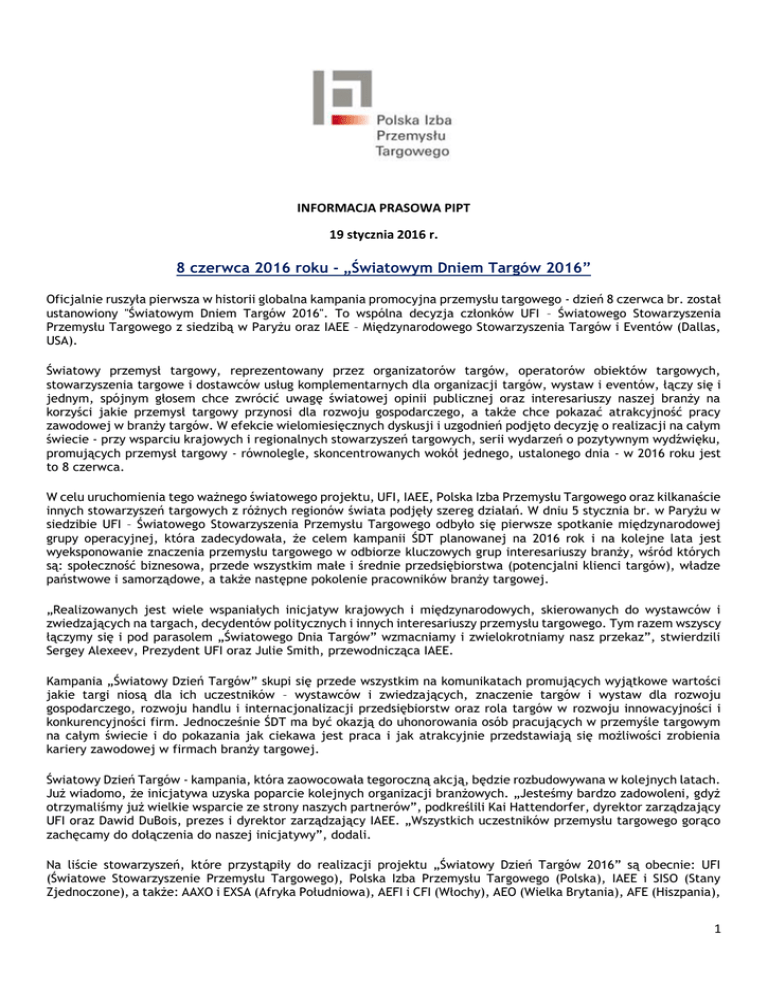 INFORMACJA PRASOWA PIPT 19 stycznia 2016 r. 8 czerwca 2016 roku - „Światowym Dniem Targów 2016” Oficjalnie ruszyła pierwsza w historii globalna kampania promocyjna przemysłu targowego - dzień 8 czerwca br. został ustanowiony "Światowym Dniem Targów 2016". To wspólna decyzja członków UFI – Światowego Stowarzyszenia Przemysłu Targowego z siedzibą w Paryżu oraz IAEE – Międzynarodowego Stowarzyszenia Targów i Eventów (Dallas, USA). Światowy przemysł targowy, reprezentowany przez organizatorów targów, operatorów obiektów targowych, stowarzyszenia targowe i dostawców usług komplementarnych dla organizacji targów, wystaw i eventów, łączy się i jednym, spójnym głosem chce zwrócić uwagę światowej opinii publicznej oraz interesariuszy naszej branży na korzyści jakie przemysł targowy przynosi dla rozwoju gospodarczego, a także chce pokazać atrakcyjność pracy zawodowej w branży targów. W efekcie wielomiesięcznych dyskusji i uzgodnień podjęto decyzję o realizacji na całym świecie - przy wsparciu krajowych i regionalnych stowarzyszeń targowych, serii wydarzeń o pozytywnym wydźwięku, promujących przemysł targowy - równolegle, skoncentrowanych wokół jednego, ustalonego dnia - w 2016 roku jest to 8 czerwca. W celu uruchomienia tego ważnego światowego projektu, UFI, IAEE, Polska Izba Przemysłu Targowego oraz kilkanaście innych stowarzyszeń targowych z różnych regionów świata podjęły szereg działań. W dniu 5 stycznia br. w Paryżu w siedzibie UFI – Światowego Stowarzyszenia Przemysłu Targowego odbyło się pierwsze spotkanie międzynarodowej grupy operacyjnej, która zadecydowała, że celem kampanii ŚDT planowanej na 2016 rok i na kolejne lata jest wyeksponowanie znaczenia przemysłu targowego w odbiorze kluczowych grup interesariuszy branży, wśród których są: społeczność biznesowa, przede wszystkim małe i średnie przedsiębiorstwa (potencjalni klienci targów), władze państwowe i samorządowe, a także następne pokolenie pracowników branży targowej. „Realizowanych jest wiele wspaniałych inicjatyw krajowych i międzynarodowych, skierowanych do wystawców i zwiedzających na targach, decydentów politycznych i innych interesariuszy przemysłu targowego. Tym razem wszyscy łączymy się i pod parasolem „Światowego Dnia Targów” wzmacniamy i zwielokrotniamy nasz przekaz”, stwierdzili Sergey Alexeev, Prezydent UFI oraz Julie Smith, przewodnicząca IAEE. Kampania „Światowy Dzień Targów” skupi się przede wszystkim na komunikatach promujących wyjątkowe wartości jakie targi niosą dla ich uczestników – wystawców i zwiedzających, znaczenie targów i wystaw dla rozwoju gospodarczego, rozwoju handlu i internacjonalizacji przedsiębiorstw oraz rola targów w rozwoju innowacyjności i konkurencyjności firm. Jednocześnie ŚDT ma być okazją do uhonorowania osób pracujących w przemyśle targowym na całym świecie i do pokazania jak ciekawa jest praca i jak atrakcyjnie przedstawiają się możliwości zrobienia kariery zawodowej w firmach branży targowej. Światowy Dzień Targów - kampania, która zaowocowała tegoroczną akcją, będzie rozbudowywana w kolejnych latach. Już wiadomo, że inicjatywa uzyska poparcie kolejnych organizacji branżowych. „Jesteśmy bardzo zadowoleni, gdyż otrzymaliśmy już wielkie wsparcie ze strony naszych partnerów”, podkreślili Kai Hattendorfer, dyrektor zarządzający UFI oraz Dawid DuBois, prezes i dyrektor zarządzający IAEE. „Wszystkich uczestników przemysłu targowego gorąco zachęcamy do dołączenia do naszej inicjatywy”, dodali. Na liście stowarzyszeń, które przystąpiły do realizacji projektu „Światowy Dzień Targów 2016” są obecnie: UFI (Światowe Stowarzyszenie Przemysłu Targowego), Polska Izba Przemysłu Targowego (Polska), IAEE i SISO (Stany Zjednoczone), a także: AAXO i EXSA (Afryka Południowa), AEFI i CFI (Włochy), AEO (Wielka Brytania), AFE (Hiszpania), 1 AUMA i FAMAB (Niemcy), CEFA i CENTREX (Europa Środkowowschodnia), EEIA (UE), IECA (Indonezja), IEIA(Indie), LECA (Liban), RUEF (Rosja) i UNIMEV (Francja). Zainteresowani dołączeniem do kampanii UFI proszeni są o bezpośredni kontakt z siedzibą UFI w Paryżu – Christian Druart: [email protected] ****** O Polskiej Izbie Przemysłu Targowego Polska Izba Przemysłu Targowego, założona w 1993 roku, jest jedyną ogólnopolską organizacją – izbą gospodarczą, zrzeszająca przedsiębiorców prowadzących działalność gospodarczą w przemyśle targowym. Członkowie Polskiej Izby Przemysłu Targowego reprezentują przekrój wszystkich graczy rynku targowego. Są to przede wszystkim; organizatorzy targów, operatorzy obiektów targowo – konferencyjnych w Polsce, przedsiębiorstwa oferujące usługi w zakresie projektowania, budowy i wyposażania stoisk targowych oraz transportu i spedycji targowej, organizatorzy wystąpień polskich firm w targach za granicą oraz przedstawicielstwa targów zagranicznych w Polsce. Do Izby należą również firmy z branży reklamy i marketingu, media, przedsiębiorstwa gastronomiczne i firmy oferujące bazę noclegową. Cztery podstawowe obszary działania objęte programem działania Polskiej Izby Przemysłu Targowego to: lobbing, działania na rzecz integracji środowiska targowego, promocja targów - rozumiana szeroko - w tym działalność wydawnicza, edukacja w zakresie marketingu targowego, promowanie etycznych działań biznesowych w branży i działań na rzecz zrównoważonego rozwoju. Misją Polskiej Izby Przemysłu Targowego jest: służyć jako wszechstronna platforma współpracy wszystkich uczestników rynku targowego w Polsce, tworzyć skuteczną płaszczyznę działań lobbingowych na rzecz polskiego przemysłu targowego, promować udział w targach i wystawach jako skuteczny element strategii marketingowej i komunikacyjnej przedsiębiorstw, działać na rzecz podniesienia standardów usług targowych of