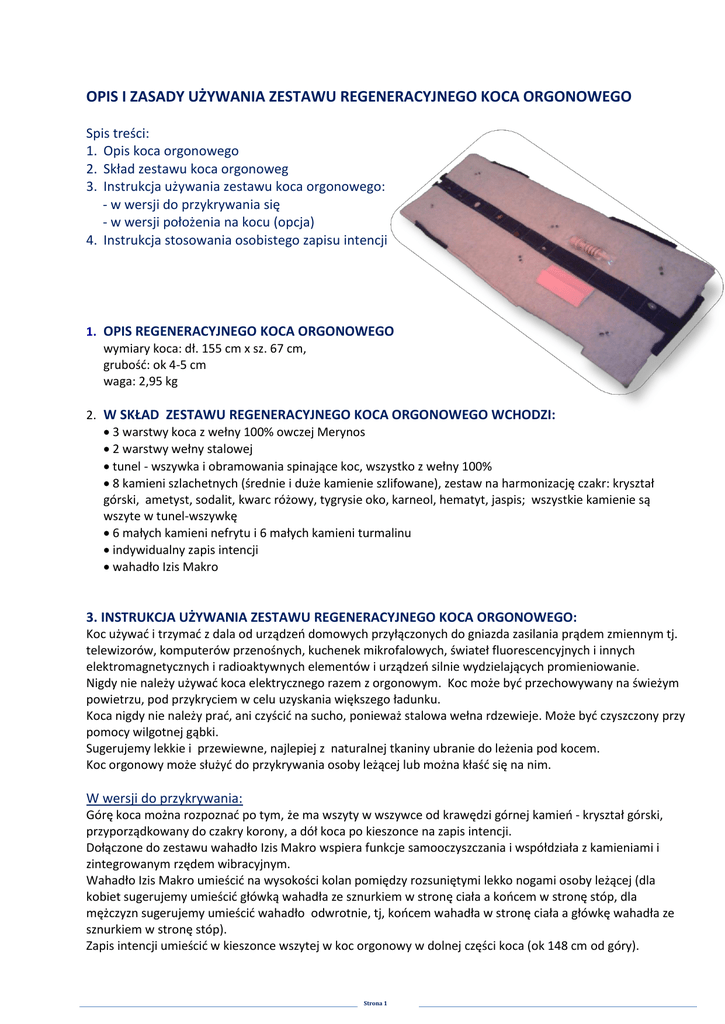 OPIS I ZASADY UŻYWANIA ZESTAWU REGENERACYJNEGO KOCA ORGONOWEGO Spis treści: 1. Opis koca orgonowego 2. Skład zestawu koca orgonoweg 3. Instrukcja używania zestawu koca orgonowego: - w wersji do przykrywania się - w wersji położenia na kocu (opcja) 4. Instrukcja stosowania osobistego zapisu intencji 1. OPIS REGENERACYJNEGO KOCA ORGONOWEGO wymiary koca: dł. 155 cm x sz. 67 cm, grubość: ok 4-5 cm waga: 2,95 kg 2. W SKŁAD ZESTAWU REGENERACYJNEGO KOCA ORGONOWEGO WCHODZI:  3 warstwy koca z wełny 100% owczej Merynos  2 warstwy wełny stalowej  tunel - wszywka i obramowania spinające koc, wszystko z wełny 100%  8 kamieni szlachetnych (średnie i duże kamienie szlifowane), zestaw na harmonizację czakr: kryształ górski, ametyst, sodalit, kwarc różowy, tygrysie oko, karneol, hematyt, jaspis; wszystkie kamienie są wszyte w tunel-wszywkę  6 małych kamieni nefrytu i 6 małych kamieni turmalinu  indywidualny zapis intencji  wahadło Izis Makro 3. INSTRUKCJA UŻYWANIA ZESTAWU REGENERACYJNEGO KOCA ORGONOWEGO: Koc używać i trzymać z dala od urządzeń domowych przyłączonych do gniazda zasilania prądem zmiennym tj. telewizorów, komputerów przenośnych, kuchenek mikrofalowych, świateł fluorescencyjnych i innych elektromagnetycznych i radioaktywnych elementów i urządzeń silnie wydzielających promieniowanie. Nigdy nie należy używać koca elektrycznego razem z orgonowym. Koc może być przechowywany na świeżym powietrzu, pod przykryciem w celu uzyskania większego ładunku. Koca nigdy nie należy prać, ani czyścić na sucho, ponieważ stalowa wełna rdzewieje. Może być czyszczony przy pomocy wilgotnej gąbki. Sugerujemy lekkie i przewiewne, najlepiej z naturalnej tkaniny ubranie do leżenia pod kocem. Koc orgonowy może służyć do przykrywania osoby leżącej lub można kłaść się na nim. W wersji do przykrywania: Górę koca można rozpoznać po tym, że ma wszyty w wszywce od krawędzi górnej kamień - kryształ górski, przyporządkowany do czakry korony, a dół koca po kieszonce na zapis intencji. Dołączone do zestawu wahadło Izis Makro wspiera funkcje samooczyszczania i współdziała z kamieniami i zintegrowanym rzędem wibracyjnym. Wahadło Izis Makro umieścić na wysokości kolan pomiędzy rozsuniętymi lekko nogami osoby leżącej (dla kobiet sugerujemy umieścić główką wahadła ze sznurkiem w stronę ciała a końcem w stronę stóp, dla mężczyzn sugerujemy umieścić wahadło odwrotnie, tj, końcem wahadła w stronę ciała a główkę wahadła ze sznurkiem w stronę stóp). Zapis intencji umieścić w kieszonce wszytej w koc orgonowy w dolnej części koca (ok 148 cm od góry). Strona 1 Sugerowany czas leżenia pod kocem ok. 30-40 min (może być nawet 2 x dziennie, w zależności od indywidualnego samopoczucia). Po zakończonej sesji pod kocem, zapis intencji wyjąć z kieszonki i naładować przez kilka sekund poprzez trzymanie kartki pomiędzy rękami (jedną ręką od góry, drugą od dołu, pośrodku rysunku). Po czym można umieścić własne zdjęcie pośrodku kartki z zapisem intencji, zawinąć i umieścić w kieszonce koca orgonowego. Wahadłem można wykonać kilka ruchów nad kocem -ruchem prawoskrętnym. Wahadło umieszczamy na kocu obok kieszonki z zapisem intencji (końcem wahadła w stronę dołu koca). W wersji położenia się na kocu (opcja): Przed położeniem na kocu należałoby wyjąć z tunelu-wszywki wszystkie kamienie, następnie po położeniu się na kocu można je umieścić na sobie, w miejscach odpowiadających czakrom. Górę koca można rozpoznać po tym, że ma wszyty w wszywce od krawędzi górnej kamień - kryształ górski, przyporządkowany do czakry korony, a dół rozpoznać po tym, że ma kieszonkę na intencję. Dołączone do zestawu wahadło Izis Makro wspiera funkcje samooczyszczania i współdziała z kamieniami i zintegrowanym rzędem wibracyjnym. Wahadło Izis Makro umieścić na wysokości kolan pomiędzy rozsuniętymi lekko nogami osoby leżącej (dla kobiet sugerujemy umieścić główką wahadła ze sznurkiem w stronę ciała a końcem w stronę stóp, dla mężczyzn sugerujemy umieścić wahadło odwrotnie, tj. końcem wahadła w stronę ciała a główkę wahadła ze sznurkiem w stronę stóp). Zapis intencji umieścić poniżej wahadła, pomiędzy stopami. Sugerowany czas leżenia na kocu ok. 30-40 min (indywidualnie) Po zakończonej sesji leżącej na kocu, zapis intencji naładować przez kilka sekund poprzez trzymanie kartki pomiędzy rękami (jedną ręką od góry, drugą od dołu, pośrodku rysunku). Po czym można umieścić własne zdjęcie pośrodku kartki z zapisem intencji, zawinąć i umieścić w kieszonce koca orgonowego. Wahadłem można wykonać kilka ruchów nad kocem -ruchem prawoskrętnym. Wahadło umieszczamy na kocu obok kieszonki z zapisem intencji (końcem wahadła w stronę dołu koca). 4. INSTRUKCJA STOSOWANIA OSOBISTEGO ZAPISU INTENCJI: Zapis intencji wykonany jest w formie rzędu wibracyjnego i stanowi całość z kocem orgonowym, dlatego: - w czasie odpoczynku z kocem orgonowym zaleca się umieszczanie złożonego zapisu intencji w kieszonce specjalnie dla tego celu wszytej w wierzchnią warstwę koca ( na wysokości ok. 148 cm od góry koca) - po sesji z kocem zapis intencji naładować przez kilka sekund poprzez trzymanie kartki pomiędzy rękami (jedną ręką od góry, drugą od dołu, pośrodku rysunku) - kiedy koc nie jest używany do odpoczynku, dobrze jest położyć swoje zdjęcie na środek rysunku do zapisu intencji, złożyć intencję i umieścić w kieszonce wszytej w koc na wierzchniej warstwie koca. W przypadku kiedy z koca korzysta rodzina, to taki złożony zapis intencji ze zdjęciem umieszczamy na kocu w dowolnym miejscu. Co zawiera zapis intencji w formie rzędu wibracyjnego? Mówiąc w skrócie zapis intencji w formie rzędu wibracyjnego służy do tzw "higieny energetycznej" danej osoby. Zapis intencji w wersji podstawowej aktywuje o
