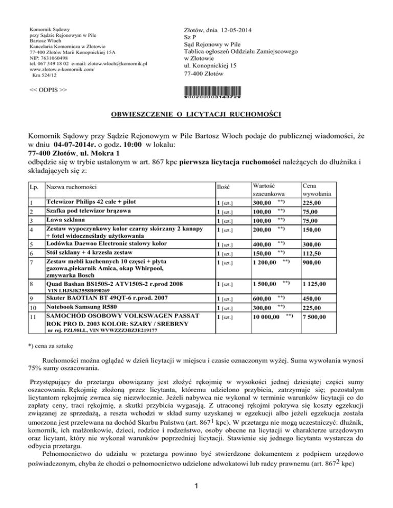 Komornik Sądowy przy Sądzie Rejonowym w Pile Bartosz Włoch Kancelaria Komornicza w Złotowie 77-400 Złotów Marii Konopnickiej 15A NIP: 7631060498 tel. 067 349 18 02 e-mail: [email protected] www.zlotow.e-komornik.com/ Km 524/12 Złotów, dnia 12-05-2014 Sz P Sąd Rejonowy w Pile Tablica ogłoszeń Oddziału Zamiejscowego w Złotowie ul. Konopnickiej 15 77-400 Złotów << ODPIS >> *0020000314372* OBWIESZCZENIE O LICYTACJI RUCHOMOŚCI Komornik Sądowy przy Sądzie Rejonowym w Pile Bartosz Włoch podaje do publicznej wiadomości, że w dniu 04-07-2014r. o godz. 10:00 w lokalu: 77-400 Złotów, ul. Mokra 1 odbędzie się w trybie ustalonym w art. 867 kpc pierwsza licytacja ruchomości należących do dłużnika i składających się z: 1 [szt.] 1 [szt.] 1 [szt.] 1 [szt.] Wartość szacunkowa 300,00 **) 100,00 **) 100,00 **) 200,00 **) Cena wywołania 225,00 75,00 75,00 150,00 1 [szt.] 1 [szt.] 1 [szt.] 400,00 **) 150,00 **) 1 200,00 **) 300,00 112,50 900,00 1 [szt.] 1 500,00 1 [szt.] 1 [szt.] 1 [szt.] 600,00 **) 300,00 **) 10 000,00 **) Lp. Nazwa ruchomości Ilość 1 2 3 4 Telewizor Philips 42 cale + pilot Szafka pod telewizor brązowa Ława szklana Zestaw wypoczynkowy kolor czarny skórzany 2 kanapy + fotel widoczneślady użytkowania Lodówka Daewoo Electronic stalowy kolor Stół szklany + 4 krzesła zestaw Zestaw mebli kuchennych 10 częsci + płyta gazowa,piekarnik Amica, okap Whirpool, zmywarka Bosch Quad Bashan BS150S-2 ATV150S-2 r.prod 2008 5 6 7 8 **) 1 125,00 .VIN LHJSJK2558B090269 9 10 11 Skuter BAOTIAN BT 49QT-6 r.prod. 2007 Notebook Samsung R580 SAMOCHÓD OSOBOWY VOLKSWAGEN PASSAT ROK PRO D. 2003 KOLOR: SZARY / SREBRNY 450,00 225,00 7 500,00 .nr rej. PZL98LL, VIN WVWZZZ3BZ3E219177 *) cena za sztukę Ruchomości można oglądać w dzień licytacji w miejscu i czasie oznaczonym wyżej. Suma wywołania wynosi 75% sumy oszacowania. Przystępujący do przetargu obowiązany jest złożyć rękojmię w wysokości jednej dziesiątej części sumy oszacowania. Rękojmię złożoną przez licytanta, któremu udzielono przybicia, zatrzymuje się; pozostałym licytantom rękojmię zwraca się niezwłocznie. Jeżeli nabywca nie wykonał w terminie warunków licytacji co do zapłaty ceny, traci rękojmię, a skutki przybicia wygasają. Z utraconej rękojmi pokrywa się koszty egzekucji związanej ze sprzedażą, a reszta wchodzi w skład sumy uzyskanej w egzekucji albo jeżeli egzekucja została umorzona jest przelewana na dochód Skarbu Państwa (art. 8671 kpc). W przetargu nie mogą uczestniczyć: dłużnik, komornik, ich małżonkowie, dzieci, rodzice i rodzeństwo, osoby obecne na licytacji w charakterze urzędowym oraz licytant, który nie wykonał warunków poprzedniej licytacji. Stawienie się jednego licytanta wystarcza do odbycia przetargu. Pełnomocnictwo do udziału w przetargu powinno być stwierdzone dokumentem z podpisem urzędowo poświadczonym, chyba że chodzi o pełnomocnictwo udzielone adwokatowi lub radcy prawnemu (art. 8672 kpc) 1 UWAGA: Licytacja może się nie odbyć bez podania przyczyny. Jeżeli drzwi będą zamknięte, będą otwierane na koszt i odpowiedzialność obowiązanegodłużnika. z up. Asesor Komorniczy z up. Aplikant Komorniczy Komornik Sądowy Karolina Wątrucka Daria Łojek BartoszWłoch Adresat oryginału:dłużnik Do wiadomości: 1. r.pr. Krzysztof Frasz Kancelaria Radcy Prawnego "Pro - Lex", 85-130 Bydgoszcz 2. r.pr. Piotr Nowosielski Kancelaria Radców Prawnych Nowosielski i Wspólnicy Sp.j., 43-300 Bielsko-Biała 3. Dariusz Lewczuk, 78-600 Wałcz 4. Ewa Jakubowska Getin Noble Bank S.A., 55-413 Wrocław 5. Milena Miś Credit Agricole Bank Polska S.A Centrum Egzekucji Komorniczej, 53-605 Wrocław 6. Mirosław Gockowiak, Ciele, 86-005 Białe Błota 7. Sąd Rejonowy w Pile Tablica Ogłoszeń, 64-920 Piła 8. Sąd Rejonowy w Pile Tablica ogłoszeń Oddziału Zamiejscowego w Złotowie, 77-400 Złotów 9. Eliza Wolińska, 77-400 Złotów 10. a/a 2