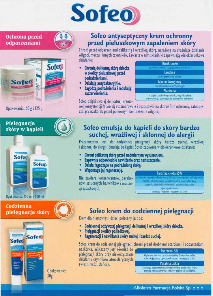 Sofeo antyseptyczny krem ochronny przed pieluszkowym zapaleniem skóry Chroni przed odparzeniami delikatną i wrażliwą skórę, narażoną na drażniące działanie wilgoci, moczu i innych czynników. Zawarte w nim składniki zapewniają wielokierunkowe działanie: • Chronią delikatną sk6rę dziecka w okolity pieluszkowej przed podrażnieniami, • Działają antybakteryjnie, • łagodzą podrażnienia i redukują zaaerwienienia. chroni pmd odpvzeniami zapewniadziatanieantybakteryjne Sofeo dzięki swojej delikatnej kremowej konsystencji łatwo się rozsmarowuje i pozostawia na skórze film ochronny, zabezpieczający naskórek przed ponownym kontaktem z wilgocią. Sofeo emulsja do kąpieli do skóry bardzo suchej, wrażliwej i skłonnej do alergii Przeznaczona jest do codziennej pielęgnacji skóry bardzo suchej, wrażliwej i skłonnej do alergii. Emulsja do kąpieli Sofeo zapewnia wielokierunkowe działanie: • • • • Chroni delikatną skórę przed nadmiernym wysuszeniem, Zapewnia odpowiednie nawilżenie oraz natłuszaenie, Działa łagodząco na podrażnioną sk6rę, Wspomaga jej regenerację. Nie zawiera konserwantów, nów, sztucznych barwników parabe- na wm __ i substan- cji zapachowych. I lWkólb -.y 6Jm odvoooy. JlOllaO oIeist!j powłoli zapob~a nadm~rnemu parowaniu wody z powierzchni skóry zapewniaodpowitdnią .•.•ilgOlOOŚĆ i poziom natłumzenia lagodzipodrainiema zmnie"uasw zenieilullCleniesięskó Sofeo krem do codziennej pielęgnacji Krem dla niemowląt i dzieci polecany jest do: • Codziennej odżywaej pielęgnacji delikatnej i wrażliwej sk6ry dziecka, • Pielęgnacji okolicy pośladkowej, • Regeneracji i nawilżania sk6ry suchej i bardzo suchej. Sofeo krem do codziennej pielęgnacji chroni przed drobnymi otarciami i odparzeniami naskórka. Wskazany jest również do , pielęgnacji skóry przy niekorzystnym Wspiera wlasne funkcje ochronne skóry. Doskonal. nawilia, działaniu czynników atmosferycznych dziala kojąco oraz lagodzi podrainioną i wysuszoną skórę· (wiatr, mróz, słońce). I Opakowanie: 30g Zapobiega lIadmiernemu parowaniu wody z powierzchni skóry. przez co pomaga utrzymać właściwy poziom jej nawilżenia.