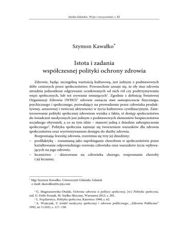 Studia Gdańskie. Wizje i rzeczywistość, t. XI Szymon Kawałko∗ Istota i zadania współczesnej polityki ochrony zdrowia Zdrowie, będąc szczególną wartością kulturową, jest jednym z podstawowych dóbr cenionych przez społeczeństwo. Powszechnie uznaje się, że zły stan zdrowia utrudnia jednostkom odgrywanie oczekiwanych od nich ról czy podtrzymywanie więzi społecznych, lub też zrywanie istniejących1. Zgodnie z definicją Światowej Organizacji Zdrowia (WHO)2 zdrowie oznacza stan samopoczucia fizycznego, psychicznego i społecznego, pozwalający na prowadzenie przez człowieka produktywnej, sensownej i twórczej aktywności w życiu kulturowo-cywilizacyjnym. Zainteresowanie polityki społecznej zdrowiem wynika z faktu, iż dostęp społeczeństwa do świadczeń medycznych jest jednym z podstawowych elementów bezpieczeństwa socjalnego obywateli, a co za tym idzie – stanowi jedną z dziedzin zabezpieczenia społecznego3. Polityka społeczna zajmuje się tworzeniem warunków dla zdrowia społeczeństwa oraz wyrównywaniem dostępu do służby zdrowia. Rozpoznając kwestię zdrowia, rozróżnia się trzy jej dziedziny: − profilaktykę – rozumianą jako zapobieganie chorobom w społeczeństwie przez kształtowanie odpowiedniego rozwoju człowieka oraz warunków życia wpływających na jego zdrowie; − lecznictwo – skierowane na człowieka chorego, rozpoznanie choroby i jej leczenie; ∗ Mgr Szymon Kawałko, Uniwersytet Gdański, Gdańsk e-mail: [email protected] 1 G. Magnuszewska-Otulak, Ochrona zdrowia w polityce społecznej, [w:] Polityka społeczna, red. G. Firlit-Fesnak, M. Szylko-Skoczny, Warszawa 2013, s. 201. 2 L. Frąckiewicz, Polityka społeczna, Katowice 1998, s. 62. 3 A. Wojtczak, U źródeł medycyny społecznej i zdrowia publicznego, „Zdrowie Publiczne” 1992, nr 3 (103), s. 117–130. Szymon Kawałko − rehabilitację – działalność zorientowaną na przywracanie do zdrowia, sprawności i przydatności społecznej ludzi dotkniętych kalectwem lub upośledzonych fizycznie, psychicznie, społecznie4. Kategoria zdrowia pozostaje także w zakresie zainteresowania ekonomii, przez którą traktowana jest jako wartość instrumentalna, tworząca określone ramy społeczne i ekonomiczne do podnoszenia jakości życia. W tym zakresie istotne są koszty podniesienia jakości życia rozpatrywane w sektorze zdrowotnym, w kontekście demograficznym i ekonomicznym5. Zdrowie może być też rozpatrywane w szerszym zakresie: to zdrowie publiczne definiowane jako nauka oraz sztuka zapobiegania chorobom, przedłużania życia oraz promowania zdrowego stylu życia poprzez organizację zbiorowych wysiłków społeczeństwa6. Pojęcie zdrowia zbiorowości określane jest jako stan równowagi pomiędzy populacją a otoczeniem zapewniający jej warunki przetrwania i rozwoju dzięki korzystnemu ukształtowaniu się cech biologicznych jednostek oraz pozytywnych zmian w środowisku7. W polskim systemie prawnym zdrowie publiczne zdefiniowane jest w ustawie o zapobieganiu oraz zwalczaniu zakażeń i chorób zakaźnych u ludzi, w której opisywane jest jako stan zdrowotny całego społeczeństwa lub też jego części, określany na podstawie wskaźników epidemiologicznych i demograficznych. Konsekwencją uznania zdrowia jako dobra publicznego jest osadzenie ochrony zdrowia i jego promocji w sferze działalności publicznej polegającej na interwencji państwa oraz finansowanie jej ze środków publicznych8. System opieki zdrowotnej definiowany jest jako spójna całość, której liczne, wzajemnie oddziałujące na siebie części wpływają pozytywnie na stan zdrowia społeczeństwa. Wskazuje się następujące cele systemu opieki zdrowotnej: poprawa (niedopuszczenie do pogorszenia) stanu zdrowia populacji; zapewnienie poczucia bezpieczeństwa zdrowotnego; ulga w cierpieniu; niesienie pociechy; pewność dostępu; równość dostępu; solidarność; autonomia pacjenta; autonomia lekarza; satysfakcja lekarza i innych pracowników; medyczna jakość świadczeń; poczucie odpowiedzialności pacjenta za własne zdrowie9. Opieka zdrowotna jest szerokim, wieloaspektowym programem medycyny zapobiegawczej, a pomoc medyczna i program powszechnej pomocy medycznej odpowiadają na potrzeby wynikające ze stanu zdrowia społeczeństwa. Zdrowie jako 4 J. Auleytner, Polityka społeczna w Polsce i w świecie, Warszawa 2012, s. 264. I. Rudawska, Opieka zdrowotna. Aspekty rynkowe i marketingowe, Warszawa 2007, s. 10. 6 J. Szymborski, Zdrowie publiczne i polityka ludnościowa, t. II, Warszawa 2012, s. 11. 7 E. Syrek, Zdrowie w aspekcie pedagogiki społecznej, Katowice 2000, s. 40. 8 J. Niżnik, W poszukiwaniu racjonalnego systemu finansowania ochrony zdrowia, Bydgoszcz 2004, s. 46. 9 K. Kowalska, Koordynowana opieka zdrowotna. Doświadczenia polskie i międzynarodowe, Warszawa 2009, s. 23. 5 326 Istota i zadania współczesnej polityki ochrony zdrowia istotna część ładu społecznego i ekonomicznego definiowane jest jako dobro publiczne, a więc z założenia całość społeczeństwa powinna mieć zagwarantowany przez administrację publiczną równy dostęp do jego ochrony. Zaspokajanie potrzeb socjalnych społeczeństwa to jedno z zadań władz samorządowych i krajowych, a państwo pełni funkcje regulatora dostępu do dóbr deficytowych. Potrzeby takie, jak ochrona zdrowia, edukacja czy obrona narodowa winny być zaspokajane zbiorowo przez państwo, ponieważ dotyczą potrzeb całego społeczeństwa10. Jako główne funkcje systemu opieki zdrowotnej wymienia się: − gromadzenie środków niezbędnych do finansowania opieki zdrowotnej; − tworzenie funduszu zabezpieczającego przed ryzykiem finansowym wynikającym z możliwości pogorszenia się stanu zdrowia (uwzględniającego funkcję ubezpieczeniową); − nabywanie usług medycznych przez dysponentów środków publicznych (firmy ubezpieczeniowe i agencje publiczne); − dostarczanie kompleksowej opieki zdrowotnej przez p