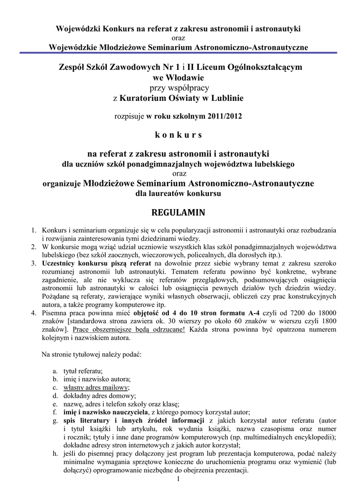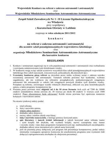 Wojewódzki Konkurs na referat z zakresu astronomii i astronautyki oraz Wojewódzkie Młodzieżowe Seminarium Astronomiczno-Astronautyczne Zespół Szkół Zawodowych Nr 1 i II Liceum Ogólnokształcącym we Włodawie przy współpracy z Kuratorium Oświaty w Lublinie rozpisuje w roku szkolnym 2011/2012 konkurs na referat z zakresu astronomii i astronautyki dla uczniów szkół ponadgimnazjalnych województwa lubelskiego oraz organizuje Młodzieżowe Seminarium Astronomiczno-Astronautyczne dla laureatów konkursu REGULAMIN 1. Konkurs i seminarium organizuje się w celu popularyzacji astronomii i astronautyki oraz rozbudzania i rozwijania zainteresowania tymi dziedzinami wiedzy. 2. W konkursie mogą wziąć udział uczniowie wszystkich klas szkół ponadgimnazjalnych województwa lubelskiego (bez szkół zaocznych, wieczorowych, policealnych, dla dorosłych itp.). 3. Uczestnicy konkursu piszą referat na dowolnie przez siebie wybrany temat z zakresu szeroko rozumianej astronomii lub astronautyki. Tematem referatu powinno być konkretne, wybrane zagadnienie, ale nie wyklucza się referatów przeglądowych, podsumowujących osiągnięcia astronomii lub astronautyki w całości lub osiągnięcia pewnych działów tych dziedzin wiedzy. Pożądane są referaty, zawierające wyniki własnych obserwacji, obliczeń czy prac konstrukcyjnych autora, a także programy komputerowe itp. 4. Pisemna praca powinna mieć objętość od 4 do 10 stron formatu A-4 czyli od 7200 do 18000 znaków [standardowa strona zawiera ok. 30 wierszy po około 60 znaków w wierszu czyli 1800 znaków]. Prace obszerniejsze będą odrzucane! Każda strona powinna być opatrzona numerem kolejnym i nazwiskiem autora. Na stronie tytułowej należy podać: tytuł referatu; imię i nazwisko autora; własny adres mailowy; dokładny adres domowy; nazwę, adres i telefon szkoły oraz klasę; imię i nazwisko nauczyciela, z którego pomocy korzystał autor; spis literatury i innych źródeł informacji z jakich korzystał autor referatu (autor i tytuł książki lub artykułu, rok wydania książki, nazwa czasopisma oraz numer i rocznik; tytuły i inne dane programów komputerowych (np. multimedialnych encyklopedii); dokładne adresy stron internetowych z jakich autor korzystał; h. jeśli do pisemnej pracy dołączony jest program lub prezentacja komputerowa, podać należy minimalne wymagania sprzętowe konieczne do uruchomienia programu oraz wymienić (lub dołączyć) oprogramowanie niezbędne do obejrzenia prezentacji. 1 a. b. c. d. e. f. g. 5. Autorzy referatów winni pamiętać, że zamieszczanie cudzych tekstów wziętych z prac naukowych, książek, czasopism i stron internetowych bez podania źródła, jest „kradzieżą” własności intelektualnych [Komisja Konkursowa skrupulatnie wyłapuje prace o znamionach plagiatu i je odrzuca]. 6. Nie zaleca się referatów zbiorowych, pisanych przez dwóch lub więcej autorów. 7. Praca powinna być napisana w dwóch egzemplarzach, z których jeden zostaje wysłany na konkurs a drugi pozostaje u autora. 8. Pracę należy przesłać na adres: Zespół Szkół Zawodowych Nr 1 i II Liceum Ogólnokształcące ul. Modrzewskiego 24 22-200 Włodawa z dopiskiem na kopercie KONKURS ASTRONOMICZNY 9. Nieprzekraczalny termin nadsyłania prac mija 25 stycznia 2012 roku. Decyduje data stempla pocztowego. 10. Jeżeli w jakiejś szkole referaty przygotowuje wielu uczniów, nauczyciel fizyki i astronomii powinien przeprowadzić wstępne szkolne eliminacje i wysłać na konkurs tylko najlepsze prace. 11. Nadesłane prace zostaną ocenione przez Wojewódzką Komisję Konkursową. Komisja wytypuje prace, które będą referowane podczas Wojewódzkiego Młodzieżowego Seminarium AstronomicznoAstronautycznego. 12. Termin i miejsce wojewódzkiego seminarium będą podane w zaproszeniach, wystosowanych do dyrekcji szkół. Prócz uczniów referujących swoje prace, na seminarium zostaną zaproszeni, w miarę możliwości, pozostali uczestnicy konkursu. 13. Referat – wygłaszany podczas seminarium – powinien być przygotowany w oparciu o pozostawiony sobie egzemplarz pracy i nie może trwać dłużej niż 15 minut. 14. Do dyspozycji referujących będą: tablica, rzutnik folii (pisma), rzutnik przeźroczy, komputer, projektor multimedialny. 15. Oceniając referaty, Komisja będzie brać pod uwagę: a. wartość merytoryczną pracy pisemnej oraz wygłoszonego referatu, b. sposób referowania, c. poziom wyjaśnień, udzielanych podczas dyskusji. 16. Autorzy najlepszych referatów (I i II miejsce) wezmą udział, jako reprezentanci województwa lubelskiego, w XXXVIII Ogólnopolskim Młodzieżowym Seminarium AstronomicznoAstronautycznym im. Profesora Roberta Głębockiego w Grudziądzu, które odbędzie się w dniach 22-24 marca 2012 r. 17. Dodatkowe informacje na temat konkursu i seminarium uzyskać można u Mirosława Trociuka: Zespół Szkół Zawodowych Nr 1 i II Liceum Ogólnokształcącym we Włodawie ul. Modrzewskiego 24 22-200 Włodawa tel./fax 82 572-14-88 e-mail: [email protected] 18. Bieżące informacje dotyczące konkursu i seminarium publikowane będą na stronie internetowej pod adresem: http://www.2lo.wlodawa.pl/astro.php Lublin, 4 listopada 2011 roku 2