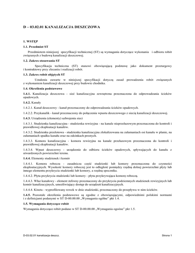 D – 03.02.01 KANALIZACJA DESZCZOWA 1. WSTĘP 1.1. Przedmiot ST Przedmiotem niniejszej specyfikacji technicznej (ST) są wymagania dotyczące wykonania i odbioru robót związanych z budową kanalizacji deszczowej. 1.2. Zakres stosowania ST Specyfikacja techniczna (ST) stanowi obowiązującą podstawę jako dokument przetargowy i kontraktowy przy zlecaniu i realizacji robót. 1.3. Zakres robót objętych ST Ustalenia zawarte w niniejszej specyfikacji dotyczą zasad prowadzenia robót związanych z wykonaniem kanalizacji deszczowej przy budowie chodnika. 1.4. Określenia podstawowe 1.4.1. Kanalizacja deszczowa - sieć kanalizacyjna zewnętrzna przeznaczona do odprowadzania ścieków opadowych. 1.4.2. Kanały 1.4.2.1. Kanał deszczowy - kanał przeznaczony do odprowadzania ścieków opadowych. 1.4.2.2. Przykanalik - kanał przeznaczony do połączenia wpustu deszczowego z siecią kanalizacji deszczowej. 1.4.3. Urządzenia (elementy) uzbrojenia sieci 1.4.3.1. Studzienka kanalizacyjna - studzienka rewizyjna - na kanale nieprzełazowym przeznaczona do kontroli i prawidłowej eksploatacji kanałów. 1.4.3.2. Studzienka przelotowa - studzienka kanalizacyjna zlokalizowana na załamaniach osi kanału w planie, na załamaniach spadku kanału oraz na odcinkach prostych. 1.4.3.3. Komora kanalizacyjna - komora rewizyjna na kanale przełazowym przeznaczona do kontroli i prawidłowej eksploatacji kanałów. 1.4.3.4. Wpust deszczowy - urządzenie do odbioru ścieków opadowych, spływających do kanału z utwardzonych powierzchni terenu. 1.4.4. Elementy studzienek i komór 1.4.4.1. Komora robocza - zasadnicza część studzienki lub komory przeznaczona do czynności eksploatacyjnych. Wysokość komory roboczej jest to odległość pomiędzy rzędną dolnej powierzchni płyty lub innego elementu przykrycia studzienki lub komory, a rzędną spocznika. 1.4.4.2. Płyta przykrycia studzienki lub komory - płyta przykrywająca komorę roboczą. 1.4.4.3. Właz kanałowy - element żeliwny przeznaczony do przykrycia podziemnych studzienek rewizyjnych lub komór kanalizacyjnych, umożliwiający dostęp do urządzeń kanalizacyjnych. 1.4.4.4. Kineta - wyprofilowany rowek w dnie studzienki, przeznaczony do przepływu w nim ścieków. 1.4.5. Pozostałe określenia podstawowe są zgodne z obowiązującymi, odpowiednimi polskimi normami i z definicjami podanymi w ST D-00.00.00 „Wymagania ogólne” pkt 1.4. 1.5. Wymagania dotyczące robót Wymagania dotyczące robót podano w ST D-00.00.00 „Wymagania ogoóne” pkt 1.5. D-03.02.01 kanalizacja deszcz. Strona 1 2. MATERIAŁY 2.1. Wymagania dotyczące materiałów Wymagania dotyczące materiałów, ich pozyskiwania i składowania podano w ST D-00.00.00 „Wymagania ogólne” pkt 2. 2.2. Rury kanałowe 2.2.2. Rury PVC o średnicy 400, 315 i 200 mm z wydłużonym kielichem jak dla kategorii IV szkód górniczych. 2.3. Studzienki kanalizacyjne 2.3.1. Dno studzienki Dno studzienki wykonuje się jako monolit z betonu hydrotechnicznego o właściwościach podanych w pkt 2.3.1. 2.3.2. Włazy kanałowe Włazy kanałowe należy wykonywać jako: − włazy żeliwne typu ciężkiego B125 odpowiadające wymaganiom PN-H-74051-01 [10] umieszczane poza korpusem drogi. 2.3.3. Stopnie złazowe Stopnie złazowe żeliwne odpowiadające wymaganiom PN-H-74086 [14]. 2.3.4. Płyta pokrywowa Płytę pokrywową należy wykonać o wymiarach 2,00 x 2,00 x 0,12 zbrojoną krzyżowo stalą żebrowaną Ø 12 mm z betonu klasy B-20. 2.4. Studzienki ściekowe 2.4.1. Wpusty uliczne żeliwne Wpusty uliczne żeliwne powinny odpowiadać wymaganiom PN-H-74080-01 [12] i PN-H-74080-04 [13]. 2.4.2. Kręgi betonowe prefabrykowane Na studzienki ściekowe stosowane są prefabrykowane kręgi betonowe o średnicy 50 cm, wysokości 30 cm lub 60 cm, z betonu klasy B 25, wg KB1-22.2.6 (6) [22]. 2.4.3. Płyty żelbetowe prefabrykowane Płyty żelbetowe prefabrykowane powinny mieć grubość 11 cm i być wykonane z betonu wibrowanego klasy B 20 zbrojonego stalą StOS. 2.4.4. Kruszywo na podsypkę Podsypka może być wykonana z tłucznia lub żwiru. Użyty materiał na podsypkę powinien odpowiadać wymaganiom stosownych norm, np. PN-B-06712 [7], PN-B-11111 [3], PN-B-11112 [4]. 2.5. Beton Beton hydrotechniczny B-15 i B-20 powinien odpowiadać wymaganiom BN-62/6738-07 [17]. 2.6. Zaprawa cementowa Zaprawa cementowa powinna odpowiadać wymaganiom PN-B-14501 [7]. 2.7. Składowanie materiałów 2.7.1. Rury kanałowe Rury można składować na otwartej przestrzeni, układając je w pozycji leżącej jedno- lub wielowarstwowo. Powierzchnia składowania powinna być utwardzona i zabezpieczona przed gromadzeniem się wód opadowych. W przypadku składowania poziomego pierwszą warstwę rur należy ułożyć na podkładach drewnianych. D-03.02.01 kanalizacja deszcz. Strona 2 2.7.2. Kręgi Kręgi można składować na powierzchni nieutwardzonej pod warunkiem, że nacisk kręgów przekazywany na grunt nie przekracza 0,5 MPa. Przy składowaniu wyrobów w pozycji wbudowania wysokość składowania nie powinna przekraczać 1,8 m. Składowanie powinno umożliwiać dostęp do poszczególnych stosów wyrobów lub pojedynczych kręgów. 2.7.3. Cegła kanalizacyjna Cegła kanalizacyjna może być składowana na otwartej przestrzeni, na powierzchni utwardzonej z odpowiednimi spadkami umożliwiającymi odprowadzenie wód opadowych. Cegły w miejscu składowania powinny być ułożone w sposób uporządkowany, zapewniający łatwość przeliczenia. Cegły powinny być ułożone w jednostkach ładunkowych lub luzem w stosach albo pryzmach. Jednostki ładunkowe mogą być ułożone jedne na drugich maksymalnie w 3 warstwach, o łącznej wysokości nie przekraczającej 3,0 m. Przy składowaniu cegieł luzem maksymalna wysokość stosów i pryzm nie powinna przekraczać 2,2 m. 2.7.4. Włazy kanałowe i stopnie Włazy kanałowe i stopnie powinny być składowane z dala od substancji działających korodująco. Włazy powinny być posegregowan