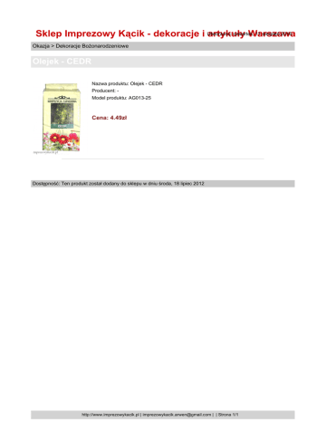 czwartek, 11 sierpień 2016 Sklep Imprezowy Kącik - dekoracje i Utworzono: artykuły Warszawa Okazja > Dekoracje Bożonarodzeniowe Olejek - CEDR Nazwa produktu: Olejek - CEDR Producent: Model produktu: AG013-25 Cena: 4.49zł Dostępność: Ten produkt został dodany do sklepu w dniu środa, 18 lipiec 2012 http://www.imprezowykacik.pl | [email protected] | | Strona 1/1