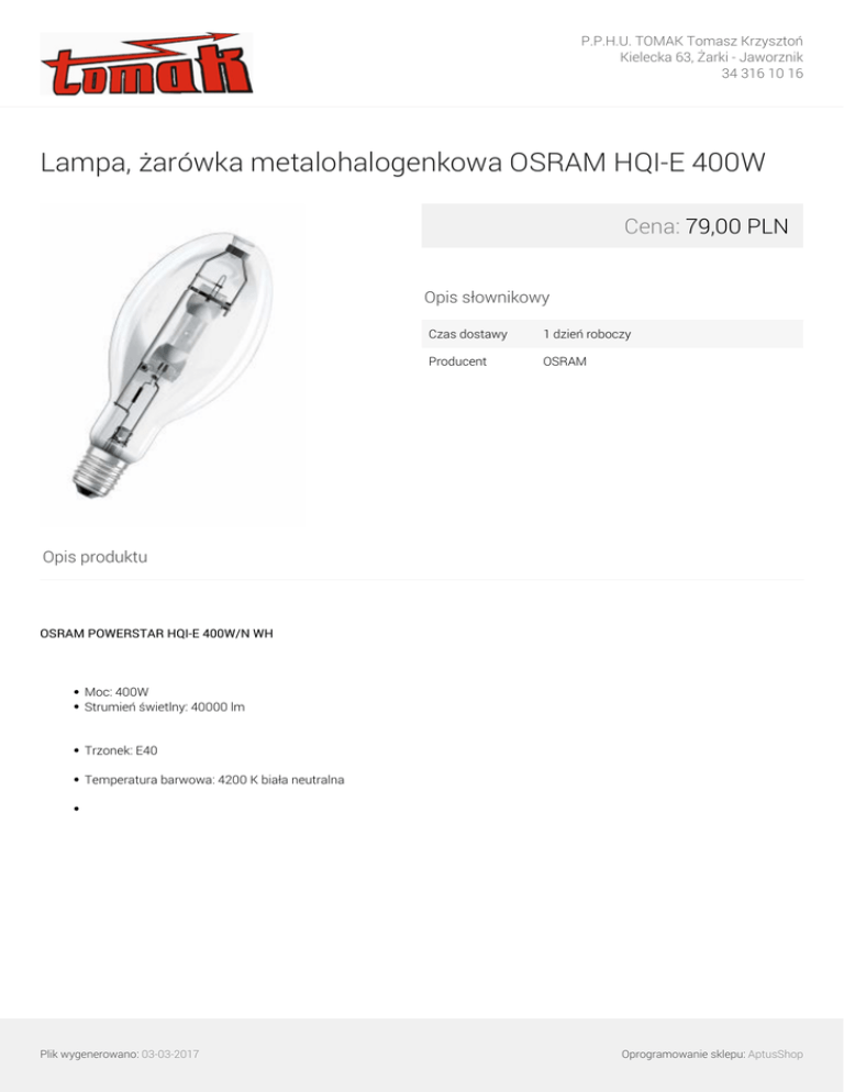 P.P.H.U. TOMAK Tomasz Krzysztoń Kielecka 63, Żarki - Jaworznik 34 316 10 16 Lampa, żarówka metalohalogenkowa OSRAM HQI-E 400W Cena: 79,00 PLN Opis słownikowy Czas dostawy 1 dzień roboczy Producent OSRAM Opis produktu OSRAM POWERSTAR HQI-E 400W/N WH Moc: 400W Strumień świetlny: 40000 lm Trzonek: E40 Temperatura barwowa: 4200 K biała neutralna Plik wygenerowano: 03-03-2017 Powered by TCPDF (www.tcpdf.org) Oprogramowanie sklepu: AptusShop