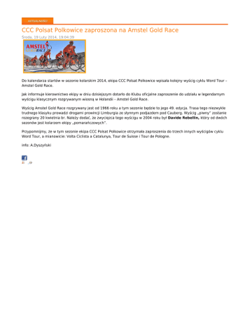 CCC Polsat Polkowice zaproszona na Amstel Gold Race Środa, 19 Luty 2014, 19:04:39 Do kalendarza startów w sezonie kolarskim 2014, ekipa CCC Polsat Polkowice wpisała kolejny wyścig cyklu Word Tour – Amstel Gold Race. Jak informuje kierownictwo ekipy w dniu dzisiejszym dotarło do Klubu oficjalne zaproszenie do udziału w legendarnym wyścigu klasycznym rozgrywanym wiosną w Holandii – Amstel Gold Race. Wyścig Amstel Gold Race rozgrywany jest od 1966 roku a tym sezonie będzie to jego 49. edycja. Trasa tego niezwykle trudnego klasyku prowadzi drogami prowincji Limburgia ze słynnym podjazdem pod Cauberg. Wyścig „piwny” zostanie rozegrany 20 kwietnia br. Należy dodać, że zwycięzca tego wyścigu w 2004 roku był Davide Rebellin, który od dwóch sezonów jest kolarzem ekipy „pomarańczowych”. Przypomnijmy, że w tym sezonie ekipa CCC Polsat Polkowice otrzymała zaproszenia do trzech innych wyścigów cyklu Word Tour, a mianowicie: Volta Ciclista a Catalunya, Tour de Suisse i Tour de Pologne. info: A.Dyszyński