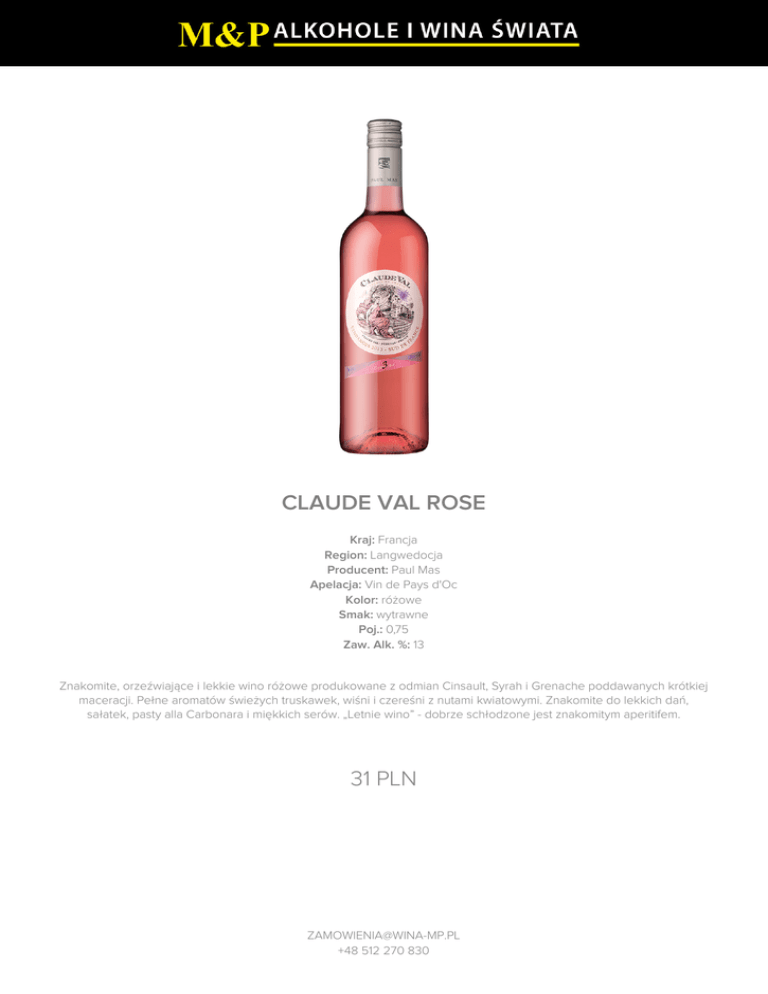 CLAUDE VAL ROSE Kraj: Francja Region: Langwedocja Producent: Paul Mas Apelacja: Vin de Pays d'Oc Kolor: różowe Smak: wytrawne Poj.: 0,75 Zaw. Alk. %: 13 Znakomite, orzeźwiające i lekkie wino różowe produkowane z odmian Cinsault, Syrah i Grenache poddawanych krótkiej maceracji. Pełne aromatów świeżych truskawek, wiśni i czereśni z nutami kwiatowymi. Znakomite do lekkich dań, sałatek, pasty alla Carbonara i miękkich serów. „Letnie wino” - dobrze schłodzone jest znakomitym aperitifem. 31 PLN [email protected] +48 512 270 830