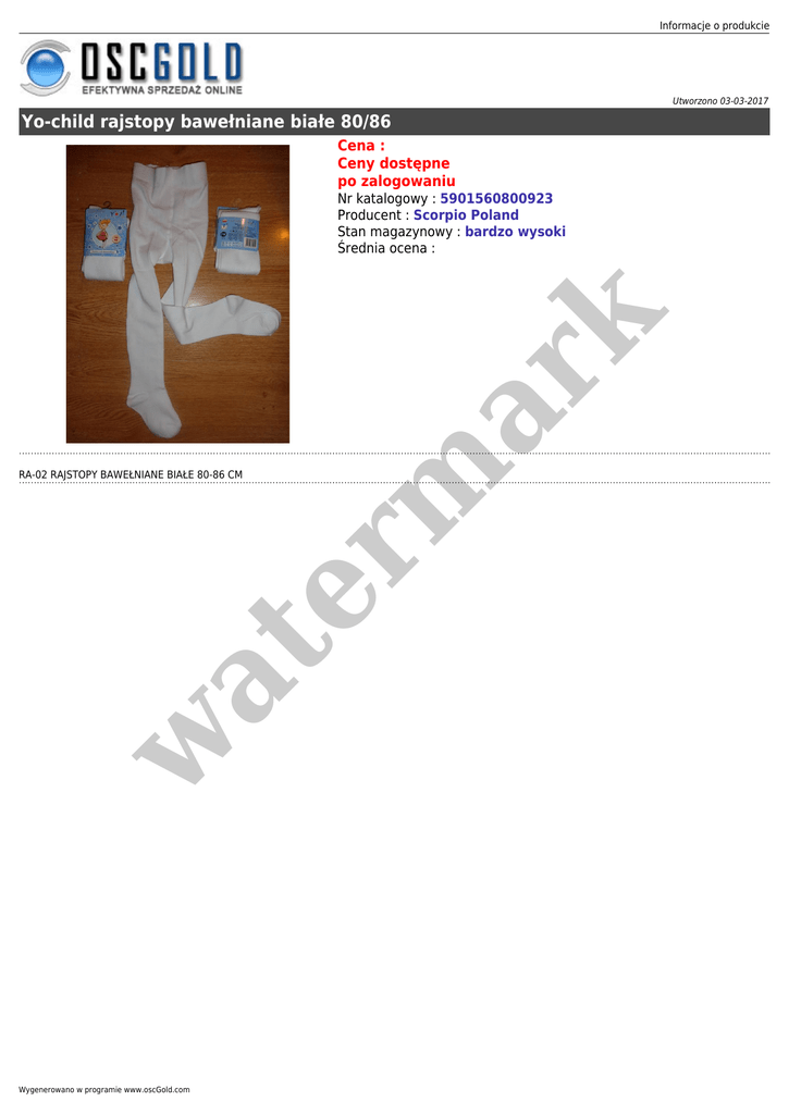 Informacje o produkcie Utworzono 03-03-2017 Yo-child rajstopy bawełniane białe 80/86 Cena : Ceny dostępne po zalogowaniu er m ar k Nr katalogowy : 5901560800923 Producent : Scorpio Poland Stan magazynowy : bardzo wysoki Średnia ocena : w at RA-02 RAJSTOPY BAWEŁNIANE BIAŁE 80-86 CM Wygenerowano w programie www.oscGold.com