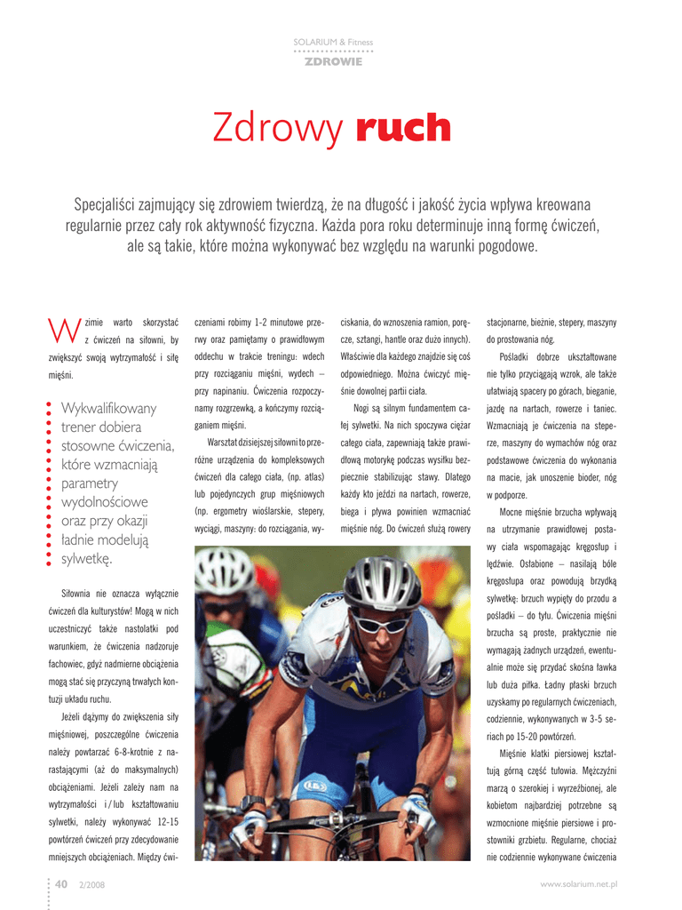 SOLARIUM & Fitness ZDROWIE Zdrowy ruch Specjaliści zajmujący się zdrowiem twierdzą, że na długość i jakość życia wpływa kreowana regularnie przez cały rok aktywność fizyczna. Każda pora roku determinuje inną formę ćwiczeń, ale są takie, które można wykonywać bez względu na warunki pogodowe. W skorzystać czeniami robimy 1-2 minutowe prze- ciskania, do wznoszenia ramion, porę- stacjonarne, bieżnie, stepery, maszyny z ćwiczeń na siłowni, by rwy oraz pamiętamy o prawidłowym cze, sztangi, hantle oraz dużo innych). do prostowania nóg. zwiększyć swoją wytrzymałość i siłę oddechu w trakcie treningu: wdech Właściwie dla każdego znajdzie się coś Pośladki dobrze ukształtowane mięśni. przy rozciąganiu mięśni, wydech – odpowiedniego. Można ćwiczyć mię- nie tylko przyciągają wzrok, ale także przy napinaniu. Ćwiczenia rozpoczy- śnie dowolnej partii ciała. ułatwiają spacery po górach, bieganie, zimie warto Wykwalifikowany trener dobiera stosowne ćwiczenia, które wzmacniają parametry wydolnościowe oraz przy okazji ładnie modelują sylwetkę. Siłownia nie oznacza wyłącznie ćwiczeń dla kulturystów! Mogą w nich namy rozgrzewką, a kończymy rozcią- Nogi są silnym fundamentem ca- jazdę na nartach, rowerze i taniec. łej sylwetki. Na nich spoczywa ciężar Wzmacniają je ćwiczenia na stepe- Warsztat dzisiejszej siłowni to prze- całego ciała, zapewniają także prawi- rze, maszyny do wymachów nóg oraz różne urządzenia do kompleksowych dłową motorykę podczas wysiłku bez- podstawowe ćwiczenia do wykonania ćwiczeń dla całego ciała, (np. atlas) piecznie stabilizując stawy. Dlatego na macie, jak unoszenie bioder, nóg lub pojedynczych grup mięśniowych każdy kto jeździ na nartach, rowerze, w podporze. (np. ergometry wioślarskie, stepery, biega i pływa powinien wzmacniać Mocne mięśnie brzucha wpływają wyciągi, maszyny: do rozciągania, wy- mięśnie nóg. Do ćwiczeń służą rowery na utrzymanie prawidłowej posta- ganiem mięśni. wy ciała wspomagając kręgosłup i lędźwie. Osłabione – nasilają bóle kręgosłupa oraz powodują brzydką sylwetkę: brzuch wypięty do przodu a pośladki – do tyłu. Ćwiczenia mięśni uczestniczyć także nastolatki pod brzucha są proste, praktycznie nie warunkiem, że ćwiczenia nadzoruje wymagają żadnych urządzeń, ewentu- fachowiec, gdyż nadmierne obciążenia alnie może się przydać skośna ławka mogą stać się przyczyną trwałych kon- lub duża piłka. Ładny płaski brzuch tuzji układu ruchu. uzyskamy po regularnych ćwiczeniach, Jeżeli dążymy do zwiększenia siły mięśniowej, poszczególne ćwiczenia codziennie, wykonywanych w 3-5 seriach po 15-20 powtórzeń. należy powtarzać 6-8-krotnie z na- Mięśnie klatki piersiowej kształ- rastającymi (aż do maksymalnych) tują górną część tułowia. Mężczyźni obciążeniami. Jeżeli zależy nam na marzą o szerokiej i wyrzeźbionej, ale wytrzymałości i / lub kształtowaniu kobietom najbardziej potrzebne są sylwetki, należy wykonywać 12-15 wzmocnione mięśnie piersiowe i pro- powtórzeń ćwiczeń przy zdecydowanie stowniki grzbietu. Regularne, chociaż mniejszych obciążeniach. Między ćwi- nie codziennie wykonywane ćwiczenia 40 2/2008 www.solarium.net.pl ładnie modelują sylwetkę bez nadmiernej przesady. Ponadto wzmacniają także mięśnie podtrzymujące głowę, przeciwdziałając bólom kręgosłupa szyjnego. Przy tych ćwiczeniach wykorzystujemy atlas, sztangielki, maszyny do rozciągania, wznoszenia ramion. Pływanie jest najlepszą dyscypliną zapewniającą harmonijny i bezurazowy rozwój mięśni. Cała umiejętność pływania polega na tym, aby w wodzie się rozluźniać, a nie usztywniać, oraz w naturalny i swobodny sposób regulować swój oddech. „Wadą” pływania jest duży margines czasowy potrzebny na doprowadzenie się do porządku po zakończonym treningu. Ponadto są zdrowotne przeciwwskazania np. zapalenie zatok, choroby skóry, dróg moczo-płciowych. Pływanie rekreacyjne także wymaga regularności oraz stopniowego zwiększania wysiłku. Z zasady każdy, kto pływa powinien wybrać swój ulubiony styl i doskonalić ten, który mu najbardziej odpowiada. Aby poprawić swe umiejętności, należy najpierw zwiększać pokonywany podczas treningu dystans, a w drugiej kolejności szybkość pływania. W tym treningu najważniejsza jest systematyczność. Jazda na rowerze jest świetna do nia na rowerze zalecane są osobom 200 kg, więc potrzebna jest odpowied- ale przestrzegając zasady, że lepiej otyłym i z nadwagą, cukrzykom, a nia amortyzacja. Ponadto buty powinny się nie dotrenować niż ulec kontuzji także chorującym na astmę, nadci- być wyposażone we wkładkę z wyściół- z przetrenowania. Jogging powoduje śnienie oraz osteoporozę. Wysiłek na ką przepuszczającą powietrze, stabili- dużą utratę płynów z elektrolitami więc rowerze można dawkować stosownie zator pozwalający na równomierne trzeba uzupełniać niedobory. do możliwości, a odpowiedni sprzęt i rozłożenie nacisku na całą stopę pod- Ostatnio coraz większą popular- dobrane trasy pozwalają na bezpiecz- czas biegania, mieć cholewkę z koł- nością cieszy się nordic walking, który ne obciążenie. Stosowny sprzęt i ubiór nierzem piankowym zapamiętującym może być uprawiany także w zimie oraz atrakcyjne trasy maksymalizują kształt stopy oraz zewnętrzną część oraz podczas deszczu. Jest to forma przyjemność jazdy na rowerze. podeszwy z płytkami poprawiającymi intensywnego marszu z odpowiednio Bieganie należy do najpopularniejszych form aktywności fizycznej. jej elastyczność. Generalnie buty biegowe powinny być lekkie, sznurowane i poniżej kostki. Treningi biegowe poprzedzamy rozgrzewką typu trucht, skręty tułowia, bioder, wypady nóg, zgięcia kolan, a na koniec – skłony. uprawiania przy dobrej pogodzie, cho- dobranymi – 