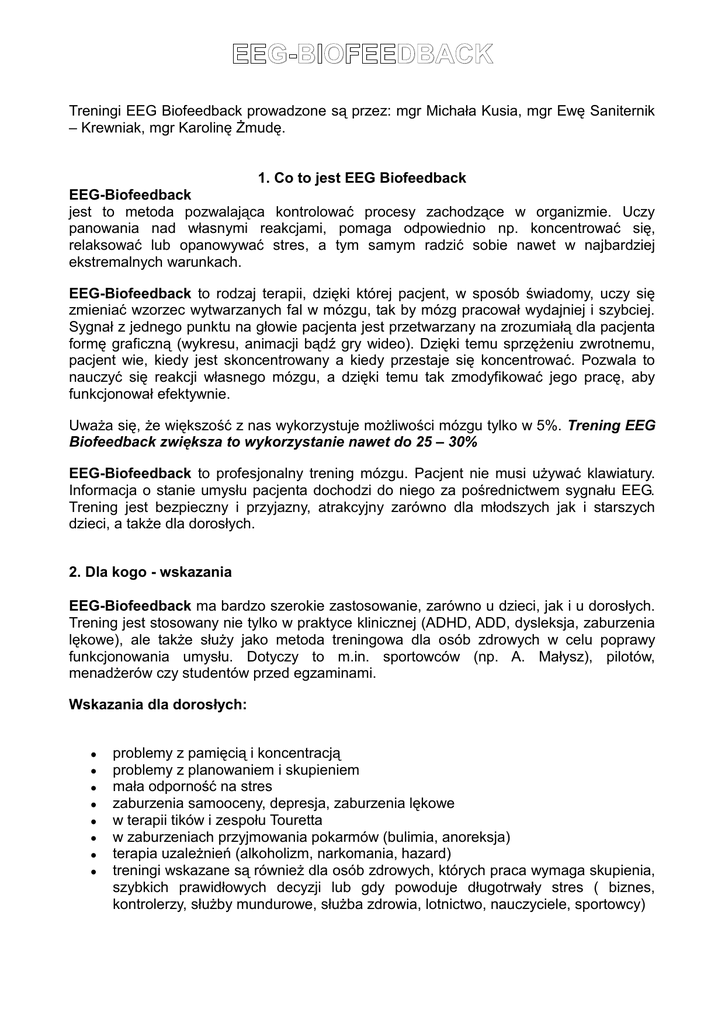 EEG-BIOFEEDBACK Treningi EEG Biofeedback prowadzone są przez: mgr Michała Kusia, mgr Ewę Saniternik – Krewniak, mgr Karolinę Żmudę. 1. Co to jest EEG Biofeedback EEG-Biofeedback jest to metoda pozwalająca kontrolować procesy zachodzące w organizmie. Uczy panowania nad własnymi reakcjami, pomaga odpowiednio np. koncentrować się, relaksować lub opanowywać stres, a tym samym radzić sobie nawet w najbardziej ekstremalnych warunkach. EEG-Biofeedback to rodzaj terapii, dzięki której pacjent, w sposób świadomy, uczy się zmieniać wzorzec wytwarzanych fal w mózgu, tak by mózg pracował wydajniej i szybciej. Sygnał z jednego punktu na głowie pacjenta jest przetwarzany na zrozumiałą dla pacjenta formę graficzną (wykresu, animacji bądź gry wideo). Dzięki temu sprzężeniu zwrotnemu, pacjent wie, kiedy jest skoncentrowany a kiedy przestaje się koncentrować. Pozwala to nauczyć się reakcji własnego mózgu, a dzięki temu tak zmodyfikować jego pracę, aby funkcjonował efektywnie. Uważa się, że większość z nas wykorzystuje możliwości mózgu tylko w 5%. Trening EEG Biofeedback zwiększa to wykorzystanie nawet do 25 – 30% EEG-Biofeedback to profesjonalny trening mózgu. Pacjent nie musi używać klawiatury. Informacja o stanie umysłu pacjenta dochodzi do niego za pośrednictwem sygnału EEG. Trening jest bezpieczny i przyjazny, atrakcyjny zarówno dla młodszych jak i starszych dzieci, a także dla dorosłych. 2. Dla kogo - wskazania EEG-Biofeedback ma bardzo szerokie zastosowanie, zarówno u dzieci, jak i u dorosłych. Trening jest stosowany nie tylko w praktyce klinicznej (ADHD, ADD, dysleksja, zaburzenia lękowe), ale także służy jako metoda treningowa dla osób zdrowych w celu poprawy funkcjonowania umysłu. Dotyczy to m.in. sportowców (np. A. Małysz), pilotów, menadżerów czy studentów przed egzaminami. Wskazania dla dorosłych: problemy z pamięcią i koncentracją problemy z planowaniem i skupieniem mała odporność na stres zaburzenia samooceny, depresja, zaburzenia lękowe w terapii tików i zespołu Touretta w zaburzeniach przyjmowania pokarmów (bulimia, anoreksja) terapia uzależnień (alkoholizm, narkomania, hazard) treningi wskazane są również dla osób zdrowych, których praca wymaga skupienia, szybkich prawidłowych decyzji lub gdy powoduje długotrwały stres ( biznes, kontrolerzy, służby mundurowe, służba zdrowia, lotnictwo, nauczyciele, sportowcy) Wskazania dla dzieci : zaburzenia pamięci i koncentracji uwagi poprawa szybkości uczenia się nadpobudliwość psychoruchowa ( ADHD) problemy szkolne dysleksja, dysortografii trema, reakcje stresowe, agresja chęć poprawy wyników w dziedzinach wymagających koncentracji ( sport, muzyka) 3. Jak to działa Trening odbywa się poprzez interaktywną współpracę z komputerem. Dzięki temu pacjent świadomie reaguje na zadania stawiane przez terapeutę. Terapia jest niezwykle efektywna a przy tym przyjemna. Dzieci mogą wybierać formę prezentacji sygnału: może to być gra, animacja lub ulubiona bajka DVD; dorośli korzystają z profesjonalnych wykresów, wizualizacji oraz filmów relaksacyjnych. Jak długo trwa trening Biofeedback? Czas trwania terapii ustala się stosownie do wieku pacjenta i ważności problemu. Treningi można podzielić na krótkoterminowe (ok. 10 - 20 spotkań), takie, które wymagają systematycznej pracy przez ok. 40-60 sesji (np. ADHD) i długoterminowe (np. epilepsja, afazja - aż 80 sesji). Spotkania odbywają się co najmniej 1 raz w tygodniu, a najlepiej 2-3 razy w tygodniu. Jedna sesja treningowa trwa ok. 40 – 50 min.
