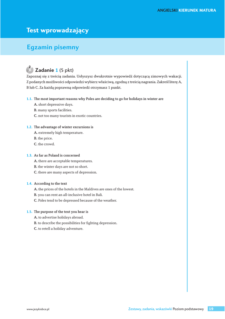 ANGIELSKI KIERUNEK MATURA Test wprowadzający Egzamin pisemny 2 Zadanie 1 (5 pkt) Zapoznaj się z treścią zadania. Usłyszysz dwukrotnie wypowiedź dotyczącą zimowych wakacji. Z podanych możliwości odpowiedzi wybierz właściwą, zgodną z treścią nagrania. Zakreśl literę A, B lub C. Za każdą poprawną odpowiedź otrzymasz 1 punkt. 1.1. The most important reasons why Poles are deciding to go for holidays in winter are A. short depressive days. B. many sports facilities. C. not too many tourists in exotic countries. 1.2. The advantage of winter excursions is A. extremely high temperature. B. the price. C. the crowd. 1.3. As far as Poland is concerned A. there are acceptable temperatures. B. the winter days are not so short. C. there are many aspects of depression. 1.4. According to the text A. the prices of the hotels in the Maldives are ones of the lowest. B. you can rent an all-inclusive hotel in Bali. C. Poles tend to be depressed because of the weather. 1.5. The purpose of the text you hear is A. to advertise holidays abroad. B. to describe the possibilities for fighting depression. C. to retell a holiday adventure. www.jezykiobce.pl Zestawy, zadania, wskazówki Poziom podstawowy 19 ANGIELSKI KIERUNEK MATURA Egzamin pisemny Rozumienie ze słuchu Zadania 9 Zadanie 1 Zapoznaj się z treścią zadania. Usłyszysz dwukrotnie fragment wypowiedzi dotyczącej telefonów komórkowych. Na podstawie usłyszanych informacji zdecyduj, które zdania są zgodne z treścią nagrania (TRUE), a które nie (FALSE). Zaznacz znakiem X odpowiednią rubrykę w tabeli. TRUE 1. The discussion on the subject of mobile phones was aroused again a few months aer the end of a proper examination. 2. Dr Herberman decided to warn his co-workers against the dangers of using mobile phones. 3. Dr Herberman’s ideas were only supported by scientific centres. 4. Dr Herberman forbids children to use mobile phones at all. 5. The mobile phone companies do not confirm the theories of scientists opposing dr Herberman. 6. If afraid, the easiest way to protect ourselves from harmful effects of using mobiles is by limiting the amount of time spent using them. 7. There is a proof of electromagnetic radiation emitted by the mobile phones influencing brain cells. 10 FALSE 1. Skup się na fragmencie określającym, kiedy rozpoczęła się dyskusja na temat używania telefonów komórkowych. 4. Zwróć uwagę, jak bardzo restrykcyjny jest zakaz doktora Herbermana. 5. Przeczytaj dokładnie treść pytania. Do czego odnosi się zdanie dotyczące koncernów produkujących telefony komórkowe? 7. Skup się na fragmencie mówiącym o dowodach na negatywny wpływ promieniowania telefonów komórkowych. Zadanie 2 Zapoznaj się z treścią zadania. Usłyszysz dwukrotnie wypowiedź na temat Londynu. Z podanych możliwości odpowiedzi wybierz właściwą, zgodną z treścią nagrania. Zakreśl literę A, B lub C. 1. While visiting the oldest museum in London A. everyone feels strongly disappointed with the exhibitions. B. it’s impossible to see everything. C. tourists shouldn’t intend to see all exhibits at once. 2. The building that houses the Tate Modern A. might be considered more interesting than the art itself. B. has never been used for other purposes. C. has been erected especially for the museum. 4. The buildings of the Parliament A. date back to 11th century. B. cannot be visited at all times. C. are ideal for taking a nap or rest. 2. Wysłuchaj dokładnie fragmentu dotyczącego muzeum Tate. Zwróć uwagę na synonimy zwrotów pojawiających się w podanych możliwościach odpowiedzi. 5. An average Londoner A. watches documentaries on English history. B. knows a lot about London history. C. doesn’t visit his hometown monuments. 5. Pośród podanych możliwości odpowiedzi jedna nie jest wspomniana w tekście. Która? Dwie dotyczą spędzania czasu wolnego. Na co Londyńczycy poświęcają swoje wolne chwile? 3. The London Eye is A. known only under this name. B. very popular among tourists. C. the world record-holder concerning its size. www.jezykiobce.pl Zestawy, zadania, wskazówki Poziom podstawowy 35 ANGIELSKI KIERUNEK MATURA Egzamin pisemny Rozumienie tekstu czytanego – Zadania Far from perfect The soundtrack brings up memories of the first three movies. However, the unique blend of comedy and action that made the movies so much more fun than any other adventure series is mostly gone. The story is too fantasy-orientated and the plot as a whole is messy. The inclusion of aliens is really over the top. The new Indiana Jones movie is certainly not the best sequel of all time, and some will hate it while others will find it charming and living up to its hype. TRUE 1. The movie feels a bit old-fashioned. 3. Zastanów się, co oznacza zwrot break new ground? Jakie słowo jest antonimem przymiotnika new? Czy pojawia się ono w tekście? 2. Indy doesn’t snap his bullwhip like he did before. 3. The director tried to break new ground with the new Indiana Jones movie. 4. The main character is surprisingly disappointing. 5. There aren’t many computer-generated images in the movie. 6. Znajdź w tekście synonim słowa chaotic. 6. The plot is a little chaotic. 7. The new Indiana Jones movie is definitely the best sequel ever made. 8. There are no fantasy elements in the movie. FALSE Zadanie 4 Przeczytaj poniższy tekst, z którego usunięto 7 zdań. W miejsca oznaczone cyframi (1-7) wpisz zamieszczone poniżej zdania (A-H) tak, aby otrzymać spójny i logiczny tekst. Jedno z podanych zdań jest podane dodatkowo i nie pasuje do żadnej luki. 1. Które zdanie opisuje młodość Henryka VIII oraz początki jego rządów? 4. W którym fragmencie pojawia się osoba związana z Kościołem? Poszukaj zdania, w którym wspomniana jest kolejna żona Henryka, Jane. 5. Do czego odnosi się his father’s work ze zdania występującego po luce? Które zdanie odnosi się do konfliktu na tle religijnym? 52 In 1509, in England, a boy