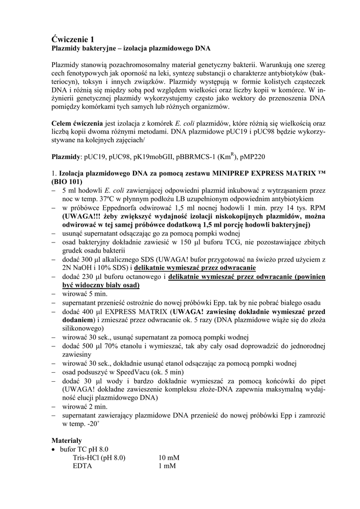 Ćwiczenie 1 Plazmidy bakteryjne – izolacja plazmidowego DNA Plazmidy stanowią pozachromosomalny materiał genetyczny bakterii. Warunkują one szereg cech fenotypowych jak oporność na leki, syntezę substancji o charakterze antybiotyków (bakteriocyn), toksyn i innych związków. Plazmidy występują w formie kolistych cząsteczek DNA i różnią się między sobą pod względem wielkości oraz liczby kopii w komórce. W inżynierii genetycznej plazmidy wykorzystujemy często jako wektory do przenoszenia DNA pomiędzy komórkami tych samych lub różnych organizmów. Celem ćwiczenia jest izolacja z komórek E. coli plazmidów, które różnią się wielkością oraz liczbą kopii dwoma różnymi metodami. DNA plazmidowe pUC19 i pUC98 będzie wykorzystywane na kolejnych zajęciach/ Plazmidy: pUC19, pUC98, pK19mobGII, pBBRMCS-1 (KmR), pMP220 1. Izolacja plazmidowego DNA za pomocą zestawu MINIPREP EXPRESS MATRIX ™ (BIO 101) 5 ml hodowli E. coli zawierającej odpowiedni plazmid inkubować z wytrząsaniem przez noc w temp. 37ºC w płynnym podłożu LB uzupełnionym odpowiednim antybiotykiem w próbówce Eppednorfa odwirować 1,5 ml nocnej hodowli 1 min. przy 14 tys. RPM (UWAGA!!! żeby zwiększyć wydajność izolacji niskokopijnych plazmidów, można odwirować w tej samej próbówce dodatkową 1,5 ml porcję hodowli bakteryjnej) usunąć supernatant odsączając go za pomocą pompki wodnej osad bakteryjny dokładnie zawiesić w 150 l buforu TCG, nie pozostawiające zbitych grudek osadu bakterii dodać 300 l alkalicznego SDS (UWAGA! bufor przygotować na świeżo przed użyciem z 2N NaOH i 10% SDS) i delikatnie wymieszać przez odwracanie dodać 230 l buforu octanowego i delikatnie wymieszać przez odwracanie (powinien być widoczny biały osad) wirować 5 min. supernatant przenieść ostrożnie do nowej próbówki Epp. tak by nie pobrać białego osadu dodać 400 l EXPRESS MATRIX (UWAGA! zawiesinę dokładnie wymieszać przed dodaniem) i zmieszać przez odwracanie ok. 5 razy (DNA plazmidowe wiąże się do złoża silikonowego) wirować 30 sek., usunąć supernatant za pomocą pompki wodnej dodać 500 l 70% etanolu i wymieszać, tak aby cały osad doprowadzić do jednorodnej zawiesiny wirować 30 sek., dokładnie usunąć etanol odsączając za pomocą pompki wodnej osad podsuszyć w SpeedVacu (ok. 5 min) dodać 30 l wody i bardzo dokładnie wymieszać za pomocą końcówki do pipet (UWAGA! dokładne zawieszenie kompleksu złoże-DNA zapewnia maksymalną wydajność elucji plazmidowego DNA) wirować 2 min. supernatant zawierający plazmidowe DNA przenieść do nowej próbówki Epp i zamrozić w temp. -20˚ Materiały bufor TC pH 8.0 Tris-HCl (pH 8.0) EDTA 10 mM 1 mM bufor TCG glukoza Tris-HCl (pH 8.0) EDTA bufor octanowy octan potasu (5M) kwas octowy lodowaty H2O dest. 50 mM 25 mM 10 mM 60 ml 11.5 ml 28.5 ml alkaliczny SDS SDS 1% NaOH 0.2 M Przygotowany z 10% SDS i 2M NaOH bezpośrednio przed użyciem, 2. Izolacja plazmidowego DNA metodą Holmsa, Quigley’a 5 ml hodowli E. coli zawierającej odpowiedni plazmid inkubować z wytrząsaniem przez noc w temp. 37ºC w płynnym podłożu LB uzupełnionym odpowiednim antybiotykiem w próbówce Eppednorfa odwirować 1,5 ml nocnej hodowli 1 min. przy 14 tys. RPM (UWAGA!!! żeby zwiększyć wydajność izolacji niskokopijnych plazmidów, można odwirować w tej samej próbówce dodatkową 1,5 ml porcję hodowli bakteryjnej) usunąć supernatant odsączając go za pomocą pompki wodnej osad bakteryjny bardzo dokładnie zawiesić w 350 l buforu STET, nie pozostawiające zbitych grudek bakterii (UWAGA bufor STET bardzo się pieni, należy pipetować go bardzo delikatnie) dodać 25 l lizozymu o stęż. 10 mg/ml, zamieszać końcówką pipety mieszankę umieścić we wrzącej łaźni wodnej na 40 sekund i natychmiast odwirować 10 min. supernatant przenieść ostrożnie do nowej próbówki Epp. tak by nie pobrać osadu z próbówki dodać 0,6 objętości izopropanolu, bardzo dokładnie wywieszać przez odwracanie wirować 15 min, supernatant delikatnie odsączyć za pomocą pompki próżniowej, a osad wypłukać 0,5 ml 70% etanolu, odwirować 5 min, supernatant delikatnie odsączyć za pomocą pompki próżniowej osad podsuszyć w SpeedVacu (ok. 5 min), a następnie rozpuścić w 20 l buforu TC + RNaza 20 g/ml) zamrozić w temp. -20˚ Bufor STET NaCl Tris HCl pH 8.0 EDTA pH 8.0 Triton X-100 bufor TC+RNaza Bufor TC + RNaza 20 g/ml 0.1 M 10 mM 1 mM 5% Ćwiczenie 2 Izolacja całkowitego DNA z bakterii Metody rozdziału DNA w żelach agarozowych Celem ćwiczenia jest izolacja genomowego (całkowitego DNA) bakterii oraz rozdział elektroforetyczny próbek genomowego DNA oraz plazmidowego DNA wyizolowanego na poprzednich zajęciach i porównanie obrazu elektroforetycznego. W przypadku rozdziału plazmidowego DNA należy zaobserwować zależność drogi migracji od wielkości cząsteczki plazmidu, obecność form konformacyjnych, ilości i jakości DNA, zależnie od zastosowanej metody izolacji plazmidu A) Izolacja genowego DNA za pomocą zestawu Genomic DNA Prep Plus Zasada działania zestawu do izolacji genomowego DNA opiera się (podobnie jak w przypadku plazmidu) na zdolności wiązania się DNA do złóż krzemionkowych w buforach o wysokiej sile jonowej. Komórki bakterii poddawane są lizie w uniwersalnym buforze lizującym (LT), zawierającym sole i detergenty niejonowe. Dodatkowo w procesie lizy uczestniczy silna proteaza (Proteinaza K). W tych warunkach dochodzi do lizy komórek i degradacji wszystkich białek. Następnie mieszanina nanoszona jest na minikolumnę ze specjalnym złożem krzemionkowym. DNA przechodząc przez złoże osiada na nim, zaś zanieczyszczenia zostają wypłukane z kolumny buforem A1 zawierającym 96% etanol. Oczyszczone DNA wymywane jest z kolumny niskojonowymi buforami np. buforem TC lub wodą. Stopień oczyszczenia DNA pozwala na jego wykorzystanie w analizie restrykcyjnej i PCR. Protokół izolacji genomowego DNA W
