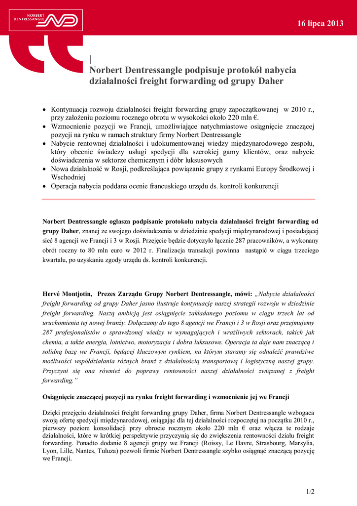 16 lipca 272013 mai 201 | Norbert Dentressangle podpisuje protokół nabycia działalności freight forwarding od grupy Daher Kontynuacja rozwoju działalności freight forwarding grupy zapoczątkowanej w 2010 r., przy założeniu poziomu rocznego obrotu w wysokości około 220 mln €. Wzmocnienie pozycji we Francji, umożliwiające natychmiastowe osiągnięcie znaczącej pozycji na rynku w ramach struktury firmy Norbert Dentressangle Nabycie rentownej działalności i udokumentowanej wiedzy międzynarodowego zespołu, który obecnie świadczy usługi spedycji dla szerokiej gamy klientów, oraz nabycie doświadczenia w sektorze chemicznym i dóbr luksusowych Nowa działalność w Rosji, podkreślająca powiązanie grupy z rynkami Europy Środkowej i Wschodniej Operacja nabycia poddana ocenie francuskiego urzędu ds. kontroli konkurencji Norbert Dentressangle ogłasza podpisanie protokołu nabycia działalności freight forwarding od grupy Daher, znanej ze swojego doświadczenia w dziedzinie spedycji międzynarodowej i posiadającej sieć 8 agencji we Francji i 3 w Rosji. Przejęcie będzie dotyczyło łącznie 287 pracowników, a wykonany obrót roczny to 80 mln euro w 2012 r. Finalizacja transakcji powinna nastąpić w ciągu trzeciego kwartału, po uzyskaniu zgody urzędu ds. kontroli konkurencji. Hervé Montjotin, Prezes Zarządu Grupy Norbert Dentressangle, mówi: „Nabycie działalności freight forwarding od grupy Daher jasno ilustruje kontynuację naszej strategii rozwoju w dziedzinie freight forwarding. Naszą ambicją jest osiągnięcie zakładanego poziomu w ciągu trzech lat od uruchomienia tej nowej branży. Dołączamy do tego 8 agencji we Francji i 3 w Rosji oraz przejmujemy 287 profesjonalistów o sprawdzonej wiedzy w wymagających i wrażliwych sektorach, takich jak chemia, a także energia, lotnictwo, motoryzacja i dobra luksusowe. Operacja ta daje nam znaczącą i solidną bazę we Francji, będącej kluczowym rynkiem, na którym staramy się odnaleźć prawdziwe możliwości współdziałania różnych branż z działalnością transportową i logistyczną naszej grupy. Przyczyni się ona również do poprawy rentowności naszej działalności związanej z freight forwarding.” Osiągnięcie znaczącej pozycji na rynku freight forwarding i wzmocnienie jej we Francji Dzięki przejęciu działalności freight forwarding grupy Daher, firma Norbert Dentressangle wzbogaca swoją ofertę spedycji międzynarodowej, osiągając dla tej działalności rozpoczętej na początku 2010 r., pierwszy poziom konsolidacji przy obrocie rocznym około 220 mln € oraz włącza te rodzaje działalności, które w krótkiej perspektywie przyczynią się do zwiększenia rentowności działu freight forwarding. Ponadto dodanie 8 agencji grupy we Francji (Roissy, Le Havre, Strasbourg, Marsylia, Lyon, Lille, Nantes, Tuluza) pozwoli firmie Norbert Dentressangle szybko osiągnąć znaczącą pozycję we Francji. 1/2 16 lipca 272013 mai 201 Portfel prestiżowych klientów, z przewagą klientów przemysłowych, który powoli rozszerza się na dobra luksusowe Dzięki przejęciu działalności freight forwarding grupy Daher, firma Norbert Dentressangle wzmocni swoje uprzywilejowane powiązania z prestiżowymi i wymagającymi klientami, wielkimi markami z poziomu konsolidacji przemysłu lotniczego, motoryzacyjnego, chemicznego i dóbr luksusowych, które wymagają zapewniania odpowiedniej jakości operacji transportowych dla produktów przemysłowych, wrażliwych i złożonych, zaś zespoły firmy Daher posiadają w tym zakresie uznaną i szeroko docenianą wiedzę. Solidne doświadczenie na terenie Rosji, wzmocnione długą obecnością na rynku Dzięki przejęciu ważnego uczestnika rynku spedycji drogowej z i do Rosji oraz usług celnych, wraz z personelem liczącym 103 osoby rozmieszczonym między Moskwą, Jekaterynburgiem i Petersburgiem, przy obrotach w wysokości 15 mln €, firma Norbert Dentressangle uzyskuje wysoką pozycję w Rosji, na którą pracuje od ponad 20 lat. Portfel klientów firmy Daher w Rosji, początkowo związany głównie z przemysłem, zmierzał stopniowo w kierunku dóbr luksusowych, dla których zespoły rozwinęły odpowiednią wiedzę i oferty specjalne. Uruchomienie działalności logistycznej na zasadach spółki joint-venture z firmą Danone w Rosji podkreśla powiązanie grupy z dysponującymi wielkim potencjałem rynkami Europy Środkowej i Wschodniej O firmie Norbert Dentressangle: Firma Norbert Dentressangle jest uczestnikiem międzynarodowego rynku Transportu, Logistyki i Freight forwarding z obrotem rocznym na dzień 31/12/12 wynoszącym 3,9 mld €, w tym 59% obrotu zrealizowano poza Francją. Firma zatrudnia 32 500 pracowników i jest obecna w 26 krajach. Firma Norbert Dentressangle opracowuje rozwiązania o wysokiej wartości dodanej we wszystkich trzech dziedzinach swojej działalności na kontynencie europejskim, amerykańskim i azjatyckim oraz włącza ideę zrównoważonego rozwoju do wszystkich działań. Firma Norbert Dentressangle, figurująca w indeksach CAC Small i CAC All Tradable, jest kierowana przez Hervé Montjotin. NYSE Euronext Paris (kategoria B) / NYSE Euronext London, Code GND – Isin FR0000052870 www.norbert-dentressangle.com Kontakt: Norbert Dentressangle Dyrektor ds. komunikacji Thierry LEDUC – Tel : +33 4 72 83 66 00 Email : [email protected] Kontakt z mediami Prasa: Nathalie BELLOC – Tel : +33 1 44 43 77 12 Email : [email protected] 2/2