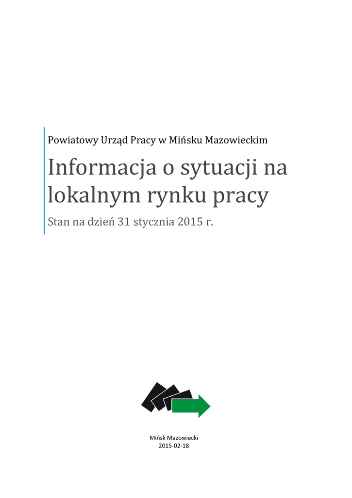 Powiatowy Urząd Pracy w Mińsku Mazowieckim Informacja o sytuacji na lokalnym rynku pracy Stan na dzień 31 stycznia 2015 r. Mińsk Mazowiecki 2015-02-18 Informacja o sytuacji na lokalnym rynku pracy (stan na dzień 31.01.2015) I. Poziom bezrobocia Na koniec stycznia 2015r. w Powiatowym Urzędzie Pracy zarejestrowanych było 5215 osób bezrobotnych (w tym 2482 kobiety) oraz 101 osób poszukujących pracy (w tym 45 kobiet). W porównaniu do grudnia 2014r. liczba bezrobotnych wzrosła o 224 osoby, ale w ujęciu rocznym liczba zarejestrowanych bezrobotnych zmalała aż o 1072 osoby. Styczeń tradycyjnie już należy do miesięcy, kiedy bezrobocie rośnie głównie z przyczyn sezonowych. Jednak w tym roku wzrost był prawie o połowę niższy od ubiegłorocznego. II. 2014 rok 2015 rok 6287 6500 6000 5500 5215 5090 4991 listopad grudzień 5000 4500 4000 3500 3000 styczeń Stopa bezrobocia Według oficjalnych danych GUS stopa bezrobocia w powiecie mińskim wynosiła na koniec grudnia 2014r. 10,7%. W kraju stopa bezrobocia w grudniu ubiegłego roku wynosiła 11,5%, a w województwie mazowieckim 9,8%. Wstępne dane o stopie bezrobocia w styczniu br. wskazują na sezonowy wzrost stopy bezrobocia do poziomu 12,1% w kraju oraz 11,2% w powiecie mińskim. W styczniu ubiegłego roku stopa bezrobocia w powiecie wynosiła 13,1%. III. Liczba bezrobotnych Bezrobocie w gminach Na dzień 31 stycznia 2015r. najwięcej bezrobotnych w rejestrze PUP było mieszkańcami miasta Mińsk Mazowiecki (29% ogółu zarejestrowanych), gminy wiejskiej Mińsk Mazowiecki (12,5%), Sulejówka (9,3%) oraz Halinowa (8,9%). Gminy z najmniejszą liczbą zarejestrowanych bezrobotnych to: Jakubów (3,1% ogółu zarejestrowanych), Dobre (3,8%) oraz Latowicz (3,6%). W porównaniu do stycznia 2014r., bezrobocie zmalało we wszystkich gminach powiatu. Najwięcej bezrobotnych ubyło w Mińsku Mazowieckim (mniej o 326 osób) i w Sulejówku, gdzie bezrobocie zmalało o 165 osób. Stopa bezrobocia w powiecie 2014 rok 2015 rok 15,0% 10,9% 10,7% 13,1% 11,2% 10,0% 5,0% 0,0% listopad Wyszczególnienie Mińsk Maz. (miasto) Cegłów Dębe Wielkie Dobre Halinów Jakubów Kałuszyn Latowicz Mińsk Maz. (gmina) Mrozy Siennica Stanisławów Sulejówek Ogółem grudzień I 2014 styczeń I 2015 różnica 1843 285 387 253 554 198 315 188 726 312 282 293 651 1517 244 299 198 466 163 278 186 654 274 205 245 486 -326 -41 -88 -55 -88 -35 -37 -2 -72 -38 -77 -48 -165 6287 5215 -1072 2 Informacja o sytuacji na lokalnym rynku pracy (stan na dzień 31.01.2015) IV. Struktura bezrobotnych Wśród bezrobotnych zarejestrowanych w PUP na koniec stycznia 2015r. wyodrębnia się między innymi następujące grupy:  długotrwale bezrobotni (2670 os., 51% ogółu)  bez kwalifikacji zawodowych (1649, 32%)  osoby do 30 roku życia (1526, 29%)  osoby powyżej 50 roku życia (1528, 29%)  bez doświadczenia zawodowego (971, 19%)  osoby do 25 roku życia (836, 16%)  kobiety, które nie podjęły zatrudnienia po urodzeniu dziecka (520, 10%)  niepełnosprawni (307, 6%). Wyszczególnienie Bezrobotni ogółem w tym: Kobiety Mężczyźni Poprzednio pracujący Dotychczas niepracujący Zamieszkali na wsi Z prawem do zasiłku Zwolnieni z przyczyn zakładu pracy Osoby w okresie do 12 m-cy od dnia ukończenia nauki Cudzoziemcy V. Napływ i odpływ bezrobotnych, podjęcia pracy W styczniu 2015r. w Powiatowym Urzędzie Pracy zarejestrowało się 616 bezrobotnych (w tym 169 osób trafiło do ewidencji po raz pierwszy). W tym samym miesiącu z ewidencji bezrobotnych wyłączono 392 osoby. Napływ do bezrobocia był mniejszy niż przed rokiem, kiedy to w PUP zarejestrowało się 716 osób, a z ewidencji wyłączono w tym samym miesiącu 315 osób. Do głównych powodów wyłączenia bezrobotnych z rejestru PUP w styczniu 2015 r. można zaliczyć:  podjęcie pracy – 178 osób (45,4% odpływu z bezrobocia),  niepotwierdzenie gotowości do pracy – 151 osób (38,5% odpływu),  dobrowolną rezygnację ze statusu bezrobotnego – 20 osób (5,1%),  nabycie praw do świadczenia przedemerytalnego – 12 osób (3,1%). I 2014 % I 2015 % 6287 100,0 5215 100,0 2924 3363 5393 46,5 53,5 85,8 2482 2733 4506 47,6 52,4 86,4 894 14,2 709 13,6 3393 1069 54,0 17,0 2844 847 54,5 16,2 397 6,3 310 5,9 373 5,9 281 5,4 21 0,3 18 0,3 Napływ i odpływ bezrobotnych Napływ 800 Odpływ 716 616 600 400 392 315 200 0 styczeń 2014 styczeń 2015 Podjęcia pracy 2014 rok 350 300 250 200 150 100 50 0 2015 rok 326 273 181 178 listopad grudzień styczeń 3 Informacja o sytuacji na lokalnym rynku pracy (stan na dzień 31.01.2015) VI. Wolne miejsca pracy i miejsca aktywizacji zawodowej Wolne miejsca pracy i miejsca aktywizacji zawodowej Pracodawcy w styczniu br. zgłosili do tut. Urzędu 127 wolnych miejsc pracy i miejsc aktywizacji zawodowej. Było to o 52 oferty więcej niż w grudniu i o 53 oferty więcej niż w styczniu 2014r. Najwięcej ofert pracy w opisywanym miesiącu wpłynęło dla przedstawicieli handlowych (32 miejsca), pokojowych (10 miejsc), pracowników produkcji kebabu (10 miejsc), pracowników gospodarczych (5 miejsc) i sprzątaczek (5 miejsc). VII. Aktywne formy pomocy bezrobotnym W ciągu 2014 r. w ramach aktywnych form przeciwdziałania bezrobociu finansowanych z Funduszu Pracy i EFS (6.1.3) Urząd objął pomocą łącznie 1402 osoby bezrobotne. Dodatkowo, PUP kontynuował realizację projektu konkursowego „Bądź aktywny – wygraj przyszłość” w ramach działania 6.1.1 PO KL, w którym na staże i szkolenia zawodowe skierowano 159 osób bezrobotnych. Łącznie, w 2014 roku w ramach aktywnych form przeciwdziałania bezrobociu pomocą objęto 1561 osób bezrobotnych (tj. o 244 osoby więcej niż w 2013r.). W ramach środków PFRON zaktywizowano w ubiegłym roku 10 osób. W styczniu 2015r. na subsydiowane miejsca pracy skierowano 5 osób bezrobotnych (uzupełnienia zwolnionych stanowisk). VIII. Efektywność podstawowych form aktywizacji W porównaniu do grudnia 2013r. poprawiła się efektywnoś