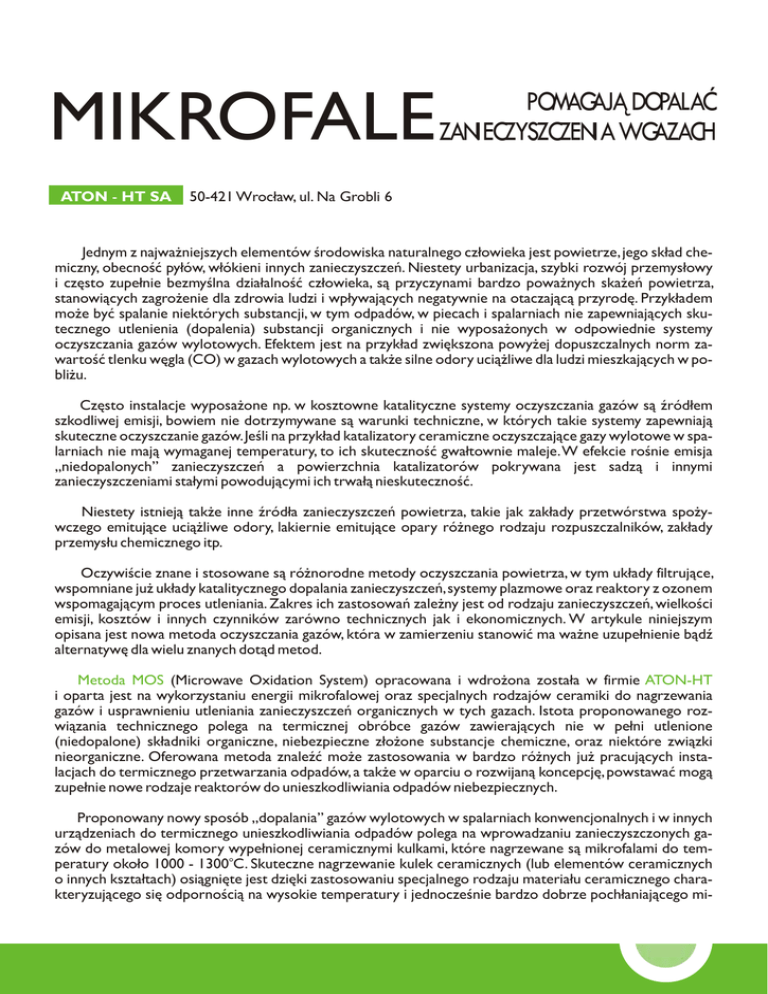MIKROFALE ATON - HT SA POMAGAJĄ DOPALAĆ ZANIECZYSZCZENIA W GAZACH 50-421 Wrocław, ul. Na Grobli 6 Jednym z najważniejszych elementów środowiska naturalnego człowieka jest powietrze, jego skład chemiczny, obecność pyłów, włókieni innych zanieczyszczeń. Niestety urbanizacja, szybki rozwój przemysłowy i często zupełnie bezmyślna działalność człowieka, są przyczynami bardzo poważnych skażeń powietrza, stanowiących zagrożenie dla zdrowia ludzi i wpływających negatywnie na otaczającą przyrodę. Przykładem może być spalanie niektórych substancji, w tym odpadów, w piecach i spalarniach nie zapewniających skutecznego utlenienia (dopalenia) substancji organicznych i nie wyposażonych w odpowiednie systemy oczyszczania gazów wylotowych. Efektem jest na przykład zwiększona powyżej dopuszczalnych norm zawartość tlenku węgla (CO) w gazach wylotowych a także silne odory uciążliwe dla ludzi mieszkających w pobliżu. Często instalacje wyposażone np. w kosztowne katalityczne systemy oczyszczania gazów są źródłem szkodliwej emisji, bowiem nie dotrzymywane są warunki techniczne, w których takie systemy zapewniają skuteczne oczyszczanie gazów. Jeśli na przykład katalizatory ceramiczne oczyszczające gazy wylotowe w spalarniach nie mają wymaganej temperatury, to ich skuteczność gwałtownie maleje. W efekcie rośnie emisja „niedopalonych” zanieczyszczeń a powierzchnia katalizatorów pokrywana jest sadzą i innymi zanieczyszczeniami stałymi powodującymi ich trwałą nieskuteczność. Niestety istnieją także inne źródła zanieczyszczeń powietrza, takie jak zakłady przetwórstwa spożywczego emitujące uciążliwe odory, lakiernie emitujące opary różnego rodzaju rozpuszczalników, zakłady przemysłu chemicznego itp. Oczywiście znane i stosowane są różnorodne metody oczyszczania powietrza, w tym układy filtrujące, wspomniane już układy katalitycznego dopalania zanieczyszczeń, systemy plazmowe oraz reaktory z ozonem wspomagającym proces utleniania. Zakres ich zastosowań zależny jest od rodzaju zanieczyszczeń, wielkości emisji, kosztów i innych czynników zarówno technicznych jak i ekonomicznych. W artykule niniejszym opisana jest nowa metoda oczyszczania gazów, która w zamierzeniu stanowić ma ważne uzupełnienie bądź alternatywę dla wielu znanych dotąd metod. Metoda MOS (Microwave Oxidation System) opracowana i wdrożona została w firmie ATON-HT i oparta jest na wykorzystaniu energii mikrofalowej oraz specjalnych rodzajów ceramiki do nagrzewania gazów i usprawnieniu utleniania zanieczyszczeń organicznych w tych gazach. Istota proponowanego rozwiązania technicznego polega na termicznej obróbce gazów zawierających nie w pełni utlenione (niedopalone) składniki organiczne, niebezpieczne złożone substancje chemiczne, oraz niektóre związki nieorganiczne. Oferowana metoda znaleźć może zastosowania w bardzo różnych już pracujących instalacjach do termicznego przetwarzania odpadów, a także w oparciu o rozwijaną koncepcję, powstawać mogą zupełnie nowe rodzaje reaktorów do unieszkodliwiania odpadów niebezpiecznych. Proponowany nowy sposób „dopalania” gazów wylotowych w spalarniach konwencjonalnych i w innych urządzeniach do termicznego unieszkodliwiania odpadów polega na wprowadzaniu zanieczyszczonych gazów do metalowej komory wypełnionej ceramicznymi kulkami, które nagrzewane są mikrofalami do temo peratury około 1000 - 1300 C. Skuteczne nagrzewanie kulek ceramicznych (lub elementów ceramicznych o innych kształtach) osiągnięte jest dzięki zastosowaniu specjalnego rodzaju materiału ceramicznego charakteryzującego się odpornością na wysokie temperatury i jednocześnie bardzo dobrze pochłaniającego mi- krofale w paśmie częstotliwości 0,5 Ghz - 4 GHz. Natomiast materiał ceramiczny stanowiący osłonę ścianek reaktora charakteryzuje się bardzo małą tłumiennością energii mikrofalowej, nawet w wysokich temperaturach (ok. 1000oC). Dla usprawnienia procesu utleniania do komory wprowadzane jest dodatkowe powietrze lub tlen (można także wprowadzać ozon). Dopalane gazy przechodząc wolno pomiędzy ceramicznymi kształtkami nagrzanymi za pomocą mikrofal nagrzewają się do wysokich temperatur i wobec nadmiaru tlenu (dodatkowo wprowadzane powietrze lub czysty tlen) są bardzo szybko utleniane. Czas „przejścia” gazów przez złoże kulek może być bardzo długi i wynosić nawet 4 sekundy, co gwarantuje bardzo skuteczne dopalenie (utlenienie) wszelkich składników organicznych zawartych w oczyszczanym gazie. Ponadto można sterować ilością wprowadzanego tlenu (powietrza), co wobec braku dodatkowych gazów spalinowych z palników gazowych, pozwala łatwo zapewnić odpowiedni nadmiar tlenu gwarantujący skuteczne dopalenie szczególnie substancji organicznych. System należy optymalizować, np. dobierając warunki procesowe, w tym ilość wprowadzanego powietrza lub samego tlenu, na przykład minimalizując zawartość tlenku węgla w gazach wyjściowych (powinien być emitowany tylko dwutlenek węgla). Opisywany sposób pokazano w uproszczeniu na rysunku poniżej (rys.1). Czujnik temperatury (pirometr) Generatory mikrofalowe Zasilacze generatorów mikrofalowych wraz z układami sterowania Nagrzewane mikrofalami kulki ceramiczne Wlot zanieczyszczonych gazów (np. ze spalarni, z wyciągu lakierni itp.) Rys. 1. Schemat reaktora MOS. Gorące gazy opuszczające dopalacz mogą być, zależnie od ich składu, wprowadzane do konwencjonalnych układów katalitycznych lub też emitowane do atmosfery. Jeśli zachodzić będzie potrzeba dalszego ich oczyszczania, to systemy oczyszczające będą wielokrotnie mniejsze, niż w przypadku konwencjonalnych systemów oczyszczania bez stosowania proponowanego systemu. Celem bardzo znacznego zmniejszenia zużycia energii opisany wyżej reaktor MOS może być połączony z wymiennikiem ciepła, w którym energia gorących gaz