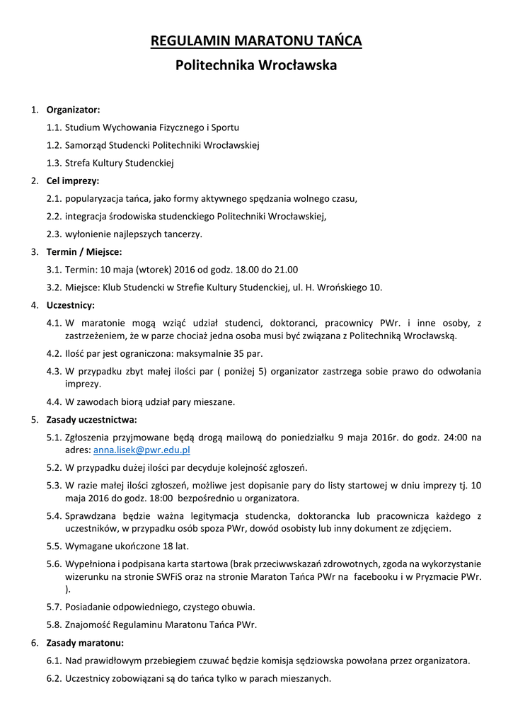 REGULAMIN MARATONU TAŃCA Politechnika Wrocławska 1. Organizator: 1.1. Studium Wychowania Fizycznego i Sportu 1.2. Samorząd Studencki Politechniki Wrocławskiej 1.3. Strefa Kultury Studenckiej 2. Cel imprezy: 2.1. popularyzacja tańca, jako formy aktywnego spędzania wolnego czasu, 2.2. integracja środowiska studenckiego Politechniki Wrocławskiej, 2.3. wyłonienie najlepszych tancerzy. 3. Termin / Miejsce: 3.1. Termin: 10 maja (wtorek) 2016 od godz. 18.00 do 21.00 3.2. Miejsce: Klub Studencki w Strefie Kultury Studenckiej, ul. H. Wrońskiego 10. 4. Uczestnicy: 4.1. W maratonie mogą wziąć udział studenci, doktoranci, pracownicy PWr. i inne osoby, z zastrzeżeniem, że w parze chociaż jedna osoba musi być związana z Politechniką Wrocławską. 4.2. Ilość par jest ograniczona: maksymalnie 35 par. 4.3. W przypadku zbyt małej ilości par ( poniżej 5) organizator zastrzega sobie prawo do odwołania imprezy. 4.4. W zawodach biorą udział pary mieszane. 5. Zasady uczestnictwa: 5.1. Zgłoszenia przyjmowane będą drogą mailową do poniedziałku 9 maja 2016r. do godz. 24:00 na adres: [email protected] 5.2. W przypadku dużej ilości par decyduje kolejność zgłoszeń. 5.3. W razie małej ilości zgłoszeń, możliwe jest dopisanie pary do listy startowej w dniu imprezy tj. 10 maja 2016 do godz. 18:00 bezpośrednio u organizatora. 5.4. Sprawdzana będzie ważna legitymacja studencka, doktorancka lub pracownicza każdego z uczestników, w przypadku osób spoza PWr, dowód osobisty lub inny dokument ze zdjęciem. 5.5. Wymagane ukończone 18 lat. 5.6. Wypełniona i podpisana karta startowa (brak przeciwwskazań zdrowotnych, zgoda na wykorzystanie wizerunku na stronie SWFiS oraz na stronie Maraton Tańca PWr na facebooku i w Pryzmacie PWr. ). 5.7. Posiadanie odpowiedniego, czystego obuwia. 5.8. Znajomość Regulaminu Maratonu Tańca PWr. 6. Zasady maratonu: 6.1. Nad prawidłowym przebiegiem czuwać będzie komisja sędziowska powołana przez organizatora. 6.2. Uczestnicy zobowiązani są do tańca tylko w parach mieszanych. 6.3. Technika tańca jest dowolna. 6.4. Wygrywa para, która ostatnia zostanie na parkiecie tańcząc lub w przypadku większej ilości par komisja sędziowska wyłoni zwycięską parę. 6.5. Co godzinę następuje eliminacja par przez komisję sędziowską (w przypadku małej ilości par ten punkt może ulec zawieszeniu). 7. Kryteria oceny: 7.1. Zgodność ruchu z muzyką. 7.2. Dynamika, ekspresja i tempo tańca. 7.3. Partnerowanie (dopuszcza się max. 25% czasu tańca bez trzymania partnera). 7.4. Różnorodność kroków. 7.5. Dobra zabawa i kondycja. 8. Ostrzeżenia i dyskwalifikacja: 8.1. Po otrzymaniu drugiego ostrzeżenia od sędziów para zostaje wykluczona z maratonu. 8.2. Ostrzeżenia przyznawane będą w przypadku: 8.2.1. braku dynamiki, tempa tańca, 8.2.2. ponad 25% tańca bez trzymania partnera, 8.2.3. działania na szkodę innych par (popychanie, utrudnianie tańca, uwagi), 8.2.4. wulgarnego tańca. 8.3. Dyskwalifikacja nastąpi w przypadku: 8.3.1. rezygnacji jednego z partnerów, 8.3.2. uczestnictwa w maratonie pod wpływem alkoholu lub środków odurzających itp., 8.3.3. zaprzestania tańca któregokolwiek z partnerów (ocenia organizator). 9. Przerwy regeneracyjne: 9.1. Będą miały miejsce dwie przerwy: po pierwszej godz. tańca 5min, po drugiej 5 min. 9.2. Przerwy służą do uzupełnienia płynów, skorzystania z toalety, zgłoszenia rezygnacji itp. 10. Organizator zapewnia: 10.1. obsługę muzyczną, 10.2. dyplomy i puchary, 10.3. opiekę medyczną. 11. Nagrody: 11.1. za pierwsze trzy miejsca w turnieju zostaną przyznane dyplomy, bony umożliwiające przedterminowe zapisanie się na dowolne zajęcia sportowe organizowane przez SWFiS. 12. Uwagi końcowe: 12.1. Zakaz wnoszenia na parkiet taneczny jedzenia i picia. 12.2. Organizator zastrzega sobie prawo do zmiany powyższego regulaminu. 12.3. Uczestnicy maratonu muszą bezwzględnie podporządkować się zarządzeniom organizatora.
