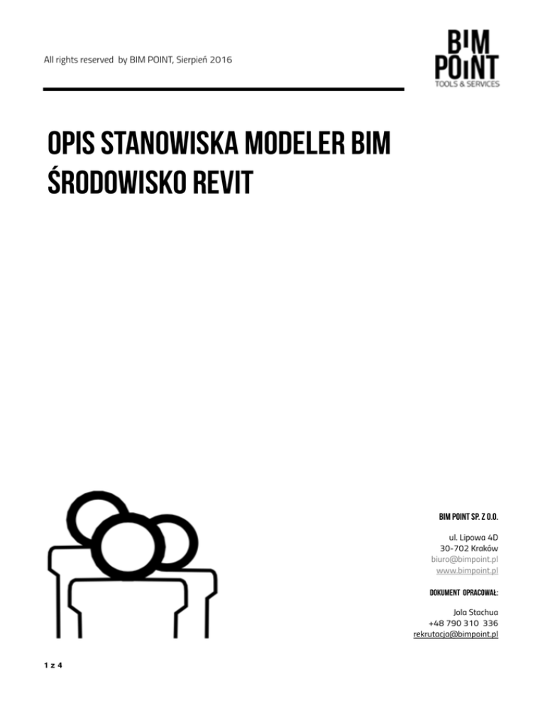 All rights reserved by BIM POINT, Sierpień 2016 OPIS STANOWISKA MODELER BIM ŚRODOWISKO REVIT BIM Point Sp. z o.o. ul. Lipowa 4D 30-702 Kraków [email protected] www.bimpoint.pl DOKUMENT opracował: Jola Stachua +48 790 310 336 [email protected] 1z4 All rights reserved by BIM POINT, Sierpień 2016 MODELER BIM ŚRODOWISKO REVIT BIM POINT jest dynamiczną organizacja inżynierów i architektów współpracujących w całej Polsce z inwestorami, generalnymi wykonawcami i architektami wspomagając ich pracę, tworząc nową jakość na wymagającym rynku procesów budowlanych. Aktualnie poszukujemy do zespołu BIM POINT Modelerów BIM w środowisku REVIT, którzy będą opracowywać 3wymiarowe (3D) modele projektów od koncepcji poprzez ich budowę. Stanowisko obejmie współpracę z dynamicznym zespołem inżynierów i projektantów w celu opracowania rozwiązań budowlanych, które spełniać będą potrzeby naszych klientów. Wymagana jest praktyka w procesach BIM. BIM Modeler będzie odpowiedzialny za cały proces od tworzenia projektu poprzez dostarczenie rysunków i modeli za pomocą aktualnych wersji dostępnego oprogramowania REVIT. OPIS STANOWISKA BIM MODELER to ekspert w tworzeniu i opracowaniu modeli w perspektywie 3D, 4D, 5D, 6D. Bardzo dobrze rozumie wszystkie etapy projektowania i i porusza się w wielu obszarach branżowych. Potrafi definiować potrzeby Klienta, i zgodnie z nimi eliminować nieścisłości w dokumentacji przygotowanej przez projektantów. Posiada doświadczenie w wykorzystaniu wszystkich możliwości REVIT i cechuje go w tym obszarze sprawność i kreatywność. BIM Modeler będzie współpracował z Liderem i Koordynatorem projektu oraz dynamicznym zespołem inżynierów i projektantów w celu opracowania rozwiązań budowlanych, które spełniać będą potrzeby naszych klientów. Jest odpowiedzialny za ciągłe podnoszenie swoich kwalifikacji poprzez poszerzanie wiedzy, kompetencji i wzajemną wymianę doświadczeń ODPOWIEDZIALNOŚĆ ZAWODOWA • Odpowiadać będzie za jakość swojej pracy bezpośrednio przed • • Koordynatorem Projektu BIM/Leaderem Zapewnia dokładność modelu na bazie otrzymanej dokumentacji budowlanej i wytycznych przedstawionych przez Koordynatora BIM z naciskiem na uwzględnienie specyfiki branżowej Opracowuje plany przekrojów i szczegółów w modelu BIM dla projektów 2z4 BIM Point Sp. z o.o. ul. Lipowa 4D 30-702 Kraków [email protected] www.bimpoint.pl DOKUMENT opracował: Jola Stachua +48 790 310 336 [email protected] All rights reserved by BIM POINT, Sierpień 2016 o różnej złożoności technicznej • Dokładnie rozumie specyfikę projektów budowlanych w inteligentnym i skutecznym modelowaniu elementów konstrukcyjnych, w celu zapewnienia integralności modelu • Ściśle współpracuje i koordynuje etapy swojej pracy z innymi projektantami biorącymi udział w projekcie • Przestrzega kryteriów planu wykonania dokumentacji BIM w porozumieniem z Koordynatorem BIM/Leaderm Projektu i w odpowiedzi na potrzeby Klienta • Obserwuje możliwości BIM wykorzystuje je kreatywnie w swojej pracy • Zna normy i procedury związane z projektowaniem BIM UMIEJĘTNOŚCI, KOMPETENCJE, DOŚWIADCZENIE • Potrafi odgrywać wiodącą rolę w rozwoju dyscypliny BIM, umie dostosować specyficzne treści dla konkretnego projektu w modelowaniu BIM • Potrafi eksportować pliki w formatach IFC, BCF i innych do współpracy wewnątrz i na zewnątrz BIM POINT • Posiada bardzo dobrą znajomość parametrów modelowania w 3D, 4D, 5D w celu osiągnięcia maksymalnych korzyści ze zintegrowanego modelu budynku • Posiada wysoki poziom komunikacji i umiejętność pisania • Umie wykorzystać oprogramowanie BIM jako metodologię i narzędzie w koordynacji dokumentacji projektowej • Ogólne rozumie interoperacyjność oprogramowania wykorzystywanego do osiągnięcia celów w modelowaniu WYMAGANIA NA STANOWISKO: BIM MODELER • Posiada wykształcenie wyższe inżynierskie, architektoniczne • Min 1 rok doświadczenia w modelowaniu BIM • Chętnie pracuje w grupie i wymienia się informacjami • Ma pozytywne nastawienie, pasję i cierpliwość i charakteryzuje go poczucie humoru • Posiada 1,2,3 - letnie doświadczenie w pracy w środowisku REVIT • Ma praktyczną znajomość branży projektowej i wiedzę o przepływie informacji między poszczególnymi projektantami branżowymi • Umiejętnie ocenia czas cyklu projektu, modelowania i priorytetyzuje zadania 3z4 BIM Point Sp. z o.o. ul. Lipowa 4D 30-702 Kraków [email protected] www.bimpoint.pl DOKUMENT opracował: Jola Stachua +48 790 310 336 [email protected] All rights reserved by BIM POINT, Sierpień 2016 CO CIĘ CZEKA PO DOŁĄCZENIU DO ZESPOŁU? • Bardzo dobra atmosfera pracy wśród otwartych i uśmiechających się współpracowników • Świadomość współtworzenia jednej z najbardziej rozpoznawalnych w środowisku architektonicznym firm • Możliwość wdrażania swoich koncepcji, pomysłów rozwiązań jeśli przyczynią się do rozwoju firmy • Rzetelną informację zwrotną i wsparcie zespołu • Stabilne zatrudnienie oparte na stałym wynagrodzeniu i części prowizyjnej • Miejsce pracy w kultowym zagłębiu start up’ów w Krakowie • Zniżki na lunche w miejscu o którym zawsze marzyłeś, żeby jadać tam codziennie Rola Modelera zapewnia bardzo dobre fundamenty dla profesjonalistów niekoniecznie posiadających dyplom, którzy są bardzo wykwalifikowani w zrozumieniu aspektów technicznych w swoich obszarach oraz dla młodszych specjalistów, absolwentów, którzy mają szansę na zdobycie doświadczenia. Istnieje dla nich wiele ścieżek karier, które mogą obrać w przyszłym rozwoju Dokumenty aplikacyjne, CV wraz z przygotowanym modelem IFC prosimy przesyłać do 12 września 2016 na adres: [email protected] 4z4