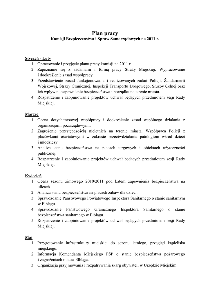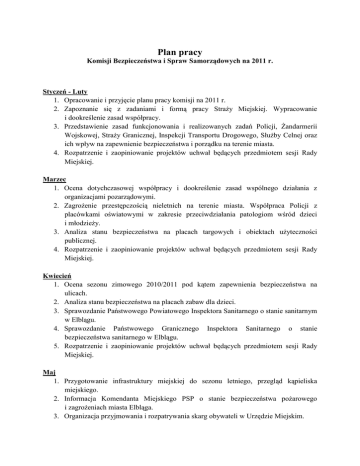 Plan pracy Komisji Bezpieczeństwa i Spraw Samorządowych na 2011 r. Styczeń - Luty 1. Opracowanie i przyjęcie planu pracy komisji na 2011 r. 2. Zapoznanie się z zadaniami i formą pracy Straży Miejskiej. Wypracowanie i dookreślenie zasad współpracy. 3. Przedstawienie zasad funkcjonowania i realizowanych zadań Policji, Żandarmerii Wojskowej, Straży Granicznej, Inspekcji Transportu Drogowego, Służby Celnej oraz ich wpływ na zapewnienie bezpieczeństwa i porządku na terenie miasta. 4. Rozpatrzenie i zaopiniowanie projektów uchwał będących przedmiotem sesji Rady Miejskiej. Marzec 1. Ocena dotychczasowej współpracy i dookreślenie zasad wspólnego działania z organizacjami pozarządowymi. 2. Zagrożenie przestępczością nieletnich na terenie miasta. Współpraca Policji z placówkami oświatowymi w zakresie przeciwdziałania patologiom wśród dzieci i młodzieży. 3. Analiza stanu bezpieczeństwa na placach targowych i obiektach użyteczności publicznej. 4. Rozpatrzenie i zaopiniowanie projektów uchwał będących przedmiotem sesji Rady Miejskiej. Kwiecień 1. Ocena sezonu zimowego 2010/2011 pod kątem zapewnienia bezpieczeństwa na ulicach. 2. Analiza stanu bezpieczeństwa na placach zabaw dla dzieci. 3. Sprawozdanie Państwowego Powiatowego Inspektora Sanitarnego o stanie sanitarnym w Elblągu. 4. Sprawozdanie Państwowego Granicznego Inspektora Sanitarnego o stanie bezpieczeństwa sanitarnego w Elblągu. 5. Rozpatrzenie i zaopiniowanie projektów uchwał będących przedmiotem sesji Rady Miejskiej. Maj 1. Przygotowanie infrastruktury miejskiej do sezonu letniego, przegląd kąpieliska miejskiego. 2. Informacja Komendanta Miejskiego PSP o stanie bezpieczeństwa pożarowego i zagrożeniach miasta Elbląga. 3. Organizacja przyjmowania i rozpatrywania skarg obywateli w Urzędzie Miejskim. 2 4. Informacja o sposobie realizacji zaleceń pokontrolnych skierowanych do miejskiej administracji samorządowej. 5. Rozpatrzenie i zaopiniowanie projektów uchwał będących przedmiotem sesji Rady Miejskiej. Czerwiec 1. Analiza wpływu monitoringu miejskiego na poprawę stanu bezpieczeństwa w mieście. 2. Profilaktyka i rozwiązywanie problemów alkoholowych miasta Elbląga. Funkcjonowanie Pogotowia Socjalnego i ośrodków odwykowo -terapeutycznych. 3. Informacja o działaniu Wydziału Zarządzania Kryzysowego i Ochrony Ludności. 4. Rozpatrzenie i zaopiniowanie projektów uchwał będących przedmiotem sesji Rady Miejskiej. Wrzesień 1. Bezpieczna droga do szkoły – ocena stanu dróg dojścia do szkół. Oznakowania ulic w mieście i jego wpływ na bezpieczeństwo ruchu drogowego. 2. „Bezpieczne Przestrzenie” – strategia zapewnienia bezpieczeństwa społeczności lokalnej. Propagowanie i wdrażanie w codziennym funkcjonowaniu bezpiecznej infrastruktury. 3. Zgłaszanie propozycji do budżetu na 2012r w zakresie spraw związanych z pracą komisji. 4. Rozpatrzenie i zaopiniowanie projektów uchwał będących przedmiotem sesji Rady Miejskiej. Październik 1. Omówienie problematyki wandalizmu w mieście oraz sposobów zapobiegania niszczeniu mienia publicznego i prywatnego. 2. Ocena stanu bezpieczeństwa lokatorów budynków komunalnych w zakresie drożności przewodów kominowych i skuteczności działania wentylacji. 3. Analiza zasadności wprowadzenia zmian do statutu Miasta w zakresie obywatelskiej inicjatywy uchwałodawczej oraz przeprowadzania konsultacji społecznych. 4. Rozpatrzenie i zaopiniowanie projektów uchwał będących przedmiotem sesji Rady Miejskiej. Listopad 1. Analiza bezpieczeństwa, ładu i porządku publicznego w obrębie punktów sprzedających alkohol. 2. Funkcjonowanie komisji wydającej pozwolenia na sprzedaż i podawanie alkoholu. 3. Możliwości przeciwdziałania zjawiskom i zdarzeniom po spożyciu alkoholu. 4. Zabezpieczenie bezdomnych w okresie zimowym - zapoznanie się z przygotowaniami w zakresie pomocy społecznej. 5. Rozpatrzenie i zaopiniowanie projektów uchwał będących przedmiotem sesji Rady Miejskiej. 3 Grudzień 1. Weryfikacja stopnia realizacji planu pracy komisji w 2011r oraz zainicjowanie redagowania sprawozdania z działalności komisji. 2. Przygotowanie propozycji do planu pracy komisji na rok 2012. 3. Analiza stanu bezpieczeństwa i higieny pracy oraz ppoż. w jednostkach podległych organom miasta. 4. Rozpatrzenie i zaopiniowanie projektów uchwał będących przedmiotem sesji Rady Miejskiej. Przewodnicząca Komisji Maria Kosecka