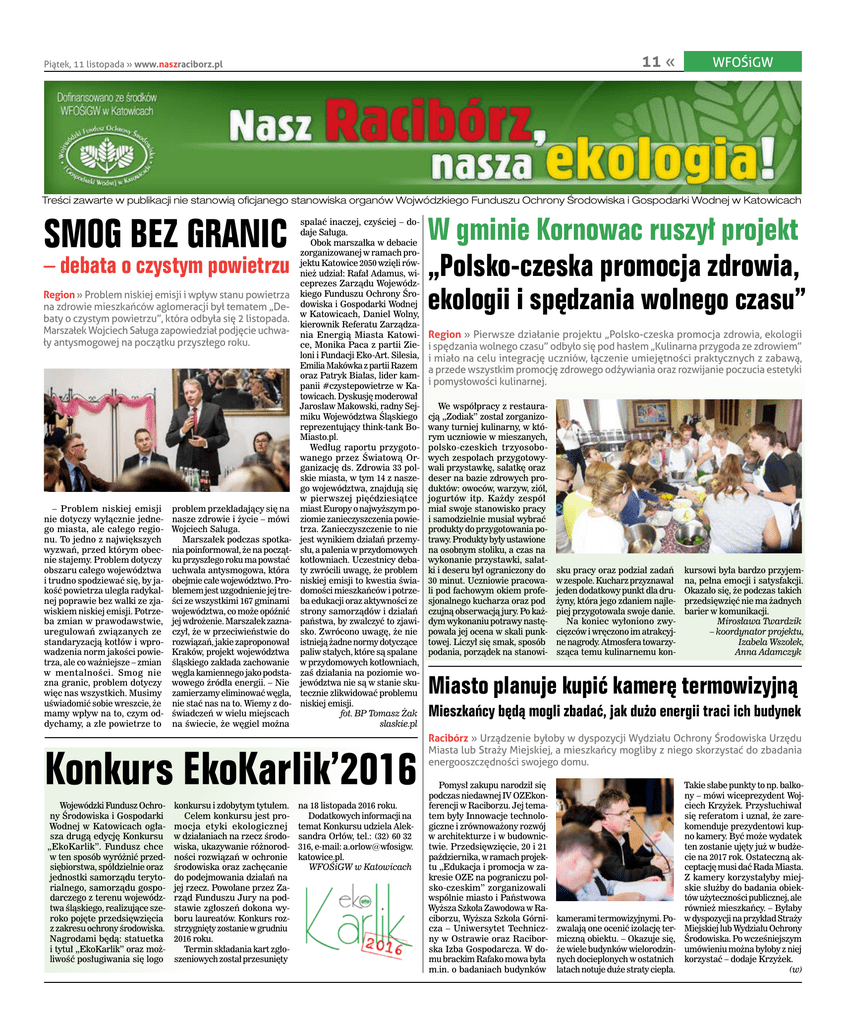 11 « Piątek, 11 listopada » www.naszraciborz.pl WFOŚiGW Treści zawarte w publikacji nie stanowią oficjanego stanowiska organów Wojwódzkiego Funduszu Ochrony Środowiska i Gospodarki Wodnej w Katowicach SMOG BEZ GRANIC – debata o czystym powietrzu Region » Problem niskiej emisji i wpływ stanu powietrza na zdrowie mieszkańców aglomeracji był tematem „Debaty o czystym powietrzu”, która odbyła się 2 listopada. Marszałek Wojciech Saługa zapowiedział podjęcie uchwały antysmogowej na początku przyszłego roku. – Problem niskiej emisji nie dotyczy wyłącznie jednego miasta, ale całego regionu. To jedno z największych wyzwań, przed którym obecnie stajemy. Problem dotyczy obszaru całego województwa i trudno spodziewać się, by jakość powietrza uległa radykalnej poprawie bez walki ze zjawiskiem niskiej emisji. Potrzeba zmian w prawodawstwie, uregulowań związanych ze standaryzacją kotłów i wprowadzenia norm jakości powietrza, ale co ważniejsze – zmian w mentalności. Smog nie zna granic, problem dotyczy więc nas wszystkich. Musimy uświadomić sobie wreszcie, że mamy wpływ na to, czym oddychamy, a złe powietrze to problem przekładający się na nasze zdrowie i życie – mówi Wojciech Saługa. Marszałek podczas spotkania poinformował, że na początku przyszłego roku ma powstać uchwała antysmogowa, która obejmie całe województwo. Problemem jest uzgodnienie jej treści ze wszystkimi 167 gminami województwa, co może opóźnić jej wdrożenie. Marszałek zaznaczył, że w przeciwieństwie do rozwiązań, jakie zaproponował Kraków, projekt województwa śląskiego zakłada zachowanie węgla kamiennego jako podstawowego źródła energii. – Nie zamierzamy eliminować węgla, nie stać nas na to. Wiemy z doświadczeń w wielu miejscach na świecie, że węgiel można spalać inaczej, czyściej – dodaje Saługa. Obok marszałka w debacie zorganizowanej w ramach projektu Katowice 2050 wzięli również udział: Rafał Adamus, wiceprezes Zarządu Wojewódzkiego Funduszu Ochrony Środowiska i Gospodarki Wodnej w Katowicach, Daniel Wolny, kierownik Referatu Zarządzania Energią Miasta Katowice, Monika Paca z partii Zieloni i Fundacji Eko-Art. Silesia, Emilia Makówka z partii Razem oraz Patryk Białas, lider kampanii #czystepowietrze w Katowicach. Dyskusję moderował Jarosław Makowski, radny Sejmiku Województwa Śląskiego reprezentujący think-tank BoMiasto.pl. Według raportu przygotowanego przez Światową Organizację ds. Zdrowia 33 polskie miasta, w tym 14 z naszego województwa, znajdują się w pierwszej pięćdziesiątce miast Europy o najwyższym poziomie zanieczyszczenia powietrza. Zanieczyszczenie to nie jest wynikiem działań przemysłu, a palenia w przydomowych kotłowniach. Uczestnicy debaty zwrócili uwagę, że problem niskiej emisji to kwestia świadomości mieszkańców i potrzeba edukacji oraz aktywności ze strony samorządów i działań państwa, by zwalczyć to zjawisko. Zwrócono uwagę, że nie istnieją żadne normy dotyczące paliw stałych, które są spalane w przydomowych kotłowniach, zaś działania na poziomie województwa nie są w stanie skutecznie zlikwidować problemu niskiej emisji. fot. BP Tomasz Żak slaskie.pl Konkurs EkoKarlik’2016 Wojewódzki Fundusz Ochrony Środowiska i Gospodarki Wodnej w Katowicach ogłasza drugą edycję Konkursu „EkoKarlik”. Fundusz chce w ten sposób wyróżnić przedsiębiorstwa, spółdzielnie oraz jednostki samorządu terytorialnego, samorządu gospodarczego z terenu województwa śląskiego, realizujące szeroko pojęte przedsięwzięcia z zakresu ochrony środowiska. Nagrodami będą: statuetka i tytuł „EkoKarlik” oraz możliwość posługiwania się logo konkursu i zdobytym tytułem. Celem konkursu jest promocja etyki ekologicznej w działaniach na rzecz środowiska, ukazywanie różnorodności rozwiązań w ochronie środowiska oraz zachęcanie do podejmowania działań na jej rzecz. Powołane przez Zarząd Funduszu Jury na podstawie zgłoszeń dokona wyboru laureatów. Konkurs rozstrzygnięty zostanie w grudniu 2016 roku. Termin składania kart zgłoszeniowych został przesunięty na 18 listopada 2016 roku. Dodatkowych informacji na temat Konkursu udziela Aleksandra Orłów, tel.: (32) 60 32 316, e-mail: a.orlow@wfosigw. katowice.pl. WFOŚiGW w Katowicach W gminie Kornowac ruszył projekt „Polsko-czeska promocja zdrowia, ekologii i spędzania wolnego czasu” Region » Pierwsze działanie projektu „Polsko-czeska promocja zdrowia, ekologii i spędzania wolnego czasu” odbyło się pod hasłem „Kulinarna przygoda ze zdrowiem” i miało na celu integrację uczniów, łączenie umiejętności praktycznych z zabawą, a przede wszystkim promocję zdrowego odżywiania oraz rozwijanie poczucia estetyki i pomysłowości kulinarnej. We współpracy z restauracją „Zodiak” został zorganizowany turniej kulinarny, w którym uczniowie w mieszanych, polsko-czeskich trzyosobowych zespołach przygotowywali przystawkę, sałatkę oraz deser na bazie zdrowych produktów: owoców, warzyw, ziół, jogurtów itp. Każdy zespół miał swoje stanowisko pracy i samodzielnie musiał wybrać produkty do przygotowania potrawy. Produkty były ustawione na osobnym stoliku, a czas na wykonanie przystawki, sałatki i deseru był ograniczony do 30 minut. Uczniowie pracowali pod fachowym okiem profesjonalnego kucharza oraz pod czujną obserwacją jury. Po każdym wykonaniu potrawy następowała jej ocena w skali punktowej. Liczył się smak, sposób podania, porządek na stanowi- sku pracy oraz podział zadań w zespole. Kucharz przyznawał jeden dodatkowy punkt dla drużyny, która jego zdaniem najlepiej przygotowała swoje danie. Na koniec wyłoniono zwycięzców i wręczono im atrakcyjne nagrody. Atmosfera towarzysząca temu kulinarnemu kon- kursowi była bardzo przyjemna, pełna emocji i satysfakcji. Okazało się, że podczas takich przedsięwzięć nie ma żadnych