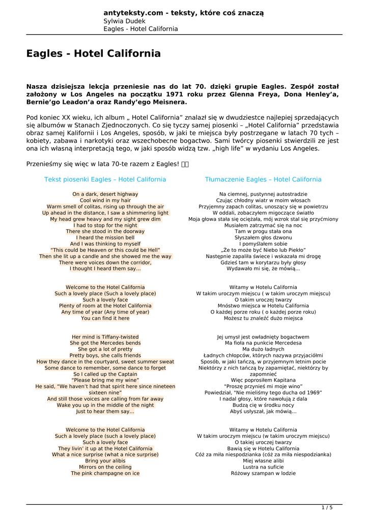 Eagles - Hotel California - antyteksty.com