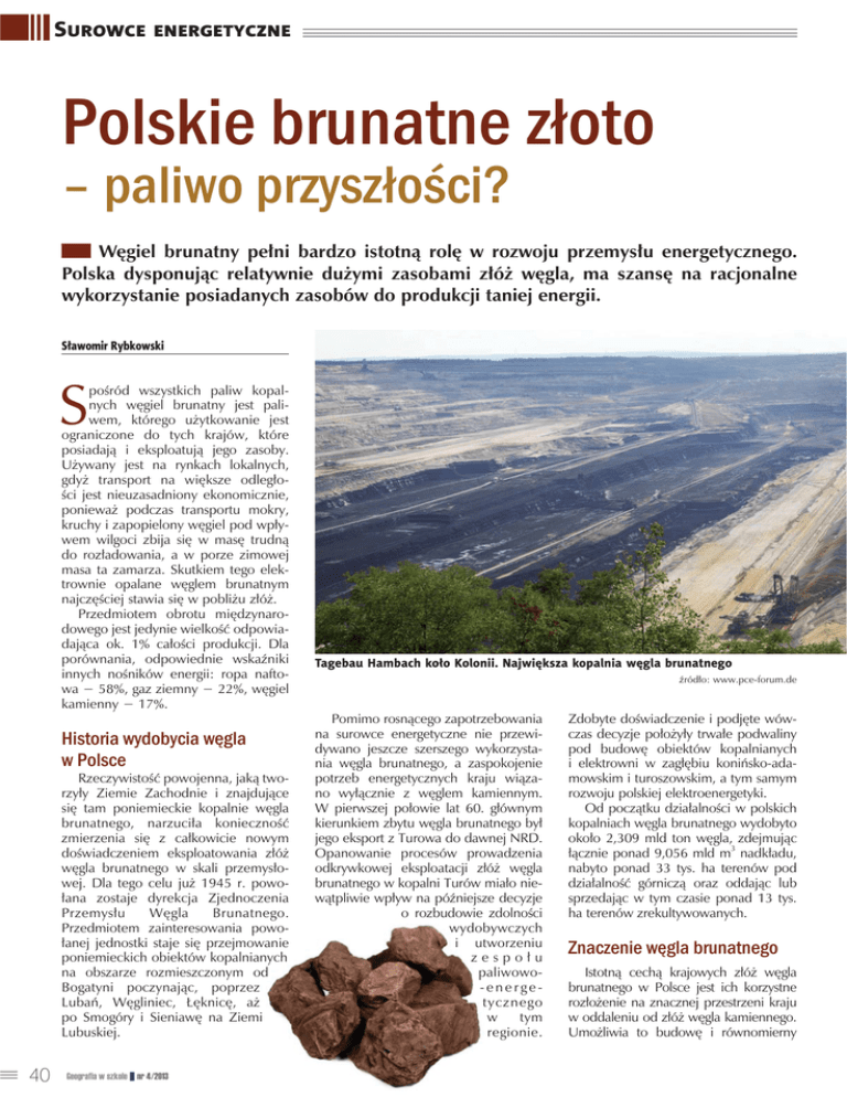 SUROWCE ENERGETYCZNE Polskie brunatne złoto – paliwo przyszłości? Węgiel brunatny pełni bardzo istotną rolę w rozwoju przemysłu energetycznego. Polska dysponując relatywnie dużymi zasobami złóż węgla, ma szansę na racjonalne wykorzystanie posiadanych zasobów do produkcji taniej energii. Sławomir Rybkowski S pośród wszystkich paliw kopalnych węgiel brunatny jest paliwem, którego użytkowanie jest ograniczone do tych krajów, które posiadają i eksploatują jego zasoby. Używany jest na rynkach lokalnych, gdyż transport na większe odległości jest nieuzasadniony ekonomicznie, ponieważ podczas transportu mokry, kruchy i zapopielony węgiel pod wpływem wilgoci zbija się w masę trudną do rozładowania, a w porze zimowej masa ta zamarza. Skutkiem tego elektrownie opalane węglem brunatnym najczęściej stawia się w pobliżu złóż. Przedmiotem obrotu międzynarodowego jest jedynie wielkość odpowiadająca ok. 1% całości produkcji. Dla porównania, odpowiednie wskaźniki innych nośników energii: ropa naftowa − 58%, gaz ziemny − 22%, węgiel kamienny − 17%. Historia wydobycia węgla w Polsce Rzeczywistość powojenna, jaką tworzyły Ziemie Zachodnie i znajdujące się tam poniemieckie kopalnie węgla brunatnego, narzuciła konieczność zmierzenia się z całkowicie nowym doświadczeniem eksploatowania złóż węgla brunatnego w skali przemysłowej. Dla tego celu już 1945 r. powołana zostaje dyrekcja Zjednoczenia Przemysłu Węgla Brunatnego. Przedmiotem zainteresowania powołanej jednostki staje się przejmowanie poniemieckich obiektów kopalnianych na obszarze rozmieszczonym od Bogatyni poczynając, poprzez Lubań, Węgliniec, Łęknicę, aż po Smogóry i Sieniawę na Ziemi Lubuskiej. 40 Geografia w szkole ] nr 4/2013 Tagebau Hambach koło Kolonii. Największa kopalnia węgla brunatnego źródło: www.pce-forum.de Pomimo rosnącego zapotrzebowania na surowce energetyczne nie przewidywano jeszcze szerszego wykorzystania węgla brunatnego, a zaspokojenie potrzeb energetycznych kraju wiązano wyłącznie z węglem kamiennym. W pierwszej połowie lat 60. głównym kierunkiem zbytu węgla brunatnego był jego eksport z Turowa do dawnej NRD. Opanowanie procesów prowadzenia odkrywkowej eksploatacji złóż węgla brunatnego w kopalni Turów miało niewątpliwie wpływ na późniejsze decyzje o rozbudowie zdolności wydobywczych i utworzeniu zespołu paliwowo-energetycznego w tym regionie. Zdobyte doświadczenie i podjęte wówczas decyzje położyły trwałe podwaliny pod budowę obiektów kopalnianych i elektrowni w zagłębiu konińsko-adamowskim i turoszowskim, a tym samym rozwoju polskiej elektroenergetyki. Od początku działalności w polskich kopalniach węgla brunatnego wydobyto około 2,309 mld ton węgla, zdejmując łącznie ponad 9,056 mld m3 nadkładu, nabyto ponad 33 tys. ha terenów pod działalność górniczą oraz oddając lub sprzedając w tym czasie ponad 13 tys. ha terenów zrekultywowanych. Znaczenie węgla brunatnego Istotną cechą krajowych złóż węgla brunatnego w Polsce jest ich korzystne rozłożenie na znacznej przestrzeni kraju w oddaleniu od złóż węgla kamiennego. Umożliwia to budowę i równomierny SUROWCE ENERGETYCZNE Kopalnia Początek wydobycia węgla Odkrywki Rok zakończenia eksploatacji Moc zasilanych elektrowni Wydobycie węgla (mln ton) w 2011 r. rozkład obiektów wytwarzania energii elektrycznej, co skraca drogę jej przesyłu oraz zwiększa bezpieczeństwo dostaw. Złoża węgla brunatnego w Polsce są zlokalizowane w zachodniej i centralnej części kraju. Wydobycie węgla brunatnego prowadzone jest obecnie w czterech kopalniach w oparciu jedynie o 20% udokumentowanych zasobów złóż tego surowca (piąta kopalnia Sieniawa eksploatuje znikome ilości węgla na potrzeby lokalnych odbiorców), przy czym trzy z nich są kopalniami wieloodkrywkowymi (Adamów, Bełchatów, Konin) a jedna (Turów) jest kopalnią jednoodkrywkową. Węgiel brunatny w polskiej energetyce pełni od lat rolę paliwa strategicznego, o czym świadczy ponad 9 000 MW mocy zainstalowanych w elektrowniach opalanych węglem brunatnym i roczna produkcja energii elektrycznej tych elektrowni, która przekracza 50 TWh. Stanowi to około 25% mocy w polskich elektrowniach i około 35% wyprodukowanej energii elektrycznej. Większość wydobycia pochodzi ze złoża Bełchatów − największego zagospodarowanego złoża w Polsce i stanowi ono 61,4% wydobycia krajowego. Węgiel brunatny wydobyty w 2011 r. z największych kopalń został prawie w całości odstawiony do elektrowni. Obecnie Polska jest ósmym co do wielkości na świecie producentem węgla brunatnego z wydobyciem na poziomie ok. 60 mln ton rocznie. Niestety większość obecnie eksploatowanych złóż będzie się wyczerpywać po 2020 roku. Dla krajowego bilansu energetycznego konieczne jest co najmniej utrzymanie obecnego poziomu produkcji energii elektrycznej z węgla brunatnego w okresie I połowy XXI wieku, ponieważ węgiel brunatny to paliwo lokalne i najmniej podatne na koniunkturalne, duże wahania cen. Wszystkie scenariusze rozwoju gospodarczego Polski, formułowane przez Rys. 1. Wydobycie węgla brunatnego w Polsce (1945-2011) Źródło: oprac. własne na podstawie danych z www.ppwb.org.pl oraz http://geoportal.pgi.gov.pl poszczególne rządy RP, przewidują wydobycie węgla brunatnego na poziomie około 60 mln ton rocznie w 2030 roku. Nie określa się w nich jednak, z jakich złóż i w jakich regionach to wydobycie ma być realizowane. Za utrzymaniem strategicznej roli węgla brunatnego w krajowej produkcji energii elektrycznej przemawia: z konieczność zachowania bezpieczeństwa energetycznego kraju, z posiadanie zasobnych złóż węgla brunatnego, z zdecydowana konkurencyjność ekonomiczna w porównaniu z innymi nośnikami produkcji energii elektrycznej, z opanowanie bezpiecznych, wydajnych i nowoczesnych technik odkrywkowej eksploatacji złóż węgla brunat