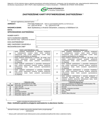 Załącznik nr 25 do Instrukcji usług w zakresie prowadzenia rachunków bankowych, wydawania kart do rachunków oraz usług bankowości elektronicznej dla klientów indywidualnych, SKO i PKZP w Bank Spółdzielczy w Krośnie Odrzańskim – POBRANO ZE STRONY WWW BANKU ZASTRZEŻENIE KARTY/POTWIERDZENIE ZASTRZEŻENIA * stempel nagłówkowy placówki banku ADRESAT: First Data Polska S.A. - SEKCJA ZASTRZEŻEŃ (ZESPÓŁ AUTORYZACJI) FAX.: (22) 515 34 23 TEL.: (22) 515 31 50 NADAWCA-BANK: Bank Spółdzielczy w Krośnie Odrzańskim, zrzeszony w SGB-Bank S.A. DATA : ……………………………….. WPROWADZENIE ZASTRZEŻENIA NUMER KARTY DATA WAŻNOŚCI (MM/RR) data ważności karty - wytłoczona na karcie KOD ZASTRZEŻENIA* IMIĘ I NAZWISKO OKAZICIELA REGION/REGION CRB** 07 41 04 43 0 *KODY ZASTRZEŻENIA VISA karta zostanie zastrzeżona z powodu podejrzeń o nadużywanie numeru karty; karta zostanie zatrzymana przy próbie autoryzacji; numer karty zostanie wprowadzony na stoplistę. karta zostanie zastrzeżona z powodu jej utraty; przy próbie autoryzacji zostanie wydane polecenie zatrzymania karty; karta zostanie wprowadzona na stoplistę. karta zostanie zastrzeżona z powodów bankowych; przy próbie autoryzacji zostanie wydane polecenie zatrzymania karty; karta zostanie wprowadzona na stoplistę. karta zostanie zastrzeżona z powodu kradzieży; przy próbie autoryzacji zostanie wydane polecenie zatrzymania karty; karta zostanie wprowadzona na stoplistę. F L P S X 0 X,X1-X9 A B E F Y Z* **REGION VISA Karta nie wprowadzona do CRB Wszystkie lub wybrane stany USA Azja i Pacyfik Bliski Wschód i Pacyfik Europa Ameryka Łacińska Wszystkie regiony – bez USA Wszystkie regiony CRB 0 1 A B C D E *KODY ZASTRZEŻENIA MasterCard karta zostanie zastrzeżona z powodu podejrzeń o nadużywanie numeru karty; karta zostanie zatrzymana przy próbie autoryzacji; numer karty zostanie wprowadzony na stoplistę. karta zostanie zastrzeżona z powodu jej utraty; przy próbie autoryzacji zostanie wydane polecenie zatrzymania karty; karta zostanie wprowadzona na stoplistę karta zostanie zastrzeżona z powodów bankowych; przy próbie autoryzacji zostanie wydane polecenie zatrzymania karty; karta zostanie wprowadzona na stoplistę karta zostanie zastrzeżona z powodu kradzieży; przy próbie autoryzacji zostanie wydane polecenie zatrzymania karty; karta zostanie wprowadzona na stoplistę karta zostanie zastrzeżona z powodu podejrzeń o używanie fałszywej karty; przy próbie autoryzacji zostanie wydane polecenie zatrzymania karty; karta zostanie wprowadzona na stoplistę **REGION MasterCard karta wprowadzona do MasterCard Authorization File USA (Electronic Warning Bulletin) Kanada Karaiby, Ameryka Łacińska Azja i Pacyfik Europa, Afryka, Bliski Wschód podpis posiadacza/użytkownika karty* Data i dokładna godzina przyjęcia zastrzeżenia w placówce banku: ………………………….. stempel funkcyjny i podpis pracownika placówki banku przyjmującego zastrzeżenie * dotyczy jeśli zastrzeżenie jest dokonywane przez posiadacza/użytkownika karty w placówce banku