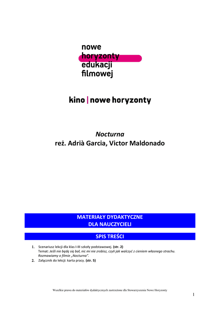 Nocturna reż. Adrià Garcia, Victor Maldonado MATERIAŁY DYDAKTYCZNE DLA NAUCZYCIELI SPIS TREŚCI Scenariusz lekcji dla klas I-III szkoły podstawowej. (str. 2) Temat: Jeśli nie będę się bał, nic mi nie zrobisz, czyli jak walczyd z cieniem własnego strachu. Rozmawiamy o filmie „Nocturna”. Załącznik do lekcji: karta pracy. (str. 5) Wszelkie prawa do materiałów dydaktycznych zastrzeżone dla Stowarzyszenia Nowe Horyzonty 1 SCENARIUSZ LEKCJI DLA KLAS I-III SZKOŁY PODSTAWOWEJ Paulina Krześniak Temat: Jeśli nie będę się bał, nic mi nie zrobisz, czyli jak walczyć z cieniem własnego strachu. Rozmawiamy o filmie Nocturna. CELE LEKCJI Cele lekcji: dwiczenie rekonstruowania poznanej fabuły; zachęcenie dzieci do rozmowy na podejmowane w filmie tematy (lęki i fobie oraz koniecznośd mierzenia się z nimi i podejmowania z nimi walki, drzemiąca w każdym z nas siła wewnętrzna); dwiczenie spostrzegawczości; rozwijanie umiejętności pisania; zachęcenie uczniów do uczestnictwa w rozmowie: zadawania pytao, udzielania odpowiedzi, przedstawiania swoich poglądów i pomysłów; rozwijanie w uczniach umiejętności opowiadania, z uwzględnieniem zasad kultury żywego słowa. METODY I FORMY PRACY pogadanka karta pracy opowiadanie element dyskusji słuchanie piosenki i uzupełnianie luk w tekście burza mózgów ŚRODKI DYDAKTYCZNE Nocturna, reż. A. Garcia, V. Maldonado, Hiszpania 2007 karty pracy dla wszystkich uczniów nagranie piosenki Twoje światło zespołu Arka Noego CZAS: 1 lekcja Wszelkie prawa do materiałów dydaktycznych zastrzeżone dla Stowarzyszenia Nowe Horyzonty 2 PRZEBIEG LEKCJI 1. 2. 3. 4. 5. 6. Wprowadzenie: porządkowanie fabuły. Nauczyciel, zadając uczniom pytania, skłania ich do przypomnienia sobie fabuły obejrzanego wcześniej w kinie filmu. (Tim, mały chłopiec mieszkający w sierociocu, odczuwa ogromny lęk przed ciemnością. Kiedy pewnego razu wychodzi na dach sierocioca, odkrywa, że jego ulubiona gwiazda – Adhara zniknęła. Tim poznaje tam Pasterza Kotów, z których każdy strzeże nocą snu jednego dziecka. Tim jednak nie potrafi zasnąd bez świadomości, że na niebie świeci jego ulubiona gwiazda, dlatego pragnie ją odnaleźd. Przekonuje Pasterza, aby zabrał go do Moki – strażnika nocy, którego prosi o wyjaśnienie sytuacji i odzyskanie gwiazdy. Moka nie reaguje jednak na prośby chłopca, zbywa go informacją, że za gwiazdy na niebie odpowiada Gwiezdny Mistrz. Tim prosi więc Pasterza, aby zabrał go do Latarni Gwiazd, w której mieszka Gwiezdny Mistrz. Tim z towarzyszami przemierzają ulice Krainy Nocy, podczas gdy kolejne gwiazdy gasną, a Krainie zaczyna grozid niebezpieczeostwo pogrążenia się w mroku. Z czasem okazuje się, że źródłem zagrożenia jest sam Tim, a raczej jego lęk przed ciemnością. Dlatego właśnie chłopiec sam musi zmierzyd się z cieniem, by uratowad Nocturnę. Timowi udaje się przezwyciężyd strach i ocalid Krainę Nocy.) Karta pracy. Prowadzący rozdaje dzieciom karty pracy i prosi o wykonanie pierwszego polecenia. Osoby, które najszybciej odnajdą hasła (gwiazdy, księżyc, lampka) można nagrodzid plusami. Pogadanka. Nauczyciel pyta dzieci, kim była Adhara i dlaczego była ona tak ważna dla Tima. Warto dodatkowymi pytaniami naprowadzid dzieci na odpowiedź, że Adhara to ukochana gwiazda Tima, która nad nim czuwa, a spojrzenie na nią zawsze ułatwia chłopcu zaśnięcie. Element dyskusji. Wcześniejsze rozważania stają się punktem wyjścia do postawienia przez nauczyciela pytania, czy lęk Tima miał jakieś podstawy. Nauczyciel zwraca uwagę, by dzieci uzasadniały swoje zdanie. Możliwe odpowiedzi: Lęk Tima miał podstawy, ponieważ noc/ciemnośd może wydawad się straszna: nie widzimy wtedy otaczających nas osób i przedmiotów, a także możliwych zagrożeo. Lęk Tima był bezpodstawny: noc jest po prostu porą doby, nie bardziej groźną niż dzieo. Podsumowując rozmowę, nauczyciel zwraca uwagę uczniów na to, dlaczego ciemnośd często wydaje się dzieciom straszna. Słuchanie piosenki, karta pracy. Nauczyciel odtwarza uczniom piosenkę zespołu Arka Noego pt. Twoje światło i prosi ich o uzupełnienie luk we fragmencie tekstu (polecenie drugie z karty pracy). Po wykonaniu dwiczenia nauczyciel sprawdza je wspólnie z uczniami. Pogadanka. Nauczyciel zwraca uwagę uczniów na to, że nieuzasadniony, chorobliwy lęk przed ciemnością ma swoją nazwę: nyktofobia i jest traktowany jako zaburzenie. Prowadzący zachęca dzieci by zaproponowały, jak pomóc osobie cierpiącej na nyktofobię i podały sposoby radzenia sobie z nią. (Możliwe propozycje: zasypianie z ulubioną maskotką; oswajanie się z ciemnością przez krótkie, np. kilkuminutowe, pobyty w ciemnym pomieszczeniu za dnia; zapalanie światła w chwili odczuwania lęku i uświadamianie sobie, że po ciemku w pokoju wszystko jest tak samo, wszystkie Wszelkie prawa do materiałów dydaktycznych zastrzeżone dla Stowarzyszenia Nowe Horyzonty 3 przedmioty leżą w tych samych miejscach; zostawianie przy łóżku wody lub innego napoju, którego można się napid w każdej chwili nocą itd.). 7. Karta pracy. Poprzedni element lekcji staje się punktem wyjścia do wykonania przez uczniów trzeciego polecenia z kart pracy. Prowadzący prosi dzieci, by wczuły się w rolę psychologów i proponowane przez siebie rozwiązania zapisały w formie zaleceo na druku recepty. Wybrani lub chętni uczniowie czytają swoje odpowiedzi na forum klasy. 8. Burza mózgów. Prowadzący pyta uczniów, czego – poza ciemnością – panicznie boją się niektórzy ludzie (możliwe odpowiedzi: pająków, myszy, zamkniętych pomieszczeo, otwartych przestrzeni, latania samolotem, przebywania na dużej wysokości, widoku krwi). Jeżeli któreś dziecko zechce, może podzielid się swoimi doświadczeniami. 9. Podsumowanie: pogadanka. Nauczyciel zwraca uwagę dzieci na fakt, że warto walczyd ze swoimi nieuzasadnionymi lękami. Warto, tak 