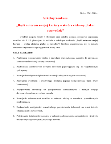 Bielice, 27.09.2016 r. Szkolny konkurs „Bądź autorem swojej kariery – stwórz ciekawy plakat o zawodzie” Dyrektor Zespołu Szkół w Bielicach oraz szkolny doradca zawodowy zapraszają uczniów klas I i II gimnazjum do udziału w szkolnym konkursie „Bądź autorem swojej kariery – stwórz ciekawy plakat o zawodzie”. Konkurs organizowany jest w ramach obchodów Ogólnopolskiego Tygodnia Kariery 2016. CELE KONKURSU 1. Pogłębianie i promowanie wiedzy o zawodach oraz zachęcanie uczniów do aktywnego konstruowania własnej kariery zawodowej. 2. Rozbudzanie zainteresowań nowymi zawodami pojawiającymi się na współczesnym rynku pracy. 3. Rozwijanie umiejętności planowania własnej kariery edukacyjno-zawodowej. 4. Rozwijanie wyobraźni i kreatywnego myślenia poprzez komponowanie treści pracy konkursowej. 5. Przygotowanie młodzieży do podejmowania samodzielnych i trafnych decyzji dotyczących wyboru przyszłego zawodu. 6. Rozwijanie zainteresowań uczniów w zakresie wiedzy o zawodach, poszukiwanych kwalifikacjach. 7. Doskonalenie umiejętności samodzielnego pozyskiwania informacji na temat ścieżek edukacyjnych i zawodowych, 8. Podniesienie świadomości uczniów w zakresie podejmowania samodzielnych i trafnych decyzji dotyczących wyboru przyszłego zawodu. ZASADY KONKURSU 1. Konkurs polega na stworzeniu przez ucznia/uczniów klasy I lub II gimnazjum ciekawego plakatu o wybranym zawodzie. 2. Plakat powinien zawierać następujące dane: nazwę zawodu, kod zawodu, przeciwwskazania do wykonywania danego zawodu, wskazane cechy osobowości, predyspozycje i preferencje zawodowe, warunki i miejsce pracy, czynności jakie wykonuje się w zawodzie, ścieżkę edukacyjną i kariery danego zawodu, informację zawierające przykłady osób pracujących w wybranym zawodzie. 3. Każdy gimnazjalista może zgłosić dowolną ilość prac konkursowych. 4. Dopuszcza się możliwość pracy grupowej, jednak ilość osób zgłaszających pracę grupową nie może przekroczyć 3 osób. 5. Opiekę merytoryczną nad uczestnikami konkursu sprawuje wychowawca klasy. 6. Plakaty należy najpóźniej do dnia 11 października 2016 r. złożyć w gabinecie szkolnego doradcy zawodowego (sala nr 51, godziny przyjęć wtorki 8.00-13.00) lub w gabinecie pedagoga szkolnego. 7. Na odwrotnej stronie plakatu konieczne jest podanie następujących danych: imię i nazwisko autora/autorów, oznaczenie klasy, nazwisko wychowawcy. 8. Ogłoszenie wyników konkursu odbędzie się w dniu 18.10.2016. Wszystkie plakaty zostaną wyeksponowane na holu szkoły w ramach obchodów Ogólnopolskiego Tygodnia Kariery. 9. Wskazane wykonanie plakatów na dużym formacie. 10. Jury poza pomysłowością i estetyką plakatu będzie oceniać czy plakat zawiera: kod zawodu, przeciwwskazania do wykonywania danego zawodu, wskazane cechy osobowości, predyspozycje i preferencje zawodowe, warunki i miejsce pracy, czynności jakie wykonuje się w zawodzie, ścieżkę edukacyjną i kariery danego zawodu, informację zawierające przykłady osób pracujących w wybranym zawodzie. Szkolny doradca zawodowy Iwona Krajewska Dyrektor Zespołu Szkół w Bielicach Marzena Gapska