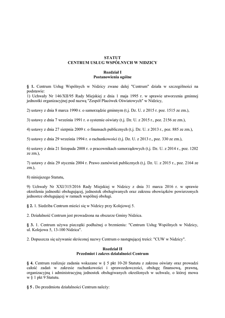STATUT CENTRUM USŁUG WSPÓLNYCH W NIDZICY Rozdział I Postanowienia ogólne § 1. Centrum Usług Wspólnych w Nidzicy zwane dalej "Centrum" działa w szczególności na podstawie: 1) Uchwały Nr 146/XII/95 Rady Miejskiej z dnia 1 maja 1995 r. w sprawie utworzenia gminnej jednostki organizacyjnej pod nazwą "Zespół Placówek Oświatowych" w Nidzicy, 2) ustawy z dnia 8 marca 1990 r. o samorządzie gminnym (t.j. Dz. U. z 2015 r. poz. 1515 ze zm.), 3) ustawy z dnia 7 września 1991 r. o systemie oświaty (t.j. Dz. U. z 2015 r., poz. 2156 ze zm.), 4) ustawy z dnia 27 sierpnia 2009 r. o finansach publicznych (t.j. Dz. U. z 2013 r., poz. 885 ze zm.), 5) ustawy z dnia 29 września 1994 r. o rachunkowości (t.j. Dz. U. z 2013 r., poz. 330 ze zm.), 6) ustawy z dnia 21 listopada 2008 r. o pracownikach samorządowych (t.j. Dz. U. z 2014 r., poz. 1202 ze zm.), 7) ustawy z dnia 29 stycznia 2004 r. Prawo zamówień publicznych (t.j. Dz. U. z 2015 r., poz. 2164 ze zm.), 8) niniejszego Statutu, 9) Uchwały Nr XXI/315/2016 Rady Miejskiej w Nidzicy z dnia 31 marca 2016 r. w sprawie określenia jednostki obsługującej, jednostek obsługiwanych oraz zakresu obowiązków powierzonych jednostce obsługującej w ramach wspólnej obsługi. § 2. 1. Siedziba Centrum mieści się w Nidzicy przy Kolejowej 5. 2. Działalność Centrum jest prowadzona na obszarze Gminy Nidzica. § 3. 1. Centrum używa pieczątki podłużnej o brzmieniu: "Centrum Usług Wspólnych w Nidzicy, ul. Kolejowa 5, 13-100 Nidzica". 2. Dopuszcza się używanie skróconej nazwy Centrum o następującej treści: "CUW w Nidzicy". Rozdział II Przedmiot i zakres działalności Centrum § 4. Centrum realizuje zadania wskazane w § 5 pkt 10-20 Statutu z zakresu oświaty oraz prowadzi całość zadań w zakresie rachunkowości i sprawozdawczości, obsługę finansową, prawną, organizacyjną i administracyjną jednostek obsługiwanych określonych w uchwale, o której mowa w § 1 pkt 9 Statutu. § 5 . Do przedmiotu działalności Centrum należy: 1) obsługa finansowa jednostek obsługiwanych oraz prowadzenie w całości zadań w zakresie rachunkowości i sprawozdawczości, w szczególności: a) opracowywanie projektów uregulowań wewnętrznych jednostek obsługiwanych dotyczących rachunkowości, b) prowadzenie ksiąg rachunkowych obsługiwanych jednostek zgodnie z obowiązującymi przepisami, c) sporządzanie sprawozdań finansowych i budżetowych oraz przedkładanie ich odpowiednim organom, d) wykonywanie dyspozycji środkami pieniężnymi zleconych przez kierowników jednostek obsługiwanych, e) rozliczanie inwentaryzacji składników majątkowych jednostek obsługiwanych, f) obsługa księgowa funduszu świadczeń socjalnych, w tym funduszu mieszkaniowego tworzonego ze środków wydzielonych z zakładowych funduszy świadczeń socjalnych jednostek obsługiwanych, g) koordynacja i pomoc przy opracowywaniu projektów planów dochodów i wydatków dla poszczególnych jednostek obsługiwanych oraz w opracowywaniu zmian do tych planów, h) gromadzenie, przechowywanie i archiwizowanie dokumentacji finansowo- księgowej, i) prowadzenie obsługi rachunków bankowych, j) prowadzenie obsługi kasowej obsługiwanych jednostek, k) sprawowanie bieżącej kontroli i analizowanie realizacji planów finansowych, l) prowadzenie obsługi płacowej obsługiwanych jednostek, w szczególności: - sporządzanie list płac oraz dokonywanie wypłat wynagrodzeń i innych należności, - prowadzenie kart wynagrodzeń i kart zasiłkowych, - prowadzenie analizy wypłat z osobowego funduszu płac, - naliczanie zasiłku chorobowego, - sporządzanie deklaracji dla Urzędu Skarbowego i Zakładu Ubezpieczeń Społecznych oraz wszelkiej dokumentacji dla ZUS, - wystawianie zaświadczeń o zatrudnieniu i wynagrodzeniu dla obecnych i byłych pracowników podległych jednostek, dla celów emerytalnych, - rozliczanie średniego wynagrodzenia nauczycieli do sprawozdania o średniorocznym wynagrodzeniu nauczycieli, ł) zapewnienie realizacji zadań głównej księgowej dla obsługiwanych jednostek, 2) obsługa prawna obsługiwanych jednostek, 3) obsługa informatyczna obsługiwanych jednostek, 4) przygotowywanie i przeprowadzanie postępowań o udzielenie zamówień publicznych zgodnie z przepisami Prawa zamówień publicznych na wniosek i w porozumieniu z kierownikami jednostek obsługiwanych oraz przedkładanie im do zatwierdzenia, 5) obsługa kadrowa jednostek obsługiwanych: Szkoły Podstawowej im. prof. R. Kobendzy w Łynie, Szkoły Podstawowej im. Jana Pawła II w Napiwodzie, Szkoły Podstawowej im. St. Mikołajczyka w Rączkach, Przedszkola Nr 2 w Nidzicy, Przedszkola Nr 4"KRAINA ODKRYWCÓW" w Nidzicy w zakresie: a) przygotowywania na polecenie dyrektora jednostki obsługiwanej zgodnie z obowiązującymi przepisami Kodeksu Pracy i Karty Nauczyciela: - dokumentów dotyczących nawiązywania i rozwiązywania stosunku pracy oraz związanych z przebiegiem zatrudnienia, - dokumentów związanych z ustaleniem wynagrodzeń za pracę, dodatków, nagród i innych świadczeń przysługujących nauczycielom i pracownikom, - pism w sprawie udzielania urlopów bezpłatnych, wychowawczych, informacji o urlopie macierzyńskim, b) prowadzenie akt osobowych, c) przygotowywanie i przeprowadzanie procedury naboru na wolne stanowisko, d) sporządzanie zaświadczeń o zatrudnieniu i świadectw pracy, e) rejestrowanie i wyrejestrowywanie pracowników w ZUS, f) ustalanie uprawnień do wypłaty odpraw, odszkodowań, dodatków stażowych, nagród jubileuszowych i przygotowywanie dokumentów w tym zakresie, g) przygotowywanie danych potrzebnych do sprawozdań statystycznych dotyczących zatrudnienia, h) archiwizowanie posiadanych dokumentów kadrowych, 6) obsługa kadrowa jednostki obsługiwanej Miejskiego Ośrodka Sportu i Rekreacji w Nidzicy w zakresie: a) przygotowywania na polecenie dyrektora jednostki obsługiwanej zgodnie z obowiązującymi przepisami Kodeksu Pracy i Karty Nauczyciela: - doku
