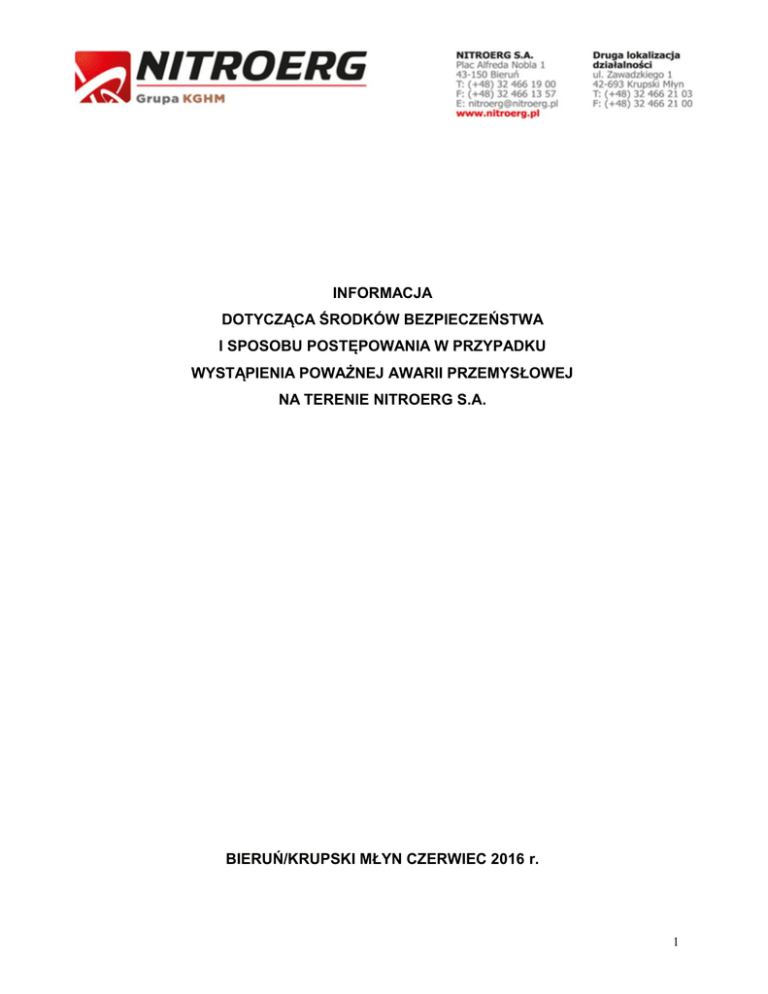 INFORMACJA DOTYCZĄCA ŚRODKÓW BEZPIECZEŃSTWA I SPOSOBU POSTĘPOWANIA W PRZYPADKU WYSTĄPIENIA POWAŻNEJ AWARII PRZEMYSŁOWEJ NA TERENIE NITROERG S.A. BIERUŃ/KRUPSKI MŁYN CZERWIEC 2016 r. 1 NITROERG S.A. - ZAKŁAD O DUŻYM RYZYKU WYSTĄPIENIA POWAŻNEJ AWARII PRZEMYSŁOWEJ NITROERG S.A. jest świadomy spoczywającej na nim odpowiedzialności za bezpieczeństwo instalacji. Polityka bezpieczeństwa naszej Spółki deklaruje, że instalacje i urządzenia utrzymywane są na najwyższym poziomie technicznym. Prowadzony jest dialog z władzami lokalnymi i Kierownictwem firm sąsiadujących w zakresie bezpieczeństwa. Jako firma społecznie odpowiedzialna działamy w celu stworzenia bezpiecznych miejsc pracy dla naszych pracowników. Posiadany przez naszą firmę certyfikat zintegrowanego systemu zarządzania jakością i środowiskiem, zgodny z międzynarodowymi standardami ISO 9001 i 14001, a tym samym udokumentowany system jest gwarancją dla władz i społeczności lokalnej, że działalność firmy przebiega pod kontrolą, w zgodzie z przepisami prawa i wymogami bezpieczeństwa. Systematycznie przeprowadzane są praktyczne ćwiczenia zgodnie z założeniami wewnętrznego planu operacyjno-ratowniczego z udziałem jednostek Państwowej Straży Pożarnej, jednostek Ochotniczej Straży Pożarnej, Centrum Zarządzania Kryzysowego (starostwa, gminy), Policji, jednostek Pogotowia Ratunkowego oraz przedstawicielami Nadleśnictwa. Doświadczeni specjaliści na bieżąco oceniają bezpieczeństwo procesowe prowadzonych procesów i eksploatowanych instalacji. Przeprowadzona ocena stosowanych rozwiązań i warunków organizacyjno-technicznych istniejących systemów zabezpieczeń dla wszystkich instalacji, które tego wymagają wykazała, że zapewniają one bezpieczeństwo procesowe. Zgodnie z wymaganiami nakładającymi obowiązki prowadzącemu zakład dużego ryzyka stwarzającego zagrożenie wystąpienia poważnej awarii przemysłowej: 1. Ustawa z dnia 27 kwietnia 2001 roku Prawo ochrony środowiska (POŚ - Dz. U. 2013 r. nr 0 poz.1232 z późniejszymi zmianami) Tytuł IV „Poważne awarie”, Dział II „Instrumenty prawne służące przeciwdziałaniu poważnej awarii przemysłowej”), art.250, art. 261 ust. 5, art. 261a (Dz.U. z 2015 r. pozycja 1434); 2. Rozporządzenie Ministra Rozwoju z dnia 29 stycznia 2016 r. w sprawie rodzajów i ilości znajdujących się w zakładzie substancji niebezpiecznych, decydujących o zaliczeniu zakładu do zakładu o zwiększonym lub dużym ryzyku wystąpienia poważnej awarii przemysłowej (Dz. U. z 2 luty 2016 r. poz.138); prowadzący podaje do publicznej wiadomości informacje o instalacji zakwalifikowanej do zakładu dużego ryzyka – ZDR. 2 NITROERG S.A. dokonał zgłoszenia Zakładu właściwemu organowi PSP tj. Śląskiemu Komendantowi Wojewódzkiemu PSP w Katowicach (art. 250 ust. 1 POŚ), posiada aktualne dokumenty systemu bezpieczeństwa: 1. Zgłoszenie zakładu - 1 wspólny dokument dla lokalizacji Bieruń i Krupski Młyn. 2. Program Zapobiegania Poważnym Awariom (PZPA) - 1 wspólny dokument dla lokalizacji Bieruń i Krupski Młyn. 3. Raport o Bezpieczeństwie (RoB) w NITROERG S.A. funkcjonują 2 odrębne dokumenty: - dla lokalizacji Bieruń - dla lokalizacji Krupski Młyn 4. Wewnętrzny Plan Operacyjno Ratowniczy (WPOR) w NITROERG S.A. funkcjonują 2 odrębne dokumenty: - dla lokalizacji Bieruń - (dodatkowo zakład przekazuje informacje do zewnętrznego planu operacyjno-ratowniczego); - dla lokalizacji Krupski Młyn Zakład dostarczył informacje na temat środków bezpieczeństwa i sposobu postepowania instytucjom służącym społeczeństwu, podmiotom służącym społeczeństwu oraz zakładom sąsiednim. 1. Oznaczenie prowadzącego zakład oraz adres zakładu Prezes Zarządu – Grzegorz Sosna 43-150 Bieruń Plac Alfreda Nobla 1 oraz kierującego zakładem, adres zamieszkania: Lokalizacja Krupski Młyn Dyrektor ds. Inwestycji i Nadzoru Technicznego – Jacek Gębski 42-693 Krupski Młyn ul. Zawadzkiego 1 Lokalizacja Bieruń Dyrektor Zakładu Materiałów Wybuchowych Emulsyjnych – Rafał Szudeja 43-150 Bieruń Plac Alfreda Nobla 1 2. Adres zakładu NITROERG S.A. 43-150 Bieruń Plac Alfreda Nobla 1 Lokalizacja działalności: Bieruń, 43-150 Bieruń, Plac Alfreda Nobla 1 Lokalizacja działalności: Krupski Młyn, 42-693 Krupski Młyn ul. Zawadzkiego 1. Adres internetowy zakładu: www.nitroerg.pl 3 3. Charakter prowadzonej działalności NITROERG S.A. Przedmiotem działalności zakładu jest m.in. produkcja: ∑ materiałów wybuchowych; ∑ chemikaliów nieorganicznych i organicznych; oraz ∑ świadczenie usług związanych z działalnością produkcyjną; ∑ prace badawczo – rozwojowe; ∑ działalność w zakresie inżynierii i związane z nią doradztwo techniczne; ∑ świadczenie usług transportowych, remontowych; ∑ gospodarowanie odpadami; ∑ odzysk i unieszkodliwiania odpadów; ∑ import i eksport towarów i usług; ∑ prowadzenie działalności handlowej w kraju i zagranicą. Szczegółowy opis działalności zawiera KRS z dnia 28.04.2011r stanowiący załącznik do niniejszego pisma. 4. Rodzaje substancji niebezpiecznych i ich kategoria Substancje decydujące o zaliczeniu zakładu NITROPERG S.A. do zakładu dużego ryzyka klasyfikowane wg obowiązującego rozporządzenia to substancje stwarzające: zagrożenia fizyczne: H200, H201, H301, H330,, H331, H310, H371, H411; zagrożenie dla środowiska: NITROCET 50 H302, H312, H332,H411; azotan amonu CAS 6484-52-2, amoniak bezwodny CAS 7664-41-7. 5. Informacje dotyczące scenariuszy potencjalnych poważnych awarii i ocena ryzyka W celu określenia zagrożeń wykorzystano metody porównawcze oparte na zdobytym doświadczeniu oraz wykorzystano wiedzę specjalistów biorących udział w analizie obejmującej identyfikację zagrożeń. Prawdopodobieństwo wystąpienia zdarzenia/awarii poddano ocenie oraz przeprowadzono identyfikację zagrożeń i analizę ryzyka (m.in. uwolnienie