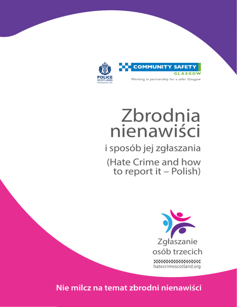Zbrodnia nienawiści i sposób jej zgłaszania (Hate Crime and how to report it – Polish) Zgłaszanie osób trzecich Nie milcz na temat zbrodni nienawiści Zgłaszanie osób trzecich „Rząd Szkocji wierzy, że zbrodnia nienawiści jest zjawiskiem nieakceptowalnym w dzisiejszej Szkocji i dążymy do wyplenienia jej z naszego społeczeństwa”. Alex Neil MSP, poseł parlamentu szkockiego, sekretarz gabinetu ds. sprawiedliwości społecznej, społeczności i praw emerytów/rencistów CZYM JEST ZBRODNIA NIENAWIŚCI Rząd Szkocji definiuje zbrodnię nienawiści jako przestępstwo popełnianie przeciwko osobie lub własności, które jest umotywowane „złośliwością lub złą wolą w stosunku do określonej grupy społecznej”. Możliwe, że jesteś ofiarą zbrodni nienawiści, jeśli uważasz, że napaść była spowodowana Twoją: • rasą, • religią, • orientacją seksualną, • identyfikacją płciową, •niepełnosprawnością. Jeśli uważasz, że padłeś/aś ofiarą zbrodni nienawiści z któregokolwiek z powyższych powodów, powiedz o tym policji. Traktuje ona zbrodnię nienawiści bardzo poważnie. Jeśli zgłosisz, że zdarzenie było umotywowane uprzedzeniem, policja musi je zarejestrować i przeprowadzić śledztwo. Zbrodnia nienawiści przybiera wiele form, włączając w to bez ograniczeń: • akt przemocy; • celowe uszkodzenie mienia, np. graffiti, podpalenie, wandalizm; • poniżanie lub grożenie w tym obsceniczne okrzyki lub gesty; • nadużycia w Internecie, takie jak posty na Facebooku czy Twitterze; • obraźliwa literatura, jak listy, ulotki czy plakaty; • przemoc słowna lub obrażanie, w tym przezywanie; • przemoc emocjonalna lub psychiczna; •nękanie; •morderstwo. Czym jest zbrodnia nienawiści? 2 Co jeśli doświadczę lub będę świadkiem zbrodni nienawiści lub aktu nienawiści Jeśli doświadczasz lub jesteś świadkiem zbrodni nienawiści – niezależnie od tego, czy jest to przestępstwo czy też nie, i tego, jak trywialne i nieistotne może się to wydawać – skarga zostanie zarejestrowana i potraktowana poważnie, jeśli zdecydujesz się zgłosić ją policji. Możesz dokonać zgłoszenia: • • • za pośrednictwem centrum zgłoszeń dla osób trzecich (Third Party Reporting Centre); dzwoniąc pod numer 101; za pośrednictwem internetowego narzędzia do zgłaszania dostępnego na stronie szkockiej Policji. PAMIĘTAJ – JEŚLI POTRZEBUJESZ NATYCHMIASTOWEJ POMOCY, ZAWSZE DZWOŃ POD 999. Dlaczego należy zgłaszać przypadki zbrodni nienawiści? Istnieje wiele powodów, dla których zgłaszanie zbrodni nienawiści jest takie ważne. • • • • • • • Jeśli jesteś ofiarą, możesz otrzymać wsparcie i poradę, by poczuć się bezpieczniej Może to powstrzymać sprawcę przed kolejnym atakiem Wszelkie zgłoszenia pomogą w zbudowaniu obrazu zbrodni nienawiści w Twojej społeczności i całym Glasgow. Powiedz nam, jeśli problem istnieje w konkretnej okolicy lub jeśli celem jest dana społeczność. Wówczas możemy stawić czoła temu problemowi. Możemy zapobiec drobnym sytuacjom, które przekształcają się w te bardziej poważne Pomoże to zwiększyć świadomość na temat tej kwestii i doprowadzi do zmiany podejścia Dostarczone informacje mogą doprowadzić do aresztowania i skazania danej osoby Pomożesz nam zapobiec przyszłym incydentom nienawiści Czym jest zbrodnia nienawiści? 3 Czym jest zgłaszanie przez osoby trzecie? Wiele osób z różnych powodów niechętnie zgłasza przestępstwa bezpośrednio policji. Ofiary i świadkowie zbrodni nienawiści mogą dokonać zgłoszenia za pośrednictwem centrum zgłoszeń dla osób trzecich, nie kontaktując się bezpośrednio z policją. Centrum zgłoszeń dla osób trzecich to bezpieczna i pełna wsparcia przestrzeń, w której można omówić swoją skargę. Jeśli chcesz zgłosić ją policji, mogą zrobić to w Twoim imieniu. Policja będzie działać tak samo, jak gdyby otrzymała zgłoszenie bezpośrednio od Ciebie. W centrum zgłoszeń dla osób trzecich można poprosić o przekazanie policji tylko tylu informacji, ile Ty chcesz – nie musisz podawać swojego imienia i nazwiska, jeśli sobie tego nie życzysz. Centra te przeszły odpowiednie szkolenia i mogą zapewniać jakiekolwiek potrzebne dodatkowe wsparcie czy porady. Listę niektórych centrów zgłoszeń dla osób trzecich w Glasgow można znaleźć na końcu tej ulotki. Aby zapoznać się z pełną listą, należy odwiedzić witrynę www.hatecrimescotland.org lub www.scotland.police.uk W jaki sposób mogę zgłosić sprawę policji za pośrednictwem Internetu? Dzięki internetowemu narzędziu do zgłaszania możesz dokonać zgłoszenia w sposób bezpośredni i poufny za pośrednictwem witryny internetowej policji. Zgłoszenie może być anonimowe, jednak może to ograniczyć działania, jakie mogą zostać podjęte przez policję. Aby dokonać zgłoszenia za pośrednictwem Internetu, odwiedź witrynę www.scotland.police.uk i kliknij Report Hate Crime (Zgłoś zbrodnię nienawiści). Czym jest zbrodnia nienawiści? 4 Centra zgłoszeń dla osób trzecich w Glasgow British Deaf Association (Scotland) 1st Floor Central Chambers Suite 58 93 Hope St Glasgow, G2 6LD 0141 2485554 Ethnic Minorities Law Centre 41 St Vincent Place Glasgow, G1 2ER 0141 2042888 Queens Cross Housing 45 Firhill Road Glasgow, G20 7BE 0141 5897424 Glasgow Centre For Inclusive Living 117-127 Brook Street Glasgow, G40 3AP 0141 5507468 Maryhill Integration Network 35 Avenuepark St Glasgow, G20 8TS 0141 9469106 Victim Support Scotland Abbey House, 2nd Floor 10 Bothwell Street, Glasgow, G2 6LU 0141 5532415 Glasgow Disability Alliance Unit 301Templeton Business Centre Templeton St Glasgow, G40 1DA 0141 5567103 Czym jest zbrodnia nienawiści? Amina Muslim Women’s Resource Centre 0808 8010301 Ardenglen Housing Association 355 Tormusk Rd Castlemilk Glasgow, G45 0HF 0141 6348016 Elderpark Housing Association 31 Garmouth Street Go