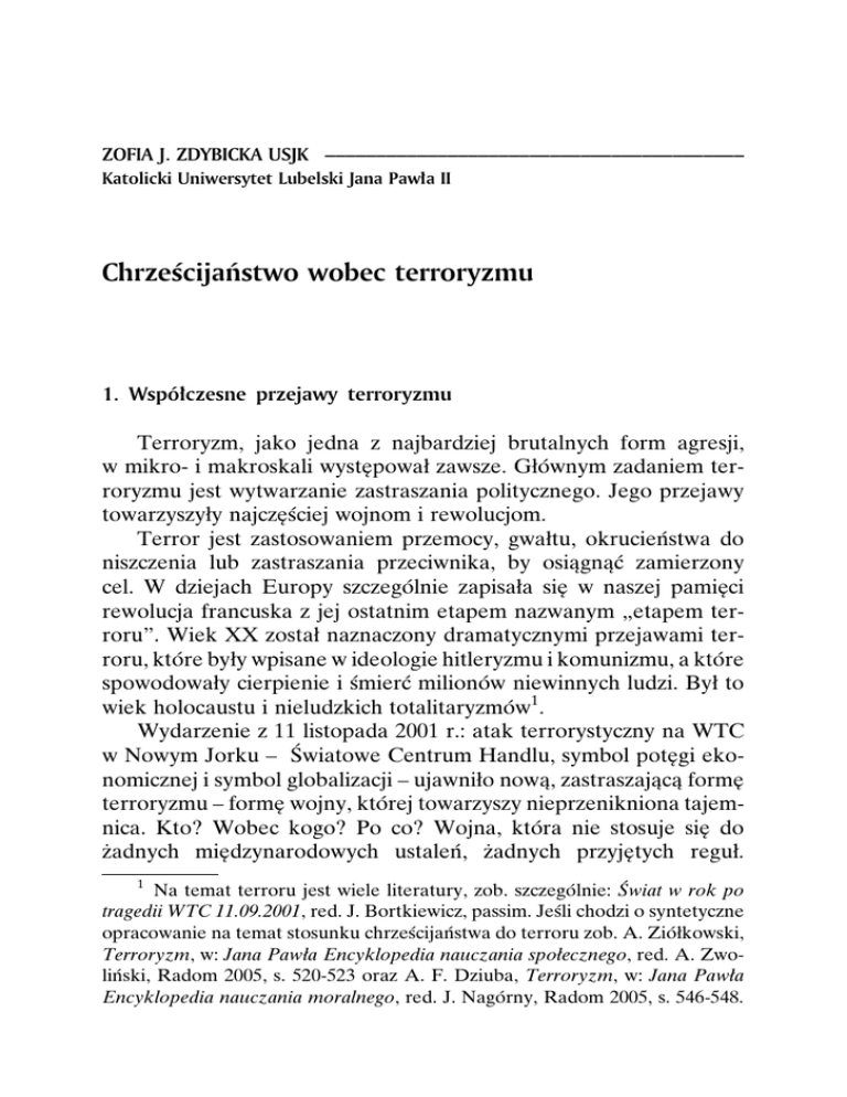 ZOFIA J. ZDYBICKA USJK Katolicki Uniwersytet Lubelski Jana Paw³a II Chrzecijañstwo wobec terroryzmu 1. Wspó³czesne przejawy terroryzmu Terroryzm, jako jedna z najbardziej brutalnych form agresji, w mikro- i makroskali wysteÎpowaø zawsze. GøoÂwnym zadaniem terroryzmu jest wytwarzanie zastraszania politycznego. Jego przejawy towarzyszyøy najczeÎsÂciej wojnom i rewolucjom. Terror jest zastosowaniem przemocy, gwaøtu, okrucienÂstwa do niszczenia lub zastraszania przeciwnika, by osiaÎgnaÎc zamierzony cel. W dziejach Europy szczegoÂlnie zapisaøa sieÎ w naszej pamieÎci rewolucja francuska z jej ostatnim etapem nazwanym ¹etapem terroruº. Wiek XX zostaø naznaczony dramatycznymi przejawami terroru, ktoÂre byøy wpisane w ideologie hitleryzmu i komunizmu, a ktoÂre spowodowaøy cierpienie i sÂmierc milionoÂw niewinnych ludzi. Byø to wiek holocaustu i nieludzkich totalitaryzmoÂw1. Wydarzenie z 11 listopada 2001 r.: atak terrorystyczny na WTC w Nowym Jorku ± SÂwiatowe Centrum Handlu, symbol poteÎgi ekonomicznej i symbol globalizacji ± ujawniøo nowaÎ, zastraszajaÎcaÎ formeÎ terroryzmu ± formeÎ wojny, ktoÂrej towarzyszy nieprzenikniona tajemnica. Kto? Wobec kogo? Po co? Wojna, ktoÂra nie stosuje sieÎ do zÇadnych mieÎdzynarodowych ustalenÂ, zÇadnych przyjeÎtych reguø. Na temat terroru jest wiele literatury, zob. szczegoÂlnie: SÂwiat w rok po tragedii WTC 11.09.2001, red. J. Bortkiewicz, passim. JesÂli chodzi o syntetyczne opracowanie na temat stosunku chrzesÂcijanÂstwa do terroru zob. A. ZioÂøkowski, Terroryzm, w: Jana Pawøa Encyklopedia nauczania spoøecznego, red. A. ZwolinÂski, Radom 2005, s. 520-523 oraz A. F. Dziuba, Terroryzm, w: Jana Pawøa Encyklopedia nauczania moralnego, red. J. NagoÂrny, Radom 2005, s. 546-548. 1 106 Zofia J. Zdybicka USJK A jednak jest to wojna zorganizowana. Wiemy, zÇe istniejaÎ organizacje terrorystyczne, zÇe w tajemniczych warunkach ginaÎ ludzie. WspoÂøczesÂni terrorysÂci, posøugujaÎc sieÎ najnowszymi sÂrodkami technicznymi, dysponujaÎ wielkim kapitaøem zagrozÇenia. Opracowuje sieÎ szeroko zakrojone strategie, ktoÂre dotykajaÎ ludzi niewinnych ± przypadkowych ofiar akcji terrorystycznych. Sprawcy najczeÎsÂciej nie saÎ ujawniani, nawet nie zdradzajaÎ zÇaÎdanÂ. W tych nowych formach wspoÂøczesnego terroryzmu chodzi o spowodowanie bezøadu spoøecznego, wytworzenie w zÇyciu spoøecznym atmosfery ogoÂlnego zagrozÇenia i wyøaniania sieÎ procesoÂw destrukcyjnych2. MuszaÎ istniec przyczyny tego zjawiska. JednaÎ z nich saÎ asymetrie ekonomiczne. Terroryzm jest manifestacjaÎ frustracji3. 2. Chrzecijañstwo potêpia terroryzm ChrzesÂcijanÂstwo jest religiaÎ prawdy, sprawiedliwosÂci, miøosÂci miøosiernej, pokoju i ze swej natury sprzeciwia sieÎ wszelkim formom przemocy. BoÂg jest miøosÂciaÎ. Z miøosÂci i dla miøosÂci stworzyø czøowieka. Od Boga pochodzi zÇycie ludzkie i On jest jedynym jego Panem. StaÎd zakaz: ¹Nie zabijajº. PowinnosÂciaÎ kazÇdej osoby ludzkiej jest ochrona swego zÇycia, obrona zÇycia ludzkiego jest takzÇe powinnosÂciaÎ wøadz publicznych. Wszelka agresja, przemoc, tortury i zabijanie saÎ sprzeczne z moralnosÂciaÎ chrzesÂcijanÂskaÎ. ChrzesÂcijanÂskie prawo miøowania czøowieka wyklucza walkeÎ tego typu. Terroryzm jest wielkim zøem moralnym. Stanowisko KosÂcioøa Katolickiego jest jasne: ¹Terroryzm, ktoÂry grozi, rani i zabija wszystkich bez roÂzÇnicy, jest w gøeÎbokiej sprzecznosÂci ze sprawiedliwosÂciaÎ i miøosÂciaÎ. Stosowanie tortur, polegajaÎce na przemocy fizycznej lub moralnej w celu uzyskania zeznanÂ, ukazania winnych, zastraszenia przeciwnikoÂw, zaspokojenia nienawisÂci jest sprzeczne z poszanowaniem osoby i godnosÂci ludzkiejº4. 2 3 4 Jan Paweø II, SÂwiatowy Dzien Pokoju, 2002, s. 4. SÂwiat w rok po tragedii WTC 11.09.2001, s. 21. Katechizm KosÂcioøa Katolickiego, Poznan 1994, s. 2297. Chrzecijañstwo wobec terroryzmu Dzieje KosÂcioøa pokazujaÎ pewne dewiacje powodowane najczeÎsÂciej sytuacjaÎ spoøeczno-politycznaÎ, w jakiej KosÂcioÂø sieÎ znajdowaø. W IV wieku chrzesÂcijanÂstwo staøo sieÎ w Cesarstwie Rzymskim religiaÎ panujaÎcaÎ. Opieka cesarzy mogøa nieraz isÂc zbyt daleko i posuwac sieÎ do dziaøan niezgodnych z duchem religii Chrystusowej. Od Karola Wielkiego (814 r.) koncepcja spoøecznosÂci chrzesÂcijanÂskiej uznawaøa porzaÎdek kosÂcielno-panÂstwowy, w ktoÂrym przesteÎpstwo religijne, np. herezja, byøo traktowane jako przesteÎpstwo panÂstwowe, na ktoÂre reagowaøa wøadza panÂstwowa (Inkwizycja). Reformacja i wojny religijne (XVI-XVII w.) mieÎdzy protestantami, uznajaÎcymi zasadeÎ ¹cuius regio eius religioº, i katolikami byøy powodowane utozÇsamieniem wøadzy panÂstwowej i religijnej. Polska ma pieÎknaÎ tradycjeÎ tolerancyjnaÎ ± sÂwiadczaÎ o tym m.in. sejm konwokacyjny (1573), Konstytucja 3 Maja i nasteÎpne, a przede wszystkim søowa kroÂla Zygmunta II Augusta: ¹Nie jestem kroÂlem sumien ludzkichº5. KosÂcioÂø nie ukrywa prawdy (zwykle wyolbrzymianej) na temat swoich bøeÎdoÂw, zwøaszcza w kwestii Inkwizycji: ¹W czasach minionych te okrutne praktyki (terrorystyczne) byøy powszechnie stosowane przez legalne rzaÎdy w celu utrzymania prawa i porzaÎdku, czeÎsto bez sprzeciwu ze strony pasterzy KosÂcioøa, ktoÂrzy w swoim saÎdownictwie przyjeÎli przepisy prawa rzymskiego dotyczaÎce tortur. Mimo tych godnych pozÇaøowania aktoÂw, KosÂcioÂø zawsze pouczaø o obowiaÎzku øagodnosÂci i miøosierdzia; zabraniaø osobom duchownym przelewania krwi. W ostatnich czasach staøo sieÎ oczywiste, zÇe te okrutne praktyki nie byøy ani konieczne dla porzaÎdku publicznego, ani zgodne ze søusznymi prawami osoby ludzkiej. Przeciwnie ± praktyki te prowadzaÎ do jeszcze wieÎkszych ponizÇenÂ. Powinno sieÎ dziaøac w celu ich zniesienia. Trzeba modlic sieÎ za ofiary i za katoÂwº6. Zasada chrzesÂcijanÂska to zasada tole