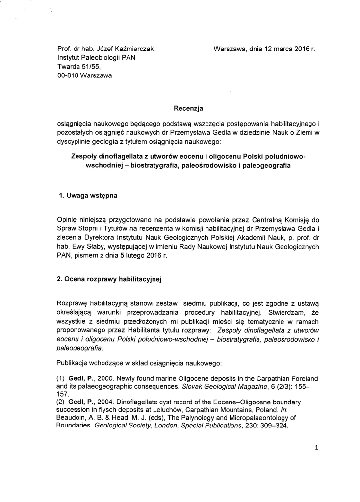 \ Prof. dr hab. Józef KaŸmierczak Instytut Paleobiologii PAN Twarda 51/55, 00-818 Warszawa Warszawa, dnia 12 marca 2016 r. Recenzja osi¹gniêcia naukowego bêd¹cego podstaw¹ wszczêcia postêpowania habilitacyjnego i pozosta³ych osi¹gniêæ naukowych dr Przemys³awa Gedla w dziedzinie Nauk o Ziemi w dyscyplinie geologia z tytu³em osi¹gniêcia naukowego: Zespo³y dinoflagellata z utworów eocenu i oligocenu Polski po³udniowowschodniej - biostratygrafia, paleoœrodowisko i paleogeografia 1. Uwaga wstêpna Opiniê niniejsz¹ przygotowano na podstawie powo³ania przez Centraln¹ Komisjê do Spraw Stopni i Tytu³ów na recenzenta w komisji habilitacyjnej dr Przemys³awa Gedla i zlecenia Dyrektora Instytutu Nauk Geologicznych Polskiej Akademii Nauk, p. prof. dr hab. Ewy S³aby, wystêpuj¹cej w imieniu Rady Naukowej Instytutu Nauk Geologicznych PAN, pismem z dnia 5 lutego 2016 r. 2. Ocena rozprawy habilitacyjnej Rozprawê habilitacyjn¹ stanowi zestaw siedmiu publikacji, co jest zgodne z ustaw¹ okreœlaj¹c¹ warunki przeprowadzania procedury habilitacyjnej. Stwierdzam, ¿e wszystkie z siedmiu przed³o¿onych mi publikacji mieœci siê tematycznie w ramach proponowanego przez Habilitanta tytu³u rozprawy: Zespo³y dinoflagellata z utworów eocenu i oligocenu Polski po³udniowo-wschodniej - biostratygrafia, paleoœrodowiskoi paleogeografia. Publikacje wchodz¹ce w sk³ad osi¹gniêcia naukowego: (1) Gedl, P., 2000. Newly found marine Oligocene deposits in the Carpathian Foreland and its palaeogeographic consequences. Slovak Geological Magazine, 6 (2/3): 155157. (2) Gedl, P., 2004. Dinoflagellate cyst record of the Eocene-Oligocene boundary succession in flysch deposits at Leluchów, Carpathian Mountains, Poland. In: Beaudoin, A. B. & Head, M. J. (eds), The Palynology and Micropalaeontology of Boundaries. Geological Society, London, Special Publications, 230: 309-324. 1 (3) Gedl, P., 2005. Late Eocene-early Oligocene organic-walled dinoflagellate cysts from Folusz, Magura Nappe, Polish Carpathians. Acta Palaeobotanica, 45: 27-83. (4) Gedl P., 2012. Reworked Eocene-Oligocene dinoflagellate cysts in the Miocene of the Carpathian Foredeep Basin: implications for Paleogene palaeogeography in SE Poland.Geological Quarterly, 56 (4): 853-868. [IF = 0.761] (5) Gedl P., 2013. Eocene dinoflagellate cysts from the Popiele beds at Koniusza (Skole Nappe, Flysch Carpathians, Poland): taxonomy, biostratigraphy, and palaeoenvironmental reconstruction of a marginal marine basin. Studia Geologica Polonica, 136: 1-197. (6) Gedl, P., 2014. Eocene dinoflagellate cysts from the So³okija Graben (Roztocze, SE Poland): biostratigraphy and palaeoenvironment. GeologicalQuarterly,58 (4): 707728. [IF =0.865] (7) Gedl, P., 2015. Dinoflagellate cysts from the Palaeogene of the £ukowa-4 borehole (Carpathian Foredeep, SE Poland): biostratigraphy and palaeoenvironment. Annales Societatis Geologorum Poloniae, 85 (1): 285-308. [IF za 2014 = 0.727] Z analizy w/w prac i przebiegu kariery zawodowej Habilitatanta wynika, ¿e dr Przemys³aw Gedl jest mikropaleontologiem, biostratygrafem i geologiem regionalnym specjalizuj¹cym siê od wielu lat w opracowaniach biostratygraficznych, rekonstrukcjach paleoœrodowiskowych i paleogeografii utworów jury, kredy i kenozoiku, g³ównie z obszaru karpackiego. Ca³a dotychczasowa dzia³alnoœæbadawcza dr Gedla pozwala uznaægo za wysokiej klasy eksperta, z d³ug¹ praktyk¹ badawcz¹ opart¹ na bardzo szczegó³owej znajomoœci cyst kopalnych i dzisiejszych wiciowych ¿ó³to-brunatnych mikroglonów (Dinoflagellata), które, od niedawna, w nowym podziale organizmów eukariotycznych, klasyfikowane s¹ jako organizmy nale¿¹ce do supergrupy Chromalveolata. Cysty Dinoflagellata, zwane potocznie dinocystami, pojawiaj¹ siê w zapisie kopalnym od pocz¹tku triasu, pocz¹tkowo niezbyt licznie, jednak ju¿ w osadach póŸniejszego mezozoiku, a szczególnie kenozoiku s¹ na tyle czêstymi, niekiedy wrêcz masowymi mikroskamienia³oœciami, i¿ znajduj¹ szerokie zastosowanie zarówno w badaniach stratygraficznych, jak i paleoekologicznych, przede wszystkim jako wskaŸniki paleobatymetryczne i paleoklimatyczne. Dr Gedl nale¿y niew¹tpliwie do w¹skiego grona europejskich specjalistów, stosuj¹cych z powodzeniem dinocysty jako podstawowe narzêdzie badañ stratygraficznych. Na podkreœlenie zas³uguje wielka pracoch³onnoœæstosowanej przez niego mikropaleontologicznej techniki badawczej, bardzo przydatnej i zas³u¿onej, szczególnie w poszukiwaniach ropy i gazu. Za osiow¹ czêœæ zestawu publikacji przed³o¿onych jako podstawa wniosku habilitacyjnego uwa¿am pozycjê (5) opublikowan¹ w Studia Geologica Polonica (vol. 136, str. 1-197, 2013), stanowi¹c¹ obszerne studium zespo³ów eoceñskich dinocyst z warstw popielawskich. Jest to, moim zdaniem, na tyle dzie³o fundamentalne, ¿e samo, na tle pozosta³ych prac, mog³oby zostaæprzedstawione jako rozprawa habilitacyjna. ~ Ca³oœæ osi¹gniêcia przed³o¿onego mi do zaopiniowania oceniam przede wszystkim jako próbê uporz¹dkowania dotychczasowej dinocystowej stratygrafii paleogenu Polski na tle rekonstrukcji paleoœrodowiskowej utworów tego wieku. Ta wiod¹ca teza rozprawy zosta³a przez dr Gedla udokumentowana i rozwiniêta z du¿ym sukcesem. W trakcie prowadzonych badañ, szczegó³owej analizie poddana zosta³a, w oparciu o 2 zapis dinocystowy, sukcesja osadów obejmuj¹ca interesuj¹ce z planetarnego punktu widzenia warstwy graniczne eocenu i oligocenu. Co wa¿ne, wyniki tych badañ zosta³y przedstawione miêdzynarodowemu gremium badaczy specjalizuj¹cych siê w wyznaczaniu wa¿niejszych granic stratygraficznych i og³oszone drukiem w specjalnej publikacji Londyñskiego Towarzystwa Geologicznego "The Palynology and Micropaleontology of Boundaries" w 2004 r. Szczegó³owe opracowanie paleogeñskich zespo³ów dinocystowych i palinofacji umo¿liwi³o dr Gedlowi podjêcie trudnego zadania dotycz¹cego rekonstrukcji paleogeog