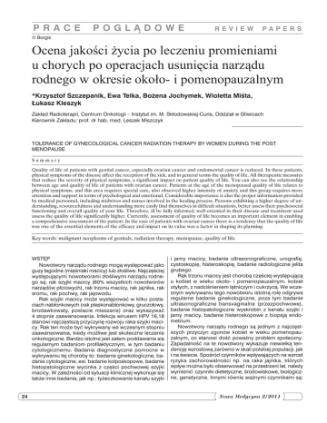 PRACE POGLĄDOWE REVIEW PAPERs © Borgis Ocena jakości życia po leczeniu promieniami u chorych po operacjach usunięcia narządu rodnego w okresie około- i pomenopauzalnym *Krzysztof Szczepanik, Ewa Telka, Bożena Jochymek, Wioletta Miśta, Łukasz Kleszyk Zakład Radioterapii, Centrum Onkologii – Instytut im. M. Skłodowskiej-Curie, oddział w Gliwicach Kierownik Zakładu: prof. dr hab. med. Leszek Miszczyk Tolerance of gynecological cancer radiation therapy by women during the post menopause Summary Quality of life of patients with genital cancer, especially ovarian cancer and endometrial cancer is reduced. In these patients, physical symptoms of the disease affect the reception of the sick, and in general terms the quality of life. All therapeutic measures that reduce the severity of physical symptoms, a significant impact on patient quality of life. You can also see the relationship between age and quality of life of patients with ovarian cancer. Patients at the age of the menopausal quality of life relates to physical symptoms, and this area requires special care, also observed higher intensity of anxiety and this group requires more attention and support in terms of psychological and emotional. Considerable importance is also the proper information provided by medical personnel, including midwives and nurses involved in the healing process. Persons exhibiting a higher degree of understanding, resourcefulness and understanding more easily find themselves in difficult situations, better assess their psychosocial functioning and overall quality of your life. Therefore, ill be fully informed, well-oriented in their disease and treatment used assess the quality of life significantly higher. Currently, assessment of quality of life becomes an important element in enabling a comprehensive assessment of the patient. In the case of patients with ovarian cancer there is a tendency that the quality of life was one of the essential elements of the efficacy and impact on its value was a factor in shaping its planning. Key words: malignant neoplasms of genitals, radiation therapy, menopause, quality of life Wstęp Nowotwory narządu rodnego mogą występować jako guzy łagodne (mięśniaki macicy) lub złośliwe. Najczęściej występującymi nowotworami złośliwymi narządu rodnego są: rak szyjki macicy (60% wszystkich nowotworów narządów płciowych), rak trzonu macicy, rak jajnika, rak sromu, rak pochwy, rak jajowodu. Rak szyjki macicy może występować w kilku postaciach nabłonkowych (rak płaskonabłonkowy, gruczołowy, brodawkowaty, postacie mieszane) oraz wykazywać 4 stopnie zaawansowania. Infekcja wirusem HPV 16,18 stanowi najczęstszą przyczynę rozwoju raka szyjki macicy. Rak ten może być wykrywany we wczesnym stopniu zaawansowania, kiedy możliwe jest skuteczne leczenie onkologiczne. Bardzo istotne jest zatem poddawanie się regularnym badaniom profilaktycznym, w tym badaniu cytologicznemu. Badania diagnostyczne pomocne w wykrywaniu tej choroby to: badanie ginekologiczne, badanie cytologiczne, ew. badanie kolposkopowe, badanie histopatologiczne wycinka z części pochwowej szyjki macicy. W zależności od sytuacji klinicznej wykonuje się także inne badania, jak np.: łyżeczkowanie kanału szyjki 24 i jamy macicy, badanie ultrasonograficzne, urografię, cystoskopię, histeroskopię, badanie radiologiczne jelita grubego. Rak trzonu macicy jest chorobą częściej występującą u kobiet w wieku około- i pomenopauzalnym, kobiet otyłych, z nadciśnieniem tętniczym i cukrzycą. We wczesnym wykrywaniu tego nowotworu istotną rolę odgrywa regularne badanie ginekologiczne, poza tym badanie ultrasonograficzne transvaginalne (przezpochwowe), badanie histopatologiczne wyskrobin z kanału szyjki i jamy macicy, badanie histeroskopowe z biopsją endometrium. Nowotwory narządu rodnego są jednym z najczęstszych przyczyn zgonów kobiet w wieku pomenopauzalnym, co stanowi dość poważny problem społeczny. Zapadalność na te nowotwory wykazuje niewielką tendencję wzrostową zarówno w skali polskiej populacji, jak i na świecie. Spośród czynników wpływających na wzrost ryzyka zachorowalności np. na raka jajnika, których wpływ można było obserwować na przestrzeni lat, należy wymienić: czynniki dietetyczne, środowiskowe, biologiczne, genetyczne. Innymi równie ważnymi czynnikami są: Nowa Medycyna 2/2011 Ocena jakości życia po leczeniu promieniami u chorych po operacjach usunięcia narządu rodnego w okresie około- i pomenopauzalnym ilość donoszonych ciąż, a także doustna antykoncepcja. Zachorowalność na raka jajnika w Polsce wynosi 11 na 100 000 kobiet. Szacuje się, iż około 5 do 10% ogólnej liczby nowotworów jajnika związanych jest z występowaniem mutacji w obrębie genów BRCA1/BRCA2. Mutacje w genach BRCA1 i BRCA2 przyczyniają się nie tylko do powstawania nowotworów piersi i jajnika, ale także innych nowotworów złośliwych. Możliwości, jakie dają stosowane w Poradniach Genetycznych testy genetyczne sprawiają, iż pacjentki obciążone mutacjami promującymi rozwój nowotworu złośliwego mogą być skutecznie diagnozowane i monitorowane. Wyodrębnienie pacjentek z grupy podwyższonego ryzyka, objęcie ich specjalistyczną opieką lekarską oraz przeprowadzenie diagnostyki w kierunku nosicielstwa mutacji genetycznych promujących proces onkogenezy, staje się skutecznym narzędziem w zapobieganiu i wczesnym wykrywaniu nowotworów, które rocznie rozpoznaje się u ponad 3000 kobiet w Polsce (3, 7, 13, 15, 17). Według danych statystycznych Narodowego Instytutu Raka w Bethesda (USA) najczęstszym nowotworem złośliwym wśród kobiet jest rak sutka. Ryzyko jego wystąpienia w ciągu życia wynosi ponad 10% (1, 3, 9). Z kolei, rak jajnika występuje stosunkowo rzadziej (ok. 1,8%), jednak śmiertelność kobiet z jego powodu jest relatywnie wysoka. Pomimo postępu, jaki dokonał się w dziedzinie diagnostyki obrazowej i laboratoryjnej