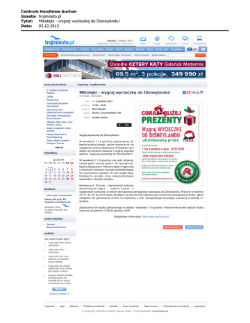 Centrum Handlowe Auchan Gazeta: trojmiasto.pl Tytu³: Miko³ajki wygraj wycieczkê do Disneylandu! Data: 03.12.2013 wtorek, 3 grudnia 2013 imieniny: Franciszka, Ksawerego Katalog firm Wiadomości Kultura Jarmark Bożonarodzeniowy POLECAMY pod patronatem Rozrywka Sport SpaceFest! Dom Biznes Glenn Miller Orchestra kino Nauka mapa Moto Adam Nowak ogłoszenia Życie i styl forum komunikacja Turystyka SZUKAJ Mela Koteluk Imprezy i wydarzenia 2. Urodziny Centrum Designu Mikołajki - wygraj wycieczkę do Disneylandu! Lafidki mikołajki, warsztaty Pokahontaz data: 7 - 8 grudnia 2013 Franciszek Duszeńko monumenty godzina: 12:00 - 18:00 Horyzonty kina Dziewczynka w trampkach Dub Mass: Pandadread Sound System miejsce: Port Rumia adres: Rumia, Grunwaldzka 108 bilety: w s tęp wolny Madball, Deez Nuts, Your Demise, Nasty idę Jestem malarzem myśli i przeżyć Maciej Maleńczuk & Psychodancing Wygraj wycieczkę do Disneylandu! Pomoc Niesie Uśmiech Grzegorz Turnau W weekend 7 i 8 grudnia zapraszamy do kącika plastycznego, gdzie rozpocznie się wyjątkowy konkurs plastyczny. Przedstaw nam swoje wymarzone wakacje i wygraj nagrodę główną - bajkową wycieczkę do Disneyland'u! więcej kalendarz grudzień > P n W t Sr C z P t So Nd 1 2 3 4 5 6 9 10 11 12 13 16 17 18 19 20 23 24 25 26 27 30 31 7 8 14 15 21 22 28 29 konkurs informacje o konkursach Mamy dla was 18 nagród w konkursach. Szukajcie mewy na stronie imprezy lub obiektu. W weekend 7 i 8 grudnia nie lada atrakcja czeka gości naszej galerii. W specjalnym kąciku plastycznym maluchy będą mogły wraz z rodzicami wykonać rysunek przedstawiający ich wymarzone wakacje. W ruch pójdą farby, flamastry, kredki oraz niewyczerpana wyobraźnia młodych artystów. Najlepszych 20 prac - stworzonych podczas dwudniowych zaję ć - weźm i e u d z i ał w wyjątkowym konkursie, w którym do wygrania jest bajkowa wycieczka do Disneyland'u. Prace te w terminie od 11 do 20 grudnia będą dostępne na stronie internetowej www.portrumia.pl/wygrajwycieczke, gdzie odbędzie się głosowanie online na najlepszą z nich. Szczę śliwego zwycięzcę poznamy w sobotę 21 grudnia. Zapraszamy do kącika plastycznego w sobotę i niedzielę 7 i 8 grudnia. Prace konkursowe będzie można wykonać od godziny 12.00 do godziny 18.00. Dodatkowe informacje: http://www.portrumia.pl nowe imprezy Jarmark Bożonarodzeniowy DODAJ ZDJĘCIE DODAJ OPINIĘ ankieta Jak często myjesz zęby? j myję zęby tylko przed k l m n zaśnięciem j myję zęby rano i k l m n wieczorem j myję zęby trzy razy k l m n dziennie, po każdym dużym posiłku j myję zęby po każdym k l m n posiłku ale tylko wtedy, gdy jestem w domu j myję po każdym posiłku k l m n bo praktycznie nie rozstaję się ze swoją szczoteczką do zębów głosuj ZOBACZ WYNIKI > O portalu Logo Reklama Polityka prywatności Kontakt Praca w portalu Mapa serwisu Trojmiasto.pl na komórkę (c) Copyright 1998-2013 Gdańsk, Gdynia, Sopot - Portal Regionalny trojmiasto.pl Logowanie
