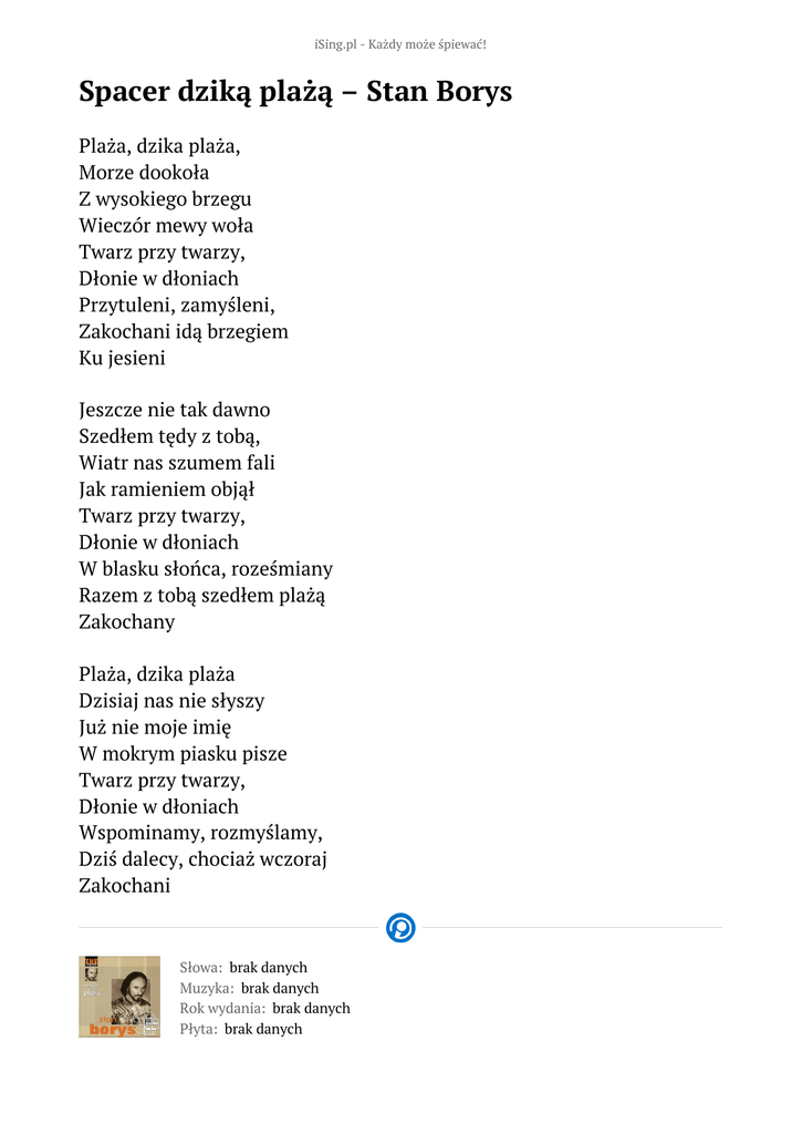 iSing.pl - Każdy może śpiewać! Spacer dziką plażą – Stan Borys Plaża, dzika plaża, Morze dookoła Z wysokiego brzegu Wieczór mewy woła Twarz przy twarzy, Dłonie w dłoniach Przytuleni, zamyśleni, Zakochani idą brzegiem Ku jesieni Jeszcze nie tak dawno Szedłem tędy z tobą, Wiatr nas szumem fali Jak ramieniem objął Twarz przy twarzy, Dłonie w dłoniach W blasku słońca, roześmiany Razem z tobą szedłem plażą Zakochany Plaża, dzika plaża Dzisiaj nas nie słyszy Już nie moje imię W mokrym piasku pisze Twarz przy twarzy, Dłonie w dłoniach Wspominamy, rozmyślamy, Dziś dalecy, chociaż wczoraj Zakochani Słowa: brak danych Muzyka: brak danych Rok wydania: brak danych Płyta: brak danych