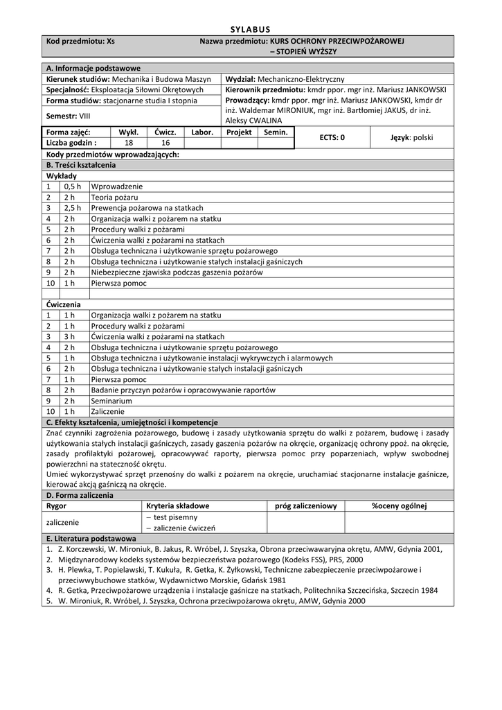SYL ABUS Kod przedmiotu: Xs Nazwa przedmiotu: KURS OCHRONY PRZECIWPOŻAROWEJ – STOPIEŃ WYŻSZY A. Informacje podstawowe Kieru ek studiów: Mechanika i Budowa Maszyn Specjal ość: Eksploata ja Siłow i Okrętowy h For a studiów: stacjonarne studia I stopnia Semestr: VIII Wydział: Mechaniczno-Elektryczny Kierownik przedmiotu: k dr ppor. gr i ż. Mariusz JANKOWSKI Prowadzący: k dr ppor. gr i ż. Mariusz JANKOWSKI, kmdr dr i ż. Walde ar MIRONIUK, gr i ż. dartło iej JAKUS, dr i ż. Aleksy CWALINA Projekt Semin. ECTS: 0 Język: polski For a zajęć: Wykł. Dwicz. Labor. Liczba godzin : 18 16 Kody przed iotów wprowadzających: B. Treści kształce ia Wykłady 1 0,5 h Wprowadzenie 2 2h Teoria pożaru 3 2,5 h Prewencja pożarowa a statka h 4 2h Orga iza ja walki z pożare a statku 5 2h Pro edury walki z pożara i 6 2h Ćwi ze ia walki z pożara i a statka h 7 2h O sługa te h i z a i użytkowa ie sprzętu pożarowego 8 2h O sługa te h i z a i użytkowa ie stały h i stala ji gaś i zy h 9 2h Nie ezpie z e zjawiska pod zas gasze ia pożarów 10 1 h Pierwsza pomoc Dwicze ia 1 1h Orga iza ja walki z pożare a statku 2 1h Pro edury walki z pożara i 3 3h Ćwi ze ia walki z pożara i a statka h 4 2h O sługa te h i z a i użytkowa ie sprzętu pożarowego 5 1h O sługa te h i z a i użytkowa ie i stala ji wykryw zy h i alar owy h 6 2h O sługa te h i z a i użytkowa ie stały h i stala ji gaś i zy h 7 1h Pierwsza pomoc 8 2h dada ie przy zy pożarów i opra owywa ie raportów 9 2h Seminarium 10 1 h Zaliczenie C. Efekty kształce ia, u iejęt ości i ko pete cje ) a zy iki zagroże ia pożarowego, udowę i zasady użytkowa ia sprzętu do walki z pożare , udowę i zasady użytkowa ia stały h i stala ji gaś i zy h, zasady gasze ia pożarów a okrę ie, orga iza ję o hro y ppoż. a okrę ie, zasady profilaktyki pożarowej, opra owywa raporty, pierwsza po o przy poparze ia h, wpływ swo od ej powierz h i a state z oś okrętu. U ie wykorzystywa sprzęt prze oś y do walki z pożare a okrę ie, uru ha ia sta jo ar e i stala je gaś i ze, kierowa ak ją gaś i zą a okrę ie. D. Forma zaliczenia Rygor Kryteria składowe próg zalicze iowy %oce y ogól ej test pisemny zaliczenie zali ze ie wi ze E. Literatura podstawowa 1. ). Kor zewski, W. Miro iuk, d. Jakus, R. Wró el, J. Szyszka, O ro a prze iwawaryj a okrętu, AMW, Gdy ia , 2. Między arodowy kodeks syste ów ezpie ze stwa pożarowego Kodeks FSS , PRS, 3. H. Plewka, T. Popielawski, T. Kukuła, R. Getka, K. Żyłkowski, Te h i z e za ezpie ze ie prze iwpożarowe i prze iwwy u howe statków, Wydaw i two Morskie, Gda sk 4. R. Getka, Prze iwpożarowe urządze ia i i stala je gaś i ze a statka h, Polite h ika Sz ze i ska, Sz ze i 4 5. W. Mironiuk, R. Wró el, J. Szyszka, O hro a prze iwpożarowa okrętu, AMW, Gdy ia