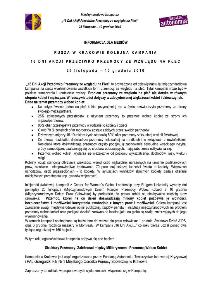 Międzynarodowa kampania „16 Dni Akcji Przeciwko Przemocy ze względu na Płeć” 25 listopada – 10 grudnia 2010 INFORMACJA DLA MEDIÓW RUSZA W KRAKOWIE KOLEJNA KAMPANIA 16 DNI AKCJI PRZECIWKO PRZEMOCY ZE WZGLĘDU NA PŁEĆ 25 listopada – 10 grudnia 2010 „16 Dni Akcji Przeciwko Przemocy ze względu na Płeć” to prowadzona od dziewiętnastu lat międzynarodowa kampania na rzecz wyeliminowania wszelkich form przemocy ze względu na płeć. Tytuł kampanii może być w polskim tłumaczeniu i kontekście mylący. Problem przemocy ze względu na płeć nie dotyka w równym stopniu kobiet i mężczyzn. W rzeczywistości dotyczy w zdecydowanej większości kobiet i dziewczynek. Dane na temat przemocy wobec kobiet: Na całym świecie jedna na pięć kobiet przynajmniej raz w życiu doświadczyła przemocy ze strony swojego męża/partnera. 25% zgłoszonych przestępstw z użyciem przemocy to przemoc wobec kobiet ze strony ich mężów/partnerów. 95% ofiar przestępstwa przemocy w rodzinie to kobiety i dzieci Około 70 % żeńskich ofiar morderstw zostało zabitych przez swoich partnerów Dziewczęta między 15-19 rokiem życia stanowią 50% ofiar przemocy seksualnej w skali światowej. Co trzecia nastolatka doświadcza przemocy seksualnej na randkach i w związkach z rówieśnikami. Nastolatki które doświadczają przemocy często podejmują zachowania seksualne wysokiego ryzyka, próby samobójcze, uzależniają się od środków odurzających, mają zaburzenia odżywiania się. Przemoc wobec kobiet wydarza się niezależnie od poziomu wykształcenia, dochodów, rasy, wieku i religii. Kobiety wciąż stanowią olbrzymią większość wśród osób najbardziej narażonych na łamanie podstawowych praw, nierówne i niesprawiedliwe traktowanie. 70 proc. najuboższej ludności świata to kobiety. Większość uchodźców, osób przesiedlonych - to kobiety. W sytuacjach konfliktów zbrojnych kobiety padają ofiarami najcięższych przestępstw (np. gwałtów wojennych). Inicjatorki światowej kampanii z Center for Woman’s Global Leadership przy Rutgers University wybrały dni pomiędzy 25 listopada (Międzynarodowym Dniem Przeciw Przemocy Wobec Kobiet) a 10 grudnia (Międzynarodowym Dniem Praw Człowieka) by podkreślić, że prawa kobiet są niezbywalną częścią praw człowieka. Przemoc, której na co dzień doświadczają miliony kobiet pozbawia je wolności, bezpieczeństwa i możliwości korzystania swobodnie z innych praw i możliwości. Celem kampanii jest zwrócenie uwagi międzynarodowej opinii publicznej, rządów państw i instytucji międzynarodowych na problem przemocy wobec kobiet oraz podjęcie działań zarówno na lokalną jak i na globalną skalę, zmierzających do jego wyeliminowania. W ramach kampanii obchodzone są także inne dni ważne dla praw człowieka: 1 grudnia, Światowy Dzień AIDS, oraz 6 grudnia, rocznica masakry w Montrealu. W kampanii „16 Dni Akcji...” co roku bierze udział ponad dwa tysiące organizacji w 160 krajach. W tym roku ogólnoświatowa kampania odbywa się pod hasłem: Struktury Przemocy: Zależności między Militaryzmem i Przemocą Wobec Kobiet Kampania w Krakowie jest współorganizowana przez: Fundację Autonomia, Towarzystwo Interwencji Kryzysowej i PAL Grzegórzki Filii Nr 1 Miejskiego Ośrodka Pomocy Społecznej w Krakowie . Zapraszamy do udziału w proponowanych wydarzeniach i włączenia się w Kampanię. Międzynarodowa kampania „16 Dni Akcji Przeciwko Przemocy ze względu na Płeć” 25 listopada – 10 grudnia 2010 Kalendarz wydarzeń, które odbędą się w Krakowie w ramach międzynarodowej kampanii „16 Dni Akcji Przeciwko Przemocy ze względu na Płeć”. Udział we wszystkich wydarzeniach jest bezpłatny! 25.11.2010 (czwartek) MIĘDZYNARODOWY DZIEŃ ELIMINACJI PRZEMOCY WOBEC KOBIET Godz. 18.00 Inauguracja Kampanii „16 Dni Akcji Przeciwko Przemocy ze względu na Płeć” Przedstawienie tegorocznego tematu przewodniego kampanii: Struktury Przemocy: Zależności między Militaryzmem i Przemocą Wobec Kobiet a także działań podejmowanych w Krakowie i innych miastach Polski – prowadzenie Agata Teutsch (Fundacja Autonomia). Miejsce: ul. Krakowska 19, I piętro (siedziba Towarzystwa Interwencji Kryzysowej i Fundacji Autonomia) Godz. 18.30 Projekcja filmu "Przerwać milczenie" (Fighting the Silence) reż. Femke van Velzen, Ilse van Velzen, Holandia 2007, 53’ Podczas siedmioletniej wojny domowej w Kongo ofiarami gwałtów padło ponad osiemdziesiąt tysięcy kobiet. Dziś, kiedy w kraju - przynajmniej teoretycznie - panuje pokój, okazuje się, że gwałt nie jest już szokującym wynaturzeniem, ale codziennością. Film portretuje ludzi, którzy walczą o zmianę społecznego nastawienia do tego zjawiska. Miejsce: ul. Krakowska 19, I piętro (siedziba Towarzystwa Interwencji Kryzysowej i Fundacji Autonomia) 29 – 30.11.2010 (poniedziałek i wtorek) 29.12. MIĘDZYNARODOWY DZIEŃ OBROŃCZYŃ PRAW CZŁOWIEKA Warsztat WenDo – samoobrona i asertywność dla kobiet dla uczestniczek projektu realizowanego przez Powiatowe Centrum Pomocy Rodzinie w Wieliczce. Grupa uczestniczek zamknięta. Prowadzenie: Monika Serkowska i Agata Teutsch (Fundacja Autonomia) WenDo to warsztat samoobrony i asertywności dla kobiet i dziewcząt. WenDo jest metodą, która łączy samoobronę fizyczną z samoobroną psychiczną. Od "zwykłej" samoobrony WenDo różni się między innymi tym, że wielkie znaczenie przywiązuje do asertywności. Na WenDo wychodzimy z założenia, że nikt nie ma prawa naruszać naszych granic (to znaczy naruszać naszego poczucia bezpieczeństwa, swobody i prawa do podejmowania własnych decyzji). WenDo jako metoda samoobrony psychicznej przekazuje wiedzę na temat skutecznych metod komunikowania się i wyrażania własnych potrzeb, emocji, zdania. Na WenDo pracujemy nad tym, jak nie dopuścić do napaści, a kiedy do niej dojdzie, jak sobie pomóc wykorzystując swoją (a także innych kobiet) wiedzę, p