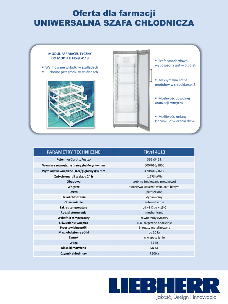 Oferta dla farmacji UNIWERSALNA SZAFA CHŁODNICZA MODUŁ FARMACEUTYCZNY DO MODELU FKvsl 4113  Wyjmowane wkładki w szufladach  Ruchome przegródki w szufladach  Szafa standardowo wyposażona jest w 5 półek  Maksymalna liczba modułów w chłodziarce: 2  Możliwośd dowolnej aranżacji wnętrza  Możliwośd zmiany kierunku otwierania drzwi PARAMETRY TECHNICZNE FKvsl 4113 Pojemnośd brutto/netto 365 /346 l. Wymiary zewnętrzne ( szer/głęb/wys) w mm 600/610/1800 Wymiary wewnętrzne (szer/głęb/wys) w mm 470/440/1612 Zużycie energii w ciągu 24 h 1,273 kWh Obudowa srebrna (malowana proszkowo) Wnętrze tworzywo sztuczne w kolorze białym Drzwi przeszklone Układ chłodzenia dynamiczny Odszranianie automatyczne Zakres temperatury od +1 C do + 15 C Rodzaj sterowania mechaniczne Wskaźnik temperatury zewnętrzny cyfrowy Oświetlenie wnętrza Przestawialne półki Max. obciążenie półki LED- załączane oddzielnie 5- ruszty metalizowane do 50 kg Zamek w wyposażeniu Waga 85 kg Klasa klimatyczna SN-ST Czynnik chłodniczy R600 a