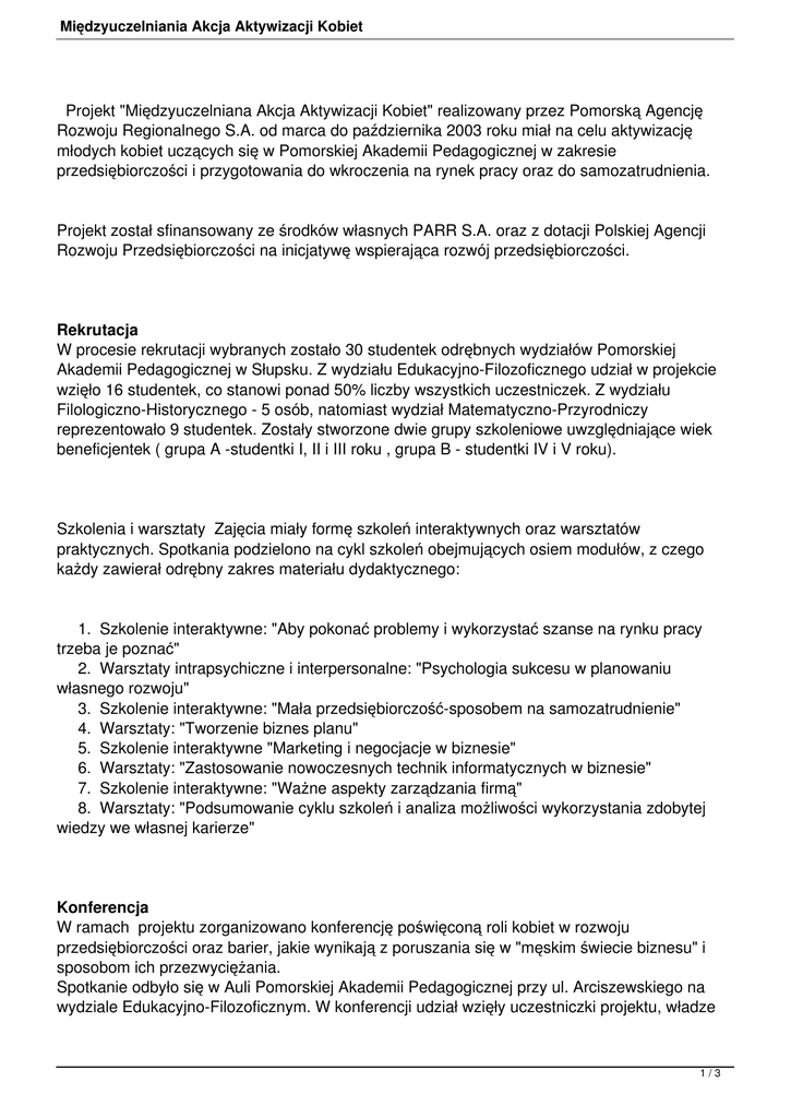 Międzyuczelniania Akcja Aktywizacji Kobiet Projekt "Międzyuczelniana Akcja Aktywizacji Kobiet" realizowany przez Pomorską Agencję Rozwoju Regionalnego S.A. od marca do października 2003 roku miał na celu aktywizację młodych kobiet uczących się w Pomorskiej Akademii Pedagogicznej w zakresie przedsiębiorczości i przygotowania do wkroczenia na rynek pracy oraz do samozatrudnienia. Projekt został sfinansowany ze środków własnych PARR S.A. oraz z dotacji Polskiej Agencji Rozwoju Przedsiębiorczości na inicjatywę wspierająca rozwój przedsiębiorczości. Rekrutacja W procesie rekrutacji wybranych zostało 30 studentek odrębnych wydziałów Pomorskiej Akademii Pedagogicznej w Słupsku. Z wydziału Edukacyjno-Filozoficznego udział w projekcie wzięło 16 studentek, co stanowi ponad 50% liczby wszystkich uczestniczek. Z wydziału Filologiczno-Historycznego - 5 osób, natomiast wydział Matematyczno-Przyrodniczy reprezentowało 9 studentek. Zostały stworzone dwie grupy szkoleniowe uwzględniające wiek beneficjentek ( grupa A -studentki I, II i III roku , grupa B - studentki IV i V roku). Szkolenia i warsztaty Zajęcia miały formę szkoleń interaktywnych oraz warsztatów praktycznych. Spotkania podzielono na cykl szkoleń obejmujących osiem modułów, z czego każdy zawierał odrębny zakres materiału dydaktycznego: 1. Szkolenie interaktywne: "Aby pokonać problemy i wykorzystać szanse na rynku pracy trzeba je poznać" 2. Warsztaty intrapsychiczne i interpersonalne: "Psychologia sukcesu w planowaniu własnego rozwoju" 3. Szkolenie interaktywne: "Mała przedsiębiorczość-sposobem na samozatrudnienie" 4. Warsztaty: "Tworzenie biznes planu" 5. Szkolenie interaktywne "Marketing i negocjacje w biznesie" 6. Warsztaty: "Zastosowanie nowoczesnych technik informatycznych w biznesie" 7. Szkolenie interaktywne: "Ważne aspekty zarządzania firmą" 8. Warsztaty: "Podsumowanie cyklu szkoleń i analiza możliwości wykorzystania zdobytej wiedzy we własnej karierze" Konferencja W ramach projektu zorganizowano konferencję poświęconą roli kobiet w rozwoju przedsiębiorczości oraz barier, jakie wynikają z poruszania się w "męskim świecie biznesu" i sposobom ich przezwyciężania. Spotkanie odbyło się w Auli Pomorskiej Akademii Pedagogicznej przy ul. Arciszewskiego na wydziale Edukacyjno-Filozoficznym. W konferencji udział wzięły uczestniczki projektu, władze 1/3 Międzyuczelniania Akcja Aktywizacji Kobiet uczelni, przedstawiciele lokalnych mediów (Gazeta "Głos Słupski", "Dziennik Bałtycki", Radio "Koszalin") oraz pozostali studenci zainteresowani tematem konferencji. Program spotkania obejmował następujące tematy: - Polityka Unii Europejskiej wobec kobiet: - Co utrudnia przedsiębiorczym kobietom prowadzenie własnej działalności gospodarczej? - Jak walczyć z trudnościami kobiet w biznesie? Konferencję przeprowadziły przedstawicielki lokalnych organizacji oraz właścicielki słupskich przedsiębiorstw: - Pani Ewa Matuska - Prezes Pomorskiej Agencji Rozwoju Regionalnego - Pani Urszula Papoń - Prezes SCWOP (Słupskie Centrum Wspierania Organizacji Pozarządowych) - Pani Bożena Hołowienko - właścicielka "Restauracji Zamkowej" w Słupsku - Pani Elżbieta Koszycka-Dobrzyń - właścicielka "Dokumenta" S.A. Po zakończeniu cyklu szkoleniowego wszystkie uczestniczki projektu zostały zaproszone na uroczystą kolację mającą na celu omówienie zrealizowanych zagadnień, podsumowanie projektu oraz wzajemną wymianę doświadczeń z przebytych warsztatów. Staże Jednym z założeń projektu było zorganizowanie przez PARR S.A. letnich praktyk dla chętnych uczestniczek programu. Po zakończeniu szkolenia uczestniczki otrzymały certyfikaty potwierdzające udział w projekcie, co dało im możliwość odbycia nieodpłatnych praktyk w małych i średnich przedsiębiorstwach ze Słupska i okolic. Wypełniając formularz zgłoszeniowy, chęć udziału w praktykach wyraziło 11 dziewcząt. Ze względu na trwający wówczas okres wakacyjny, część z nich podjęła płatną pracę sezonową. Ostatecznie praktyki letnie odbyło 6 dziewcząt. Dwie z nich wyraziły chęć odbycia stażu w Pomorskiej Agencji Rozwoju Regionalnego S.A. Pozostałe nabierały doświadczenia w Firmie Kamir DMK w Słupsku, Słupskim Centrum Wspierania Organizacji Pozarządowych oraz w firmie konsultingowej DGKoncept. Po odbyciu praktyk, uczestniczki projektu zdały sprawozdanie z przebiegu stażu, wraz z oceną jego przydatności. Za najważniejsze elementy szkolenia, które wykorzystywały w swojej pracy 2/3 Międzyuczelniania Akcja Aktywizacji Kobiet uznały umiejętność obsługi komputera, korzystanie z internetu, obsługę programów Outlook Express, Word, Exel oraz podstawy zarządzania finansami przedsiębiorstwa. Strona internetowa i konsultacje W ramach projektu powstała podstrona internetowa na której zamieszczone zostały materiały szkoleniowe oraz zdjęcia z konferencji i kolacji organizowanej dla uczestniczek projektu. Ze strony www stażystki mogły także wysłać e-mail z zapytaniem dotyczącym konkretnych problemów z którymi spotkały się podczas odbywania praktyk. Większość porad dotyczyła obsługi komputera i poczty elektronicznej a także finansów i narzędzi wykorzystywanych w promocji produktów i usług. Podsumowanie W wyniku realizacji projektu 30 studentek uczelni pedagogicznej zostało przeszkolonych w zakresie funkcjonowania Małych i Średnich Przedsiębiorstw na rynku oraz zagadnień związanych z zarządzaniem taką firmą w wymiarze 32 godzin. Ponadto, 6 osób odbyło letnie staże, które pozwoliły na zapoznanie się z praktycznymi aspektami prowadzenia działalności gospodarczej. Przydatność udziału w projekcie w przyszłej pracy uczestniczki oceniły bardzo wysoko. Dla większości osób było to pierwsze spotkanie z pracą w firmie. 3/3