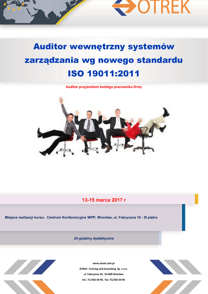 _________________________________________________________________________________ Auditor wewnętrzny systemów zarządzania wg nowego standardu ISO 19011:2011 Auditor przyjacielem każdego pracownika firmy 13-15 marca 2017 r Miejsce realizacji kursu: Centrum Konferencyjne WPP, Wrocław, ul. Fabryczna 10 - III piętro 24 godziny dydaktyczne www.otrek.com.pl OTREK Training and Consulting Sp. z o.o. _________________________________________________________________________________ ul. Fabryczna 10, 53-609 Wrocław tel.: 71/356 50 90, fax: 71/356 50 90 _________________________________________________________________________________ 1. Opis szkolenia: Szkolenie składa się z trzech części: 1. podstawowe wymagania systemów zarządzania, 2. wymagania w zakresie audytowania systemów zarządzania oraz 3. egzamin końcowy kompetencji auditora wewnętrznego systemów zarządzania. Integralną częścią szkolenia jest praktyczny trening umiejętności audytowania. Końcowym elementem szkolenia jest egzamin, składający się z części teoretycznej (test wyboru z wiedzy będącej przedmiotem szkolenia; 70% poprawnych odpowiedzi to próg zaliczenia testu) oraz części praktycznej (rozwiązanie zadania w ramach zespołowego warsztatu). Po zdaniu egzaminu uczestnik otrzyma certyfikat auditora wewnętrznego systemu zarządzania. 2. Adresaci szkolenia Auditorzy wewnętrzni systemów zarządzania, kandydaci na auditorów wewnętrznych systemów zarządzania, osoby odpowiedzialne za wdrożenie, utrzymanie i rozwój systemów zarządzania, pełnomocnicy zarządu, inżynierowie jakości 3. Cele szkolenia Uczestnicy szkolenia zdobędą / rozwiną praktyczne umiejętności auditowania systemów zarządzania. Po zdaniu egzaminu końcowego zdobędą certyfikat auditora wewnętrznego systemów zarządzania. 4. Metody prowadzenia szkolenia Wykłady, analizy przypadków różnych przedsiębiorstw, warsztaty dotyczące rzeczywistych przypadków 5. Zakres merytoryczny szkolenia dzień 1. Systemy zarządzania wg standardów ISO (8 godzin lekcyjnych) 1.1. Wprowadzenie do systematyki zarządzania. Zintegrowane systemy zarządzania 1.2. System zarządzania jakością 1.3. System zarządzania środowiskowego 1.4. System zarządzania bezpieczeństwem i higieną pracy _________________________________________________________________________________ _________________________________________________________________________________ dzień 2. Auditowanie systemów zarządzania (8 godzin lekcyjnych) 2.1. Terminy i definicje wg PN-N ISO 19011:2012 2.2. Zasady auditowania 2.3. Zarządzanie programem auditów 2.4. Zarządzanie programem audytów - warsztat dzień 3. Auditowanie systemów zarządzania (8 godzin lekcyjnych) 2.1. Przeprowadzanie auditu 2.2. Przeprowadzanie auditu - warsztat 2.3. Kompetencje i ocena auditorów 2.4. Egzamin końcowy 6. Trener prowadzący Jarosław Siarkiewicz Od 10 lat (2006 – 2016) pracuje jako trener / konsultant procesów biznesowych. Zrealizował przeszło 4000 godzin zajęć szkoleniowych i doradczych. Konsultował przeszło 200 projektów rozwojowych w obszarach jakości i procesów w kilkudziesięciu przedsiębiorstwach różnych branż (m. in.: automotive, elektronika i AGD, obróbka mechaniczna i przetwórstwo tworzyw sztucznych, bankowość i usługi finansowe, branża spożywcza, IT, branża medyczna i farmaceutyczna, przemysł papierniczy i opakowania, logistyka, transport). Ukończył ponad 100 kursów w kraju i za granicą, w obszarach: zarządzanie, negocjacje, coaching, systemy zarządzania jakością, środowiskiem, bezpieczeństwem pracy, audyt, budowanie i kierowanie zespołem, doskonalenie procesów biznesowych, metody, techniki oraz narzędzia optymalizacji procesów biznesowych, Six Sigma, Lean Management, Project Management, KAIZEN, TQM; treningi interpersonalne oraz intrapsychiczne, asertywności, terapii systemowych. Jest autorem ponad 30 publikacji z obszaru jakości, zarządzania oraz doskonalenia procesów biznesowych, wydanych w materiałach towarzyszących konferencjom i sympozjom, wydawnictwach Politechniki Wrocławskiej, _________________________________________________________________________________ _________________________________________________________________________________ ABB, ALSTOM oraz prasie krajowej, między innymi: „Problemy Jakości”, „Nowy Przemysł”, „Zarządzanie Jakością”, „Controlling i Rachunkowość Zarządcza". 7. Wymagane dokumenty Karta zgłoszenia uczestnictwa w szkoleniu 8. Opłata Cena za szkolenie wynosi – 1.980,00 PLN + 23% VAT Warunkiem uczestnictwa jest przesłanie karty zgłoszenia oraz uiszczenie opłaty na konto: BZ WBK I/O Wrocław, nr: 85 1090 2398 0000 0001 1426 1336 Cena obejmuje: udział w szkoleniu, materiały dydaktyczne i piśmiennicze, przerwy kawowe, lunch zaświadczenie. Dla dwóch lub więcej osób z jednej firmy - upust 5%. Ilość miejsc ograniczona, liczba w grupie do 12 osób. Szkolenie może być również zrealizowane w formie zamkniętej dla grupy pracowników z jednej firmy. 9. Miejsce szkolenia Sala szkoleniowa Centrum Konferencyjne WPP we Wrocławiu, ul. Fabryczna 10, III piętro. 10. Czas trwania szkolenia Szkolenie obejmuje 24 godziny dydaktyczne i realizowane jest w ciągu 3 dni. Zajęcia rozpoczynają się o godz. 9.00 i kończą o godz. 16.00 11.Kontakt Iwona Orkisz Tel. 071/356-50-89 do 91 e-mail : [email protected] _________________________________________________________________________________