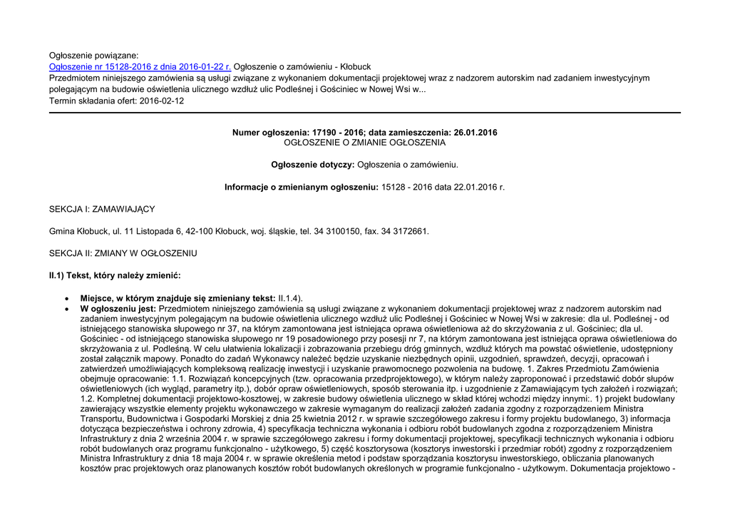 Ogłoszenie powiązane: Ogłoszenie nr 15128-2016 z dnia 2016-01-22 r. Ogłoszenie o zamówieniu - Kłobuck Przedmiotem niniejszego zamówienia są usługi związane z wykonaniem dokumentacji projektowej wraz z nadzorem autorskim nad zadaniem inwestycyjnym polegającym na budowie oświetlenia ulicznego wzdłuż ulic Podleśnej i Gościniec w Nowej Wsi w... Termin składania ofert: 2016-02-12 Numer ogłoszenia: 17190 - 2016; data zamieszczenia: 26.01.2016 OGŁOSZENIE O ZMIANIE OGŁOSZENIA Ogłoszenie dotyczy: Ogłoszenia o zamówieniu. Informacje o zmienianym ogłoszeniu: 15128 - 2016 data 22.01.2016 r. SEKCJA I: ZAMAWIAJĄCY Gmina Kłobuck, ul. 11 Listopada 6, 42-100 Kłobuck, woj. śląskie, tel. 34 3100150, fax. 34 3172661. SEKCJA II: ZMIANY W OGŁOSZENIU II.1) Tekst, który należy zmienić: Miejsce, w którym znajduje się zmieniany tekst: II.1.4). W ogłoszeniu jest: Przedmiotem niniejszego zamówienia są usługi związane z wykonaniem dokumentacji projektowej wraz z nadzorem autorskim nad zadaniem inwestycyjnym polegającym na budowie oświetlenia ulicznego wzdłuż ulic Podleśnej i Gościniec w Nowej Wsi w zakresie: dla ul. Podleśnej - od istniejącego stanowiska słupowego nr 37, na którym zamontowana jest istniejąca oprawa oświetleniowa aż do skrzyżowania z ul. Gościniec; dla ul. Gościniec - od istniejącego stanowiska słupowego nr 19 posadowionego przy posesji nr 7, na którym zamontowana jest istniejąca oprawa oświetleniowa do skrzyżowania z ul. Podleśną. W celu ułatwienia lokalizacji i zobrazowania przebiegu dróg gminnych, wzdłuż których ma powstać oświetlenie, udostępniony został załącznik mapowy. Ponadto do zadań Wykonawcy należeć będzie uzyskanie niezbędnych opinii, uzgodnień, sprawdzeń, decyzji, opracowań i zatwierdzeń umożliwiających kompleksową realizację inwestycji i uzyskanie prawomocnego pozwolenia na budowę. 1. Zakres Przedmiotu Zamówienia obejmuje opracowanie: 1.1. Rozwiązań koncepcyjnych (tzw. opracowania przedprojektowego), w którym należy zaproponować i przedstawić dobór słupów oświetleniowych (ich wygląd, parametry itp.), dobór opraw oświetleniowych, sposób sterowania itp. i uzgodnienie z Zamawiającym tych założeń i rozwiązań; 1.2. Kompletnej dokumentacji projektowo-kosztowej, w zakresie budowy oświetlenia ulicznego w skład której wchodzi między innymi:. 1) projekt budowlany zawierający wszystkie elementy projektu wykonawczego w zakresie wymaganym do realizacji założeń zadania zgodny z rozporządzeniem Ministra Transportu, Budownictwa i Gospodarki Morskiej z dnia 25 kwietnia 2012 r. w sprawie szczegółowego zakresu i formy projektu budowlanego, 3) informacja dotycząca bezpieczeństwa i ochrony zdrowia, 4) specyfikacja techniczna wykonania i odbioru robót budowlanych zgodna z rozporządzeniem Ministra Infrastruktury z dnia 2 września 2004 r. w sprawie szczegółowego zakresu i formy dokumentacji projektowej, specyfikacji technicznych wykonania i odbioru robót budowlanych oraz programu funkcjonalno - użytkowego, 5) część kosztorysowa (kosztorys inwestorski i przedmiar robót) zgodny z rozporządzeniem Ministra Infrastruktury z dnia 18 maja 2004 r. w sprawie określenia metod i podstaw sporządzania kosztorysu inwestorskiego, obliczania planowanych kosztów prac projektowych oraz planowanych kosztów robót budowlanych określonych w programie funkcjonalno - użytkowym. Dokumentacja projektowo - kosztorysowa zgodnie z art. 29 ustawy z dnia 29 stycznia 2004 r. - Prawo zamówień publicznych nie może zawierać założeń wskazujących znaki towarowe, patenty lub pochodzenie, chyba że jest to uzasadnione specyfiką przedmiotu zamówienia i zamawiający nie może opisać zamówienia za pomocą dostatecznie dokładnych określeń, a wskazaniu takiemu towarzyszą wyrazy lub równoważny, 6) inne opracowania niezbędne do uzyskania przez Zamawiającego pozwolenia na budowę oraz pozwolenia na użytkowanie obiektu, 7) ilość egzemplarzy dokumentacji projektowej także jej wersji określa załącznik nr 9 do SIWZ - wzór umowy. 1.3. Przedmiot zamówienia obejmuje ponadto: 1) wykonanie mapy syt.- wys. w skali 1:500 z aktualizacją do celów projektowych, 2) określenie numerów działek objętych zakresem projektowania, 3) przygotowanie i złożenie kompletnego wniosku dla uzyskania decyzji o ustaleniu lokalizacji inwestycji celu publicznego, 4) uzyskanie z zakładu energetycznego warunków przyłączenia do sieci, 5) uzyskanie od właściciela terenu oświadczenia o prawie dysponowania nieruchomościami na cele budowy, 7) przeniesienie na Zamawiającego praw autorskich majątkowych do wykonanej dokumentacji projektowej w zakresie objętym umową, 8) sprawowanie nadzoru autorskiego w trakcie realizacji inwestycji w rozumieniu art. 20 ust 1 pkt 4 ustawy Prawo budowlane (na podstawie dokumentacji projektowej objętej przedmiotem umowy). a) nadzór autorski ma charakter opcjonalny, b) nadzór autorski będzie pełniony na pisemny wniosek Zamawiającego, a Wykonawca jest zobowiązany się do jego pełnienia przez cały okres wykonywania robót budowlanych realizowanych w oparciu o dokumentację projektową i STWiORB, aż do końcowego odbioru wszystkich robót, c) w razie skorzystania z prawa opcji nadzoru autorskiego Zamawiający zakłada 5 planowanych pobytów na budowie oraz 3 nadzory rysunkowe. 9) ustalenie właścicieli (władających, zarządców) działek, w oparciu o informacje uzyskane od Wykonawcy (ust.3.4 pkt 2), według stanu z ewidencji gruntów i budynków, będzie należało do Zamawiającego. 1.4. Wykonawca zobowiązany jest wykonać przedmiot zamówienia z zachowaniem szczególnej staranności wymaganej od profesjonalisty, zgodnie z zasadami wiedzy technicznej, obowiązującymi przepisami prawa, w szczególności zgodnie z: 1) ustawą z dnia 7 lipca 1994 r. - Prawo budowlane, 2) rozporządzeniem Ministra Transportu, Budownictwa i Gospodarki Morskiej z dnia 25 kwietnia 2012 r. w sp