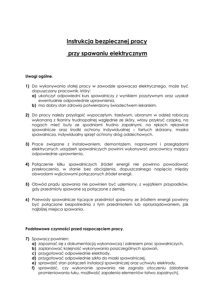 Instrukcja bezpiecznej pracy przy spawaniu elektrycznym Uwagi ogólne. 1) Do wykonywania stałej pracy w zawodzie spawacza elektrycznego, może być dopuszczony pracownik, który: a) ukończył odpowiedni kurs spawalniczy z wynikiem pozytywnym oraz uzyskał ewentualnie odpowiednie uprawnienia, b) ma dobry stan zdrowia potwierdzony świadectwem lekarskim. 2) Do pracy należy przystąpić wypoczętym, trzeźwym, ubranym w odzież roboczą wykonaną z tkaniny trudnopalnej względnie ze skóry, włosy przykryć czapką, na nogach mieć buty ze spodniami trudno zapalnymi, na rękach rękawice spawalnicze oraz środki ochrony indywidualnej – fartuch skórzany, maska spawalnicza, indywidualny sprzęt ochrony dróg oddechowych. 3) Prace związane z instalowaniem, demontażem, naprawami i przeglądami elektrycznych urządzeń spawalniczych powinni wykonywać pracownicy mający odpowiednie uprawnienia. 4) Połączenie kilku spawalniczych źródeł energii nie powinno powodować przekroczenia, w stanie bez obciążenia, dopuszczalnego napięcia między obwodami wyjściowymi połączonych źródeł energii. 5) Obwód prądu spawania nie powinien być uziemiony, z wyjątkiem przypadków, gdy przedmioty spawane są połączone z ziemią. 6) Przewody spawalnicze łączące przedmiot spawany ze źródłem energii powinny być połączone bezpośrednio z tym przedmiotem lub oprzyrządowaniem, jak najbliżej miejsca spawania. Podstawowe czynności przed rozpoczęciem pracy. 7) Spawacz powinien: a) zapoznać się z dokumentacją wykonawczą i zakresem prac spawalniczych, b) zaplanować kolejność wykonywania poszczególnych spawań, c) przygotować odpowiednie elektrody, d) przygotować odpowiednie szkła do maski spawalniczej, e) sprawdzić stan połączeń instalacji spawalniczej oraz uchwytu elektrody, f) sprawdzić, czy wykonanie spawania nie zagraża otoczeniu (działanie promieniowania łuku, możliwość zapalenia elementów łatwo zapalnych), g) sprawdzić, czy w przypadku spawania na ścianie, po drugiej stronie nie może nastąpić zapalenie, h) wszelkie zauważone nieprawidłowości zgłosić natychmiast przełożonemu w celu ich usunięcia, i) zapewnić bezpieczeństwo p. pożarowe. Czynności podczas spawania 8) Zabezpieczyć stanowisko pracy, o ile nie ma stałych, ruchomymi ekranami przeciwodblaskowymi i przeciwodpryskowymi. 9) Używać do spawania przewodów elektrycznych i uchwytu do elektrody tylko w dobrym stanie technicznym (nieuszkodzona izolacja). 10) Stosować tylko właściwe grubości elektrod do spawania. 11) Mocować i ustawiać rzetelnie i solidnie spawany przedmiot i tak, aby nie uległ on uszkodzeniu. 12) Ustawić detale do spawania w taki sposób, aby uniemożliwić ich przesuniecie lub przewrócenie się. Przy odbijaniu żużla używać młotków igłowych i okularów ochronnych. 13) Przy spawaniu wewnątrz kotłów, zbiorników lub w ciasnych pomieszczeniach niezależnie od stosowanej wentylacji, używać ochron dróg oddechowych. 14) Przy pracy wewnątrz zbiorników, kotłów i innych metalowych pomieszczeń, stosować oświetlenie elektryczne na napięcie 24V. 15) Upewnić się, czy element spawany nie grozi upadkiem lub odsunięciem się niebezpiecznym dla pracownika. 16) Przy spawaniu na rusztowaniach sprawdzić stan ich sprawności. 17) Ochronić drogi oddechowe, oczy, twarz i ręce przed poparzeniem i naświetleniem poprzez stosowanie odpowiednich środków ochrony indywidualnej. 18) Włączyć indywidualny wyciąg powietrza, jeżeli taki jest założony, aby wyziewy gazowe były usuwane ze stanowiska. 19) Używać tylko właściwych, nie uszkodzonych i nie zaoliwionych narzędzi i pomocy warsztatowych. 20) Każdą powierzoną pracę wykonywać dokładnie, zgodnie z obowiązującym procesem technologicznym i wg wskazówek zwierzchnika. 21) Każdy wypadek przy pracy zgłaszać swojemu przełożonemu, a stanowisko pracy pozostawić w takim stanie, w jakim zdarzył się wypadek. Czynności zabronione. 22) Spawaczowi zabrania się: a) chwytania gorącego metalu przygotowanego do spawania lub po spawaniu, b) samodzielnie naprawiać uszkodzone przewody elektryczne (instalację elektryczną), c) w czasie przerw w pracy trzymać pod pachą uchwyt do elektrody, d) odsuwania maski spawalniczej zbyt daleko od twarzy, odkładania jej przed zgaśnięciem łuku, a także zapalenie łuku bez zabezpieczenia twarzy, e) spawania bez prawidłowego uziemienia elementu spawanego, f) stosować prowizoryczne połączenie urządzeń spawalniczych, g) powodować, aby podłoga na stanowisku roboczym była mokra, śliska, nierówna, zanieczyszczona śmieciami, zatarasowana. Podstawowe czynności po zakończeniu pracy. 23) Spawacz powinien: a) wyłączyć spawarkę spod napięcia, b) sprawdzić, czy podczas spawania na stanowisku lub obok stanowiska nie został zaprószony ogień, c) uporządkować stanowisko pracy, usunąć końcówki elektrod oraz żużel spawalniczy. Uwagi końcowe. 1) Podczas wykonywania prac spawalniczych wewnątrz zbiorników, kotłów lub innych pomieszczeń zamkniętych (do 15m3), spawacz powinien być ubezpieczony przez innego pracownika, przebywającego na zewnątrz. 2) W razie wątpliwości co do bezpieczeństwa przy wykonywaniu powierzonej pracy, pracownik ma prawo przerwać pracę i zwrócić się do przełożonego o wyjaśnienie sytuacji.