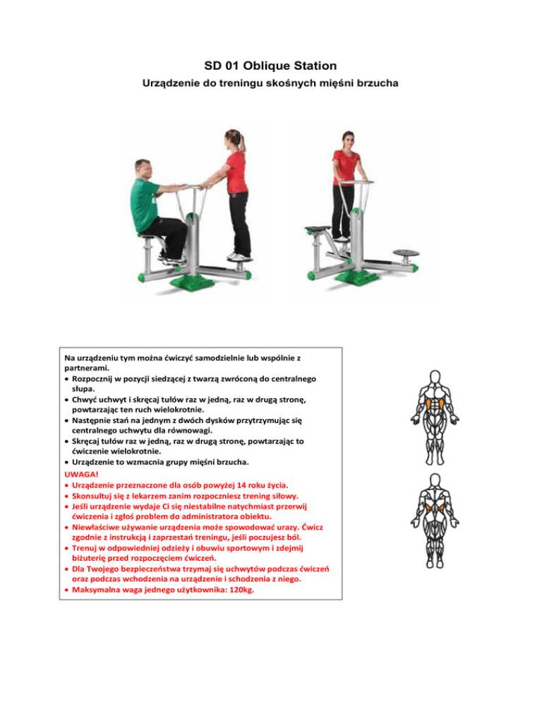 SD 01 Oblique Station Urządzenie do treningu skośnych mięśni brzucha Na urządzeniu tym można ćwiczyć samodzielnie lub wspólnie z partnerami. Rozpocznij w pozycji siedzącej z twarzą zwróconą do centralnego słupa. Chwyć uchwyt i skręcaj tułów raz w jedną, raz w drugą stronę, powtarzając ten ruch wielokrotnie. Następnie stań na jednym z dwóch dysków przytrzymując się centralnego uchwytu dla równowagi. Skręcaj tułów raz w jedną, raz w drugą stronę, powtarzając to ćwiczenie wielokrotnie. Urządzenie to wzmacnia grupy mięśni brzucha. UWAGA! Urządzenie przeznaczone dla osób powyżej 14 roku życia. Skonsultuj się z lekarzem zanim rozpoczniesz trening siłowy. Jeśli urządzenie wydaje Ci się niestabilne natychmiast przerwij ćwiczenia i zgłoś problem do administratora obiektu. Niewłaściwe używanie urządzenia może spowodować urazy. Ćwicz zgodnie z instrukcją i zaprzestań treningu, jeśli poczujesz ból. Trenuj w odpowiedniej odzieży i obuwiu sportowym i zdejmij biżuterię przed rozpoczęciem ćwiczeń. Dla Twojego bezpieczeństwa trzymaj się uchwytów podczas ćwiczeń oraz podczas wchodzenia na urządzenie i schodzenia z niego. Maksymalna waga jednego użytkownika: 120kg. SD 02Stepper Bike Station Urządzenie treningowe z rowerem i stepperem Na urządzeniu tym można ćwiczyć samodzielnie lub z partnerem. Rozpocznij trening w pozycji siedzącej na siodełku rowerowym, z twarzą zwróconą do centralnego słupa. Chwyć dłońmi uchwyt i rozpocznij pedałowanie. Następnie umieść stopy na podpórkach dla stóp steppera, przytrzymując centralny uchwyt dla równowagi. Naciskaj naprzemiennie raz jeden, raz drugi step powtarzając ćwiczenie wielokrotnie. Urządzenie to wzmacnia mięśnie nóg i bioder. UWAGA! Urządzenie przeznaczone dla osób powyżej 14 roku życia. Skonsultuj się z lekarzem zanim rozpoczniesz trening siłowy. Jeśli urządzenie wydaje Ci się niestabilne natychmiast przerwij ćwiczenia i zgłoś problem do administratora obiektu. Niewłaściwe używanie urządzenia może spowodować urazy. Ćwicz zgodnie z instrukcją i zaprzestań treningu, jeśli poczujesz ból. Trenuj w odpowiedniej odzieży i obuwiu sportowym i zdejmij biżuterię przed rozpoczęciem ćwiczeń. Dla Twojego bezpieczeństwa trzymaj się uchwytów podczas ćwiczeń oraz podczas wchodzenia na urządzenie i schodzenia z niego. Maksymalna waga jednego użytkownika: 120kg. SD 03 Tri Fitness Station Urządzenie o potrójnej funkcji treningowej Na urządzeniu tym można ćwiczyć samodzielnie lub wspólnie z partnerami. Rozpocznij na stanowisku z drążkami do ściągania, zasiadając na siedzisku z twarzą zwróconą w kierunku przeciwnym do centralnego słupa. Umieść stopy wygodnie na podłożu i ściągaj w dół drążki umieszczone nad głową, powtarzając ten ruch wielokrotnie. Ćwiczenie to wzmacnia mięśnie ramion i pleców. Następnie usiądź na stanowisku do treningu mięśni nóg i prostuj nogi unosząc pałąk. Powtarzaj ćwiczenie wielokrotnie. Ćwiczenie to wzmacnia mięśnie ud. Na zakończenie przejdź na stanowisko do treningu mięśni brzucha i umieść przedramiona na podłokietnikach. Unoś nogi do góry wielokrotnie, aby wzmocnić mięśnie brzucha. UWAGA! Urządzenie przeznaczone dla osób powyżej 14 roku życia. Skonsultuj się z lekarzem zanim rozpoczniesz trening siłowy. Jeśli urządzenie wydaje Ci się niestabilne natychmiast przerwij ćwiczenia i zgłoś problem do administratora obiektu. Niewłaściwe używanie urządzenia może spowodować urazy. Ćwicz zgodnie z instrukcją i zaprzestań treningu, jeśli poczujesz ból. Trenuj w odpowiedniej odzieży i obuwiu sportowym i zdejmij biżuterię przed rozpoczęciem ćwiczeń. Dla Twojego bezpieczeństwa trzymaj się uchwytów podczas ćwiczeń oraz podczas wchodzenia na urządzenie i schodzenia z niego. Maksymalna waga jednego użytkownika: 120kg. SD09 Dual Air Walker Podwójny biegacz Na urządzeniu tym można ćwiczyć samodzielnie lub z partnerem. Umieść stopy na podpórkach i schwyć dłońmi uchwyty. Zacznij trening wymachując posuwistym ruchem stopami i rękami jednocześnie. Ćwiczenie to pozwala rozwijać mięśnie przedramion, ramion, pleców i ud. UWAGA! Urządzenie przeznaczone dla osób powyżej 14 roku życia. Skonsultuj się z lekarzem zanim rozpoczniesz trening siłowy. Jeśli urządzenie wydaje Ci się niestabilne natychmiast przerwij ćwiczenia i zgłoś problem do administratora obiektu. Niewłaściwe używanie urządzenia może spowodować urazy. Ćwicz zgodnie z instrukcją i zaprzestań treningu, jeśli poczujesz ból. Trenuj w odpowiedniej odzieży i obuwiu sportowym i zdejmij biżuterię przed rozpoczęciem ćwiczeń. Dla Twojego bezpieczeństwa trzymaj się uchwytów podczas ćwiczeń oraz podczas wchodzenia na urządzenie i schodzenia z niego. Maksymalna waga jednego użytkownika: 120kg.