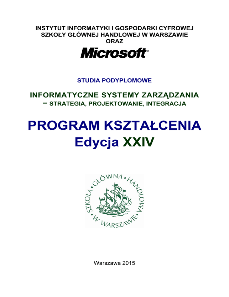 INSTYTUT INFORMATYKI I GOSPODARKI CYFROWEJ SZKOŁY GŁÓWNEJ HANDLOWEJ W WARSZAWIE ORAZ STUDIA PODYPLOMOWE INFORMATYCZNE SYSTEMY ZARZĄDZANIA − STRATEGIA, PROJEKTOWANIE, INTEGRACJA PROGRAM KSZTAŁCENIA Edycja XXIV Warszawa 2015 2 I. Cel i zakres tematyczny Celem edukacji jest przekazanie słuchaczom wiedzy teoretycznej oraz doświadczeń z praktyki gospodarczej z zakresu metodyki budowy, wdrażania i rozwoju zintegrowanych systemów informatycznych wspomagających kompleksowe zarządzanie przedsiębiorstwem. II. Wykładowcy Zajęcia prowadzą praktycy z doświadczeniem dydaktycznym, co pozwoli na zachowanie właściwych relacji pomiędzy teorią, a praktyką gospodarczą. III. Adresaci Studia przeznaczone są dla osób, które pracują lub też zamierzają podjąć pracę w zawodzie: Menedżera działu IT, Kierownika Projektu, Konsultanta ds. wdrożeń systemów zintegrowanych, Analityka, Specjalisty w zakresie projektowania baz danych oraz aplikacji analitycznych, Audytora Projektu. Program studiów stanowi również kompleksową ofertę edukacyjną dla osób, które zamierzają dopiero rozpocząć pracę w branży IT. Od uczestników nie jest wymagana wcześniejsza znajomość zagadnień budowy i wdrażania systemów informatycznych oraz tematyki baz i hurtowni danych. Statystyki ubiegłych lat dowodzą, że nasze studia podyplomowe wybierają przede wszystkim osoby z wykształceniem wyższym ekonomicznym (około 40% Słuchaczy) oraz technicznym, ale nie informatycznym (około 30% Słuchaczy). Praktycznie, od Kandydatów oczekujemy umiejętności pracy w środowisku Windows oraz znajomości aplikacji pakietu MS Office (MS Word, MS Excel, MS Power Point). Na studia podyplomowe zgłaszają się również osoby pracujące w branży informatycznej lub posiadające wcześniejsze doświadczenia w projektowaniu i wdrażaniu systemów informatycznych (około 20-25% Słuchaczy). Wychodząc naprzeciw ich oczekiwaniom, w ramach danej edycji studiów podyplomowych, organizowane są specjalne grupy ćwiczeniowe i laboratoryjne (80% zajęć SPISZ stanowią ćwiczenia projektowe i laboratoria komputerowe), co sprzyja indywidualizacji nauczania oraz gwarantuje odpowiedni poziom zajęć. IV. Czesne Opłata za całość studiów podyplomowych „Informatyczne Systemy Zarządzania” Edycja XXIV wynosi 6 700 zł − wpłata jednorazowa. Proponujemy również dwa warianty płatności ratalnych: − Wariant I. Pierwsza rata w wysokości 3 300 zł płatna przy zapisie. Druga rata w wysokości 3 400 zł płatna nie później niż do dnia 18 października 2015, czyli jeszcze przed rozpoczęciem zajęć SPISZ. − Wariant II. Pierwsza rata w wysokości 3 300 zł płatna przy zapisie. Druga rata w wysokości 3 500 zł płatna nie później niż do dnia 24 stycznia 2016. Kandydat dokonuje opłaty za studia na konto indywidualne, które zostanie automatycznie wygenerowane w Informatycznym Systemie Studiów Podyplomowych SGH. Wszelkie prawa zastrzeżone Kopiowanie i rozpowszechnianie w formie drukowanej lub elektronicznej całości lub fragmentów niniejszego opracowania zabronione 3 V. Rekrutacja Rekrutacja Kandydatów na studia podyplomowe jest otwarta i odbywa się na zasadzie kolejności zgłoszeń. Etap 1: REJESTRACJA. Kandydat rejestruje się na studia korzystając z Informatycznego Systemu Studiów Podyplomowych (ISSP) SGH znajdującego się pod adresem: www.podyplomowe-rejestracja.sgh.waw.pl. W trakcie procesu rejestracji należy: wprowadzić dane personalne oraz wypełnić ankietę dotyczącą źródeł pozyskiwania informacji o studiach podyplomowych SGH, a także załączyć kopię dokumentów: 1) zdjęcie; 2) odpis dyplomu ukończenia Uczelni Wyższej (dyplomu licencjata, inżyniera, magistra lub magistra inżyniera); 3) Curriculum Vitae (CV). 1. Etap 2: OPŁATA ZA STUDIA. Kandydat dokonuje opłaty za studia (lub odpowiedniej raty) na konto indywidualne, które zostanie wygenerowane w Informatycznym Systemie Studiów Podyplomowych SGH. Numer konta widoczny jest dla kandydata (po wprowadzeniu danych personalnych) w zakładce Dokumenty, sekcja: Płatności. Kandydat nie załącza do systemu informatycznego kopii potwierdzenia wpłaty (wpłaty te są automatycznie importowane z systemu bankowego). Rejestracja w Informatycznym Systemie Studiów Podyplomowych SGH, oraz wniesienie opłaty za studia (lub odpowiedniej raty) są równoważne z przyjęciem. 2. Etap 3: DOKUMENTY REKRUTACYJNE. Kandydat składa w oryginale komplet dokumentów rekrutacyjnych: − Formularz aplikacyjny (wygenerowany w Informatycznym Systemie Studiów Podyplomowych). − Odpis dyplomu potwierdzającego ukończenie studiów, co najmniej pierwszego stopnia. − Curriculum Vitae (CV), − 1 fotografia. Zdjęcie musi spełniać wymagania stawiane fotografii jak do dowodu osobistego: wyraźna fotografia o wymiarach 35 x 45 mm, odzwierciedlająca aktualny wizerunek osoby, przedstawiająca tę osobę bez nakrycia głowy i okularów z ciemnymi szkłami w taki sposób, aby ukazywała głowę w pozycji lewego półprofilu i z widocznym lewym uchem, z zachowaniem równomiernego oświetlenia twarzy. Dokumenty rekrutacyjne (oryginał) należy przesłać drogą pocztową na adres: mgr Inga Moczulska Szkoła Główna Handlowa w Warszawie Instytut Informatyki i Gospodarki Cyfrowej ul. Madalińskiego 6/8; 02-513 Warszawa lub też złożyć osobiście: Instytut Informatyki i Gospodarki Cyfrowej ul. Madalińskiego 6/8; pokój 239, II p WTORKI w godz. 15.00 – 17.00 Wszelkie prawa zastrzeżone Kopiowanie i rozpowszechnianie w formie drukowanej lub elektronicznej całości lub fragmentów niniejszego opracowania zabronione 4 VI. Organizacja kształcenia Program kształcenia obejmuje swoim zakresem wykłady, ćwiczenia, laboratoria komputerowe prowadzone w układzie dwudniowych, sobotnio-niedzielnych zjazdów. Semestr I (Wykłady i Ćwiczenia projektowe) 24-25 październik 2015 1. 14-15 listopad 2015 2. 28-29 listopad 2015 3. 12-13 grudzień 2015 4. 16-