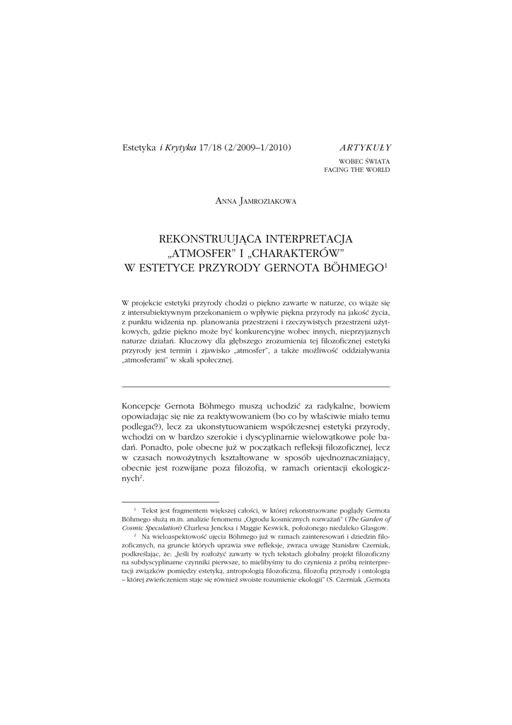 Estetyka i Krytyka 17/18 (2/2009–1/2010) AR TY KU Ł Y WOBEC ŚWIATA FACING THE WORLD ANNA JAMROZIAKOWA REKONSTRUUJĄCA INTERPRETACJA „ATMOSFER” I „CHARAKTERÓW” W ESTETYCE PRZYRODY GERNOTA BÖHMEGO1 W projekcie estetyki przyrody chodzi o piękno zawarte w naturze, co wiąże się z intersubiektywnym przekonaniem o wpływie piękna przyrody na jakość życia, z punktu widzenia np. planowania przestrzeni i rzeczywistych przestrzeni użytkowych, gdzie piękno może być konkurencyjne wobec innych, nieprzyjaznych naturze działań. Kluczowy dla głębszego zrozumienia tej filozoficznej estetyki przyrody jest termin i zjawisko „atmosfer”, a także możliwość oddziaływania „atmosferami” w skali społecznej. Koncepcje Gernota Böhmego muszą uchodzić za radykalne, bowiem opowiadając się nie za reaktywowaniem (bo co by właściwie miało temu podlegać?), lecz za ukonstytuowaniem współczesnej estetyki przyrody, wchodzi on w bardzo szerokie i dyscyplinarnie wielowątkowe pole badań. Ponadto, pole obecne już w początkach refleksji filozoficznej, lecz w czasach nowożytnych kształtowane w sposób ujednoznaczniający, obecnie jest rozwijane poza filozofią, w ramach orientacji ekologicznych2. 1 Tekst jest fragmentem większej całości, w której rekonstruowane poglądy Gernota Böhmego służą m.in. analizie fenomenu „Ogrodu kosmicznych rozważań” (The Garden of Cosmic Speculation) Charlesa Jencksa i Maggie Keswick, położonego niedaleko Glasgow. 2 Na wieloaspektowość ujęcia Böhmego już w ramach zainteresowań i dziedzin filozoficznych, na gruncie których uprawia swe refleksje, zwraca uwagę Stanisław Czerniak, podkreślając, że: „Jeśli by rozłożyć zawarty w tych tekstach globalny projekt filozoficzny na subdyscyplinarne czynniki pierwsze, to mielibyśmy tu do czynienia z próbą reinterpretacji związków pomiędzy estetyką, antropologią filozoficzną, filozofią przyrody i ontologią – której zwieńczeniem staje się również swoiste rozumienie ekologii” (S. Czerniak „Gernota 140 Anna Jamroziakowa Böhme traktuje estetykę jako część nowej filozofii przyrody, sytuując ją wobec problematyki środowiska naturalnego i faktu, że człowiek sam jest przyrodą i nie gdzieś indziej, lecz w niej egzystuje. Zadaniem, jakie sobie stawia to wkroczenie na pole estetyki, jednakże przyświeca mu spojrzenie na estetykę przez pryzmat rozszerzonej ekologii. Jest to zupełnie inna perspektywa niż upowszechnione w tradycyjnej estetyce podejście. Nie może ujść uwagi estetyka, że Böhme orientuje się przede wszystkim na kryzysową sytuację, którą sygnalizują ruchy ekologiczne i po pierwsze, zwraca uwagę na niszczący stosunek, jaki ma wobec przyrody współczesna gospodarka, technika, a także współczesne przyrodoznawstwo3. Łączy się z tym, po drugie: przeniesienie tej destrukcyjności w obszar myślenia o ludzkim ciele i praktykach z tym związanych. Nowa filozofia przyrody – deklaruje filozof – podjąć może krytykę klasycznej estetyki, na której bardzo mocno zaciążyło to, że chociaż będąc względnie samodzielną dziedziną badań, była jednak odbiciem wyobcowania z przyrody. Jednakże związek nowej filozofii przyrody i estetyki jest głębszy, ponieważ z racji zmian w środowisku naturalBöhmego antropologizacja estetyki” w: G. Böhme Filozofia i estetyka przyrody J. Merecki (tł.) Oficyna Naukowa, Warszawa 2002 s. XI). 3 Z uwagą, ale i prawdziwą pasją, podchodzi Böhme do aporetycznych zaniedbań, na jakich opiera się współczesne przyrodoznawstwo. Zauważa, że już sam problem związany z pytaniem, czym jest natura (wobec wyróżniania nadal „natury zewnętrznej”), każe powątpiewać w istnienie nauki o przyrodzie, starań by określać jej przedmiot i przyświecający cel poznawczy. „Zwłaszcza dzisiaj, kiedy po długiej drodze do matek, tj. elementarnych praw, przyrodoznawstwo coraz częściej zwraca się ku fenomenom i faktycznej naturze, fraktalowym powierzchniom, turbulencjom ognia, staje się jasne, że to właśnie zostało zaniedbane w jej wielkim, zwycięskim pochodzie od Galileusza do Einsteina”. O ile w trzech pierwszych stuleciach przyrodoznawstwo nie zajmowało się przyrodą, lecz projektowało zakres jej możliwości i stąd też bliski związek tego myślenia z techniką, o tyle można powiedzieć, że niejako konsekwencją tego są współczesne wątpliwości co do trafności nazwy „przyrodoznawstwo”, skoro przyroda odnosi się do tego, co dane – faktyczne. Jako nauka o tym, co dane, miałaby za przedmiot np. technikę i produkcję, ale także nasuwa się: „poznanie jako uznanie”, co łączyć się musi z pytaniem o orientację w ogóle istniejącym porządku. Można mieć w związku z tym wątpliwości, „czy na tego rodzaju poznanie przyrody nie jest już za późno?”. Problem jeszcze bardziej się komplikuje, jeśli za przedmiot badań wziąć tę część natury, którą jest ludzkie ciało. Naukowo-techniczna wiedza, dominująca we współczesnej medycynie redukuje ciało do organizmu, tj. natury zewnętrznej – czegoś przedmiotowego. Zdominowanie ludzkiej cielesności przez wiedzę naukową spowodowało brak jakiejkolwiek szerszej społecznej orientacji i „lekceważenie własnej cielesności (...). Człowiek nie zna własnego ciała, nie panuje nad nim i dlatego nazbyt łatwo ucieka się do możliwości manipulacji zewnętrznej”. Wnioski, jakie po kilku stronach rozważań Böhme wyprowadza, są bardzo radykalne: „Przyrodoznawstwo albo będzie musiało się zmienić przez to, że w przyszłości skupi się bardziej na konkretnej przyrodzie i swego ideału nie będzie widziało w technicznym wytwarzaniu swych przedmiotów, albo będzie musiało tolerować obok siebie inne nauki o przyrodzie. W medycynie to ostatnie wydaje się nieuniknione” (G. Böhme wyd. cyt. s. 91, 92, 98). Rekonstruująca interpretacja „atmosfer” i „charakterów”... 14