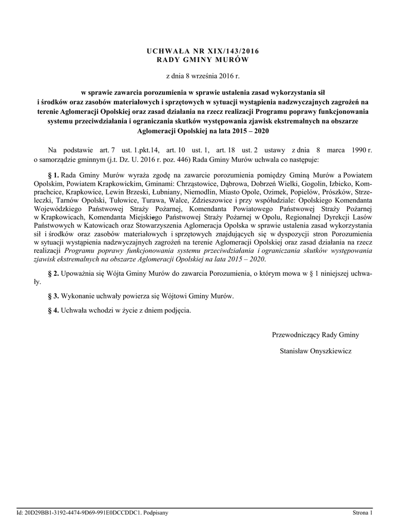 UCH WAŁA NR XI X/ 143/ 2016 RADY GMINY MUR Ó W z dnia 8 września 2016 r. w sprawie zawarcia porozumienia w sprawie ustalenia zasad wykorzystania sił i środków oraz zasobów materiałowych i sprzętowych w sytuacji wystąpienia nadzwyczajnych zagrożeń na terenie Aglomeracji Opolskiej oraz zasad działania na rzecz realizacji Programu poprawy funkcjonowania systemu przeciwdziałania i ograniczania skutków występowania zjawisk ekstremalnych na obszarze Aglomeracji Opolskiej na lata 2015 – 2020 Na podstawie art. 7 ust. 1.pkt.14, art. 10 ust. 1, art. 18 ust. 2 ustawy z dnia 8 marca 1990 r. o samorządzie gminnym (j.t. Dz. U. 2016 r. poz. 446) Rada Gminy Murów uchwala co następuje: § 1. Rada Gminy Murów wyraża zgodę na zawarcie porozumienia pomiędzy Gminą Murów a Powiatem Opolskim, Powiatem Krapkowickim, Gminami: Chrząstowice, Dąbrowa, Dobrzeń Wielki, Gogolin, Izbicko, Komprachcice, Krapkowice, Lewin Brzeski, Łubniany, Niemodlin, Miasto Opole, Ozimek, Popielów, Prószków, Strzeleczki, Tarnów Opolski, Tułowice, Turawa, Walce, Zdzieszowice i przy współudziale: Opolskiego Komendanta Wojewódzkiego Państwowej Straży Pożarnej, Komendanta Powiatowego Państwowej Straży Pożarnej w Krapkowicach, Komendanta Miejskiego Państwowej Straży Pożarnej w Opolu, Regionalnej Dyrekcji Lasów Państwowych w Katowicach oraz Stowarzyszenia Aglomeracja Opolska w sprawie ustalenia zasad wykorzystania sił i środków oraz zasobów materiałowych i sprzętowych znajdujących się w dyspozycji stron Porozumienia w sytuacji wystąpienia nadzwyczajnych zagrożeń na terenie Aglomeracji Opolskiej oraz zasad działania na rzecz realizacji Programu poprawy funkcjonowania systemu przeciwdziałania i ograniczania skutków występowania zjawisk ekstremalnych na obszarze Aglomeracji Opolskiej na lata 2015 – 2020. § 2. Upoważnia się Wójta Gminy Murów do zawarcia Porozumienia, o którym mowa w § 1 niniejszej uchwały. § 3. Wykonanie uchwały powierza się Wójtowi Gminy Murów. § 4. Uchwała wchodzi w życie z dniem podjęcia. Przewodniczący Rady Gminy Stanisław Onyszkiewicz Id: 20D29BB1-3192-4474-9D69-991E0DCCDDC1. Podpisany Strona 1